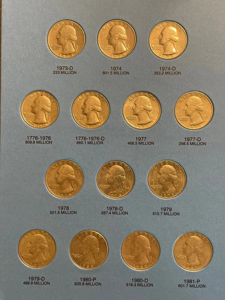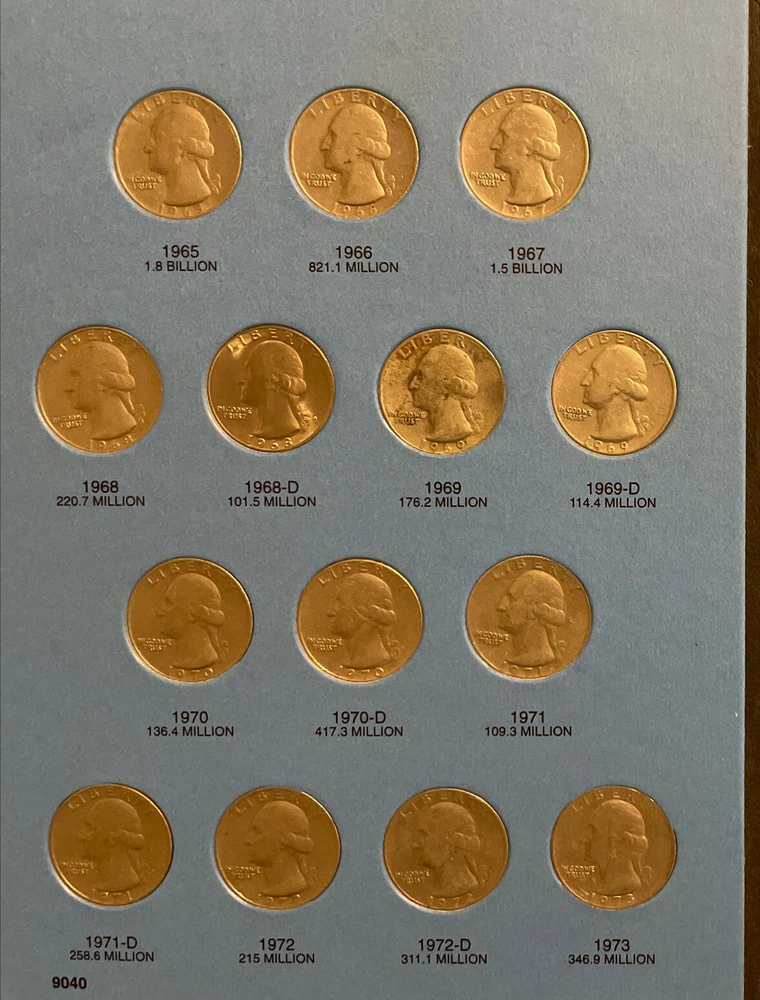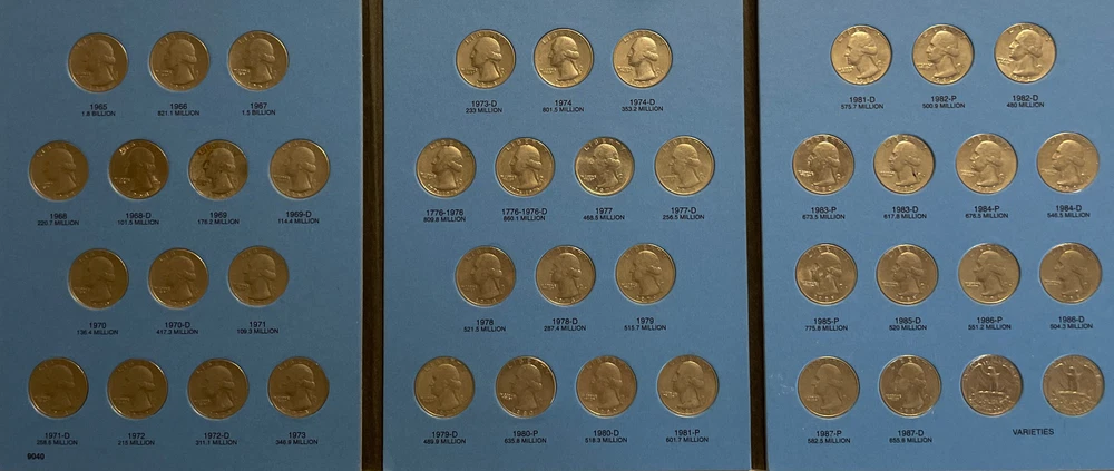 A nice circulated set and come in a Whitman album. 1965-1987 Washington Quarter set with Whitman folder includes 1982 1982 pd mints eBay Store Policies 1) PAYMENT - Please send payment within 7 days of the closing auction or item. 2) PURCHASES - If you're unhappy with your purchase, please contact us first so we can rectify the situation. We treat our customers with the up most respect. 3) QUESTIONS - Please ask! We try to take the best pictures to represent and item. With coins, grading is an art and we do our best to grade correctly. 4) PROMISE - Your satisfaction is guaranteed, and we offer a no questions asked return policy within 14 days of purchase. Please see our feedback, we are very easy to work with and contact us for any reason if you are not happy with any purchase. Thank you, Alan