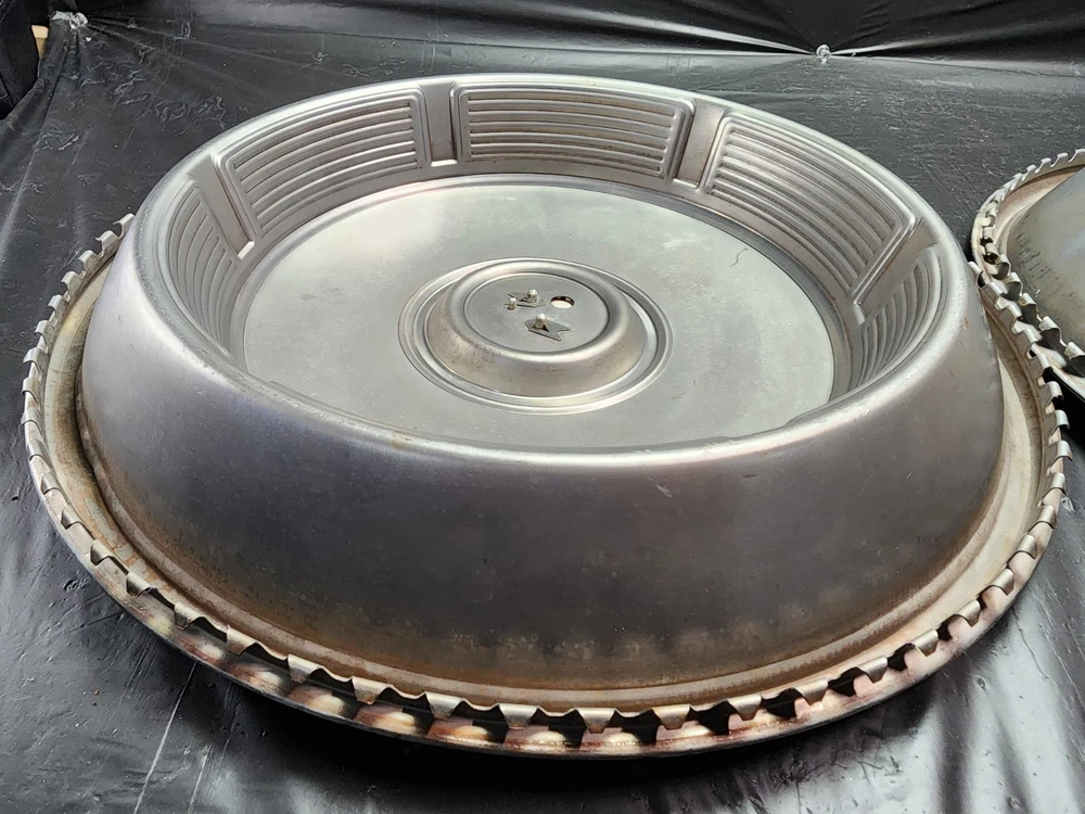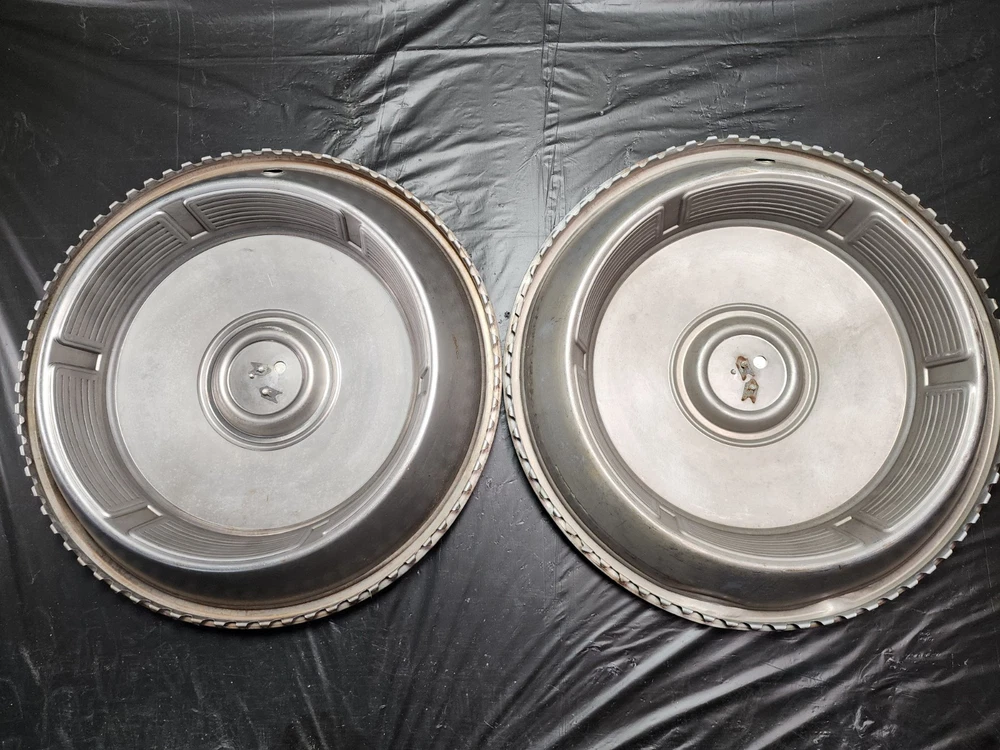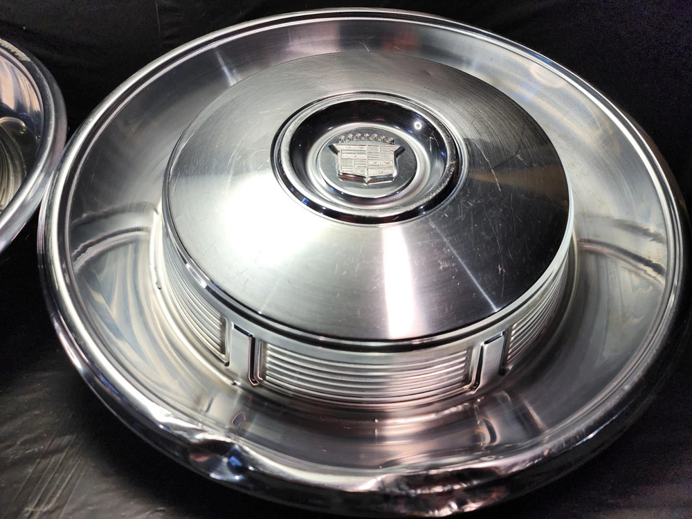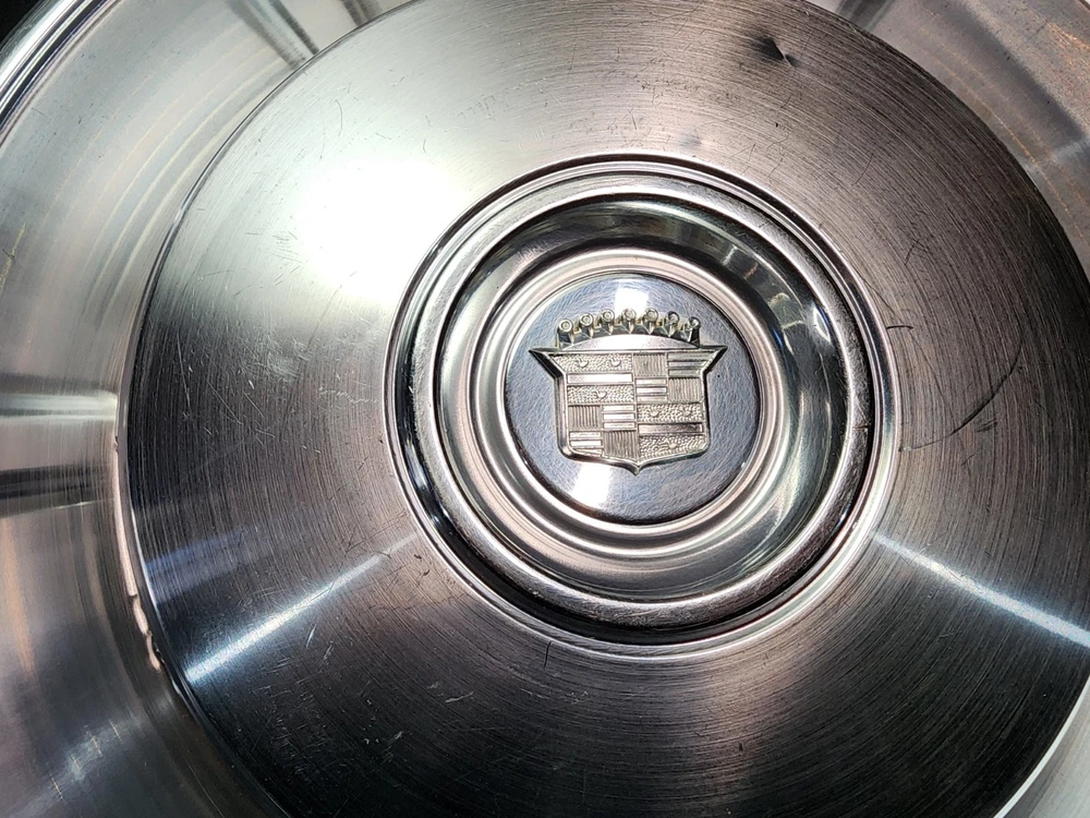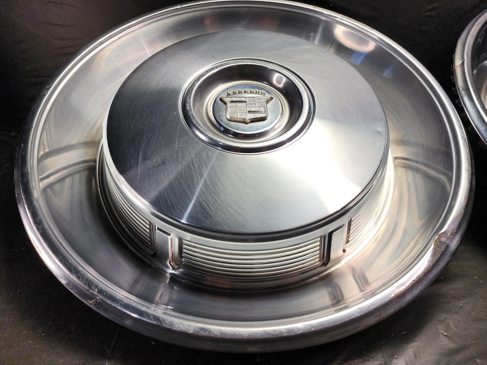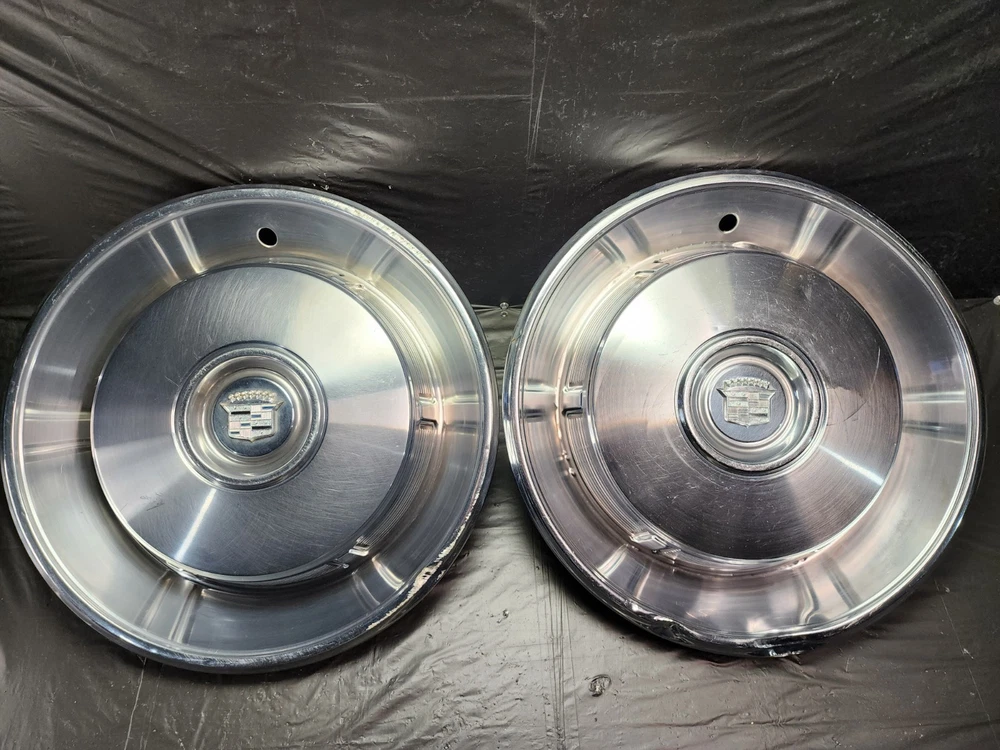 Vintage 40s 50s 60s 70s hub caps. 1966 1967 Cadillac pair of 2 Original OEM Factory OE hubcaps wheel covers center caps. in heavy use condition they have so.e deeper scratches and dings, would be great on a ratrod or as wall hangers. These are Used hubcaps off of old classic cars that were driven on the road and used, so please see photos for complete condition as they are not all perfect. Most have some fading, dings, scuffing, mineral staining, etc could use a good polishing to bring em back to full shine, but otherwise in beautiful condition. Check out more of my ebay page as we are going through and listing a ton of classic / vintage hubcaps from the the 20's 30's 40's 50's 60's 70's 80's 90's 00's and up. all different makes and models such as Ford Chevy Chevrolet GM Cadillac GMC camero nova Chevelle Nomad Bel Air Mercury Corvette Mustang Oldsmobile Pontiac Lincoln Dodge Plymouth Buick Chrysler Mopar Fairlane Volkswagen Cheiftain Challanger Charger 1500 4x4 muscle car hot rod rat rod Cars and Trucks 15in 14in 16in and so much more from full sets to sets of 2 and singles, you name it check us out!