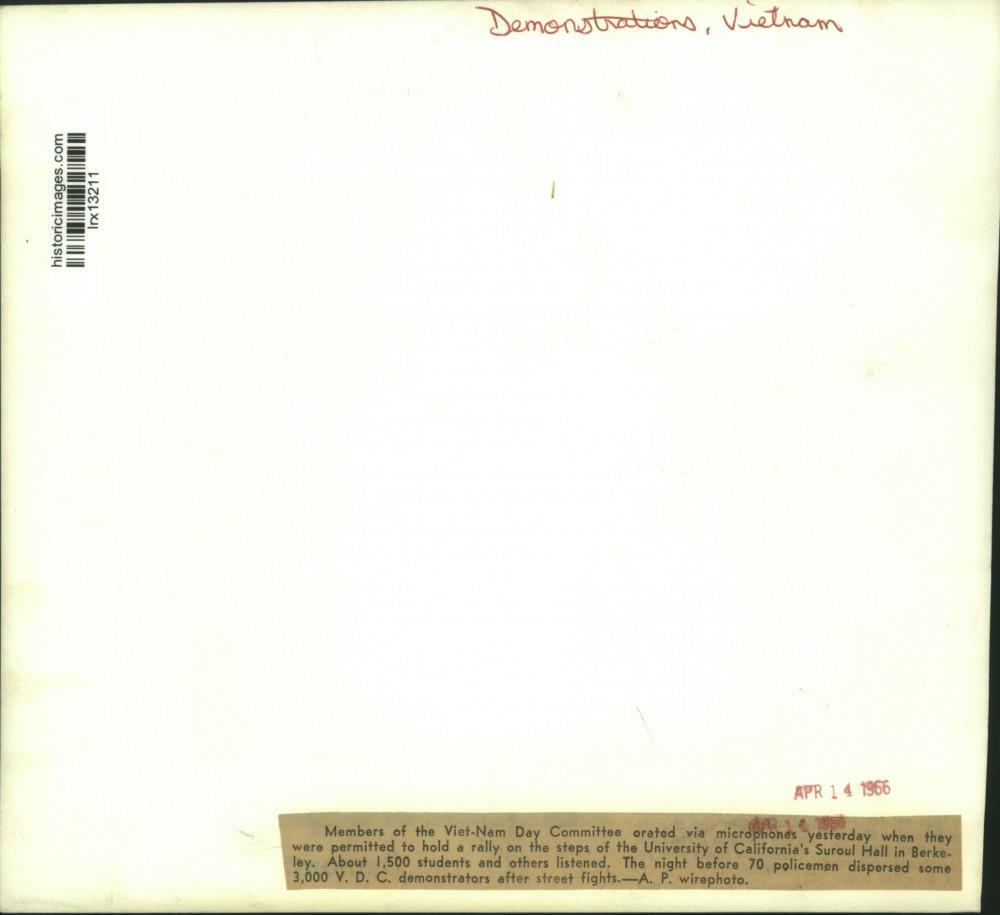 ebay template Note: Please study the images carefully to determine the condition of this vintage photograph, as it may not be in perfect condition. It may contain wrinkles, cracks, and possibly even tears due to its age and how it was handled before it got to us. A scanner may interpret colors and contrast differently than human eyes will, so it is possible that the actual photograph may be slightly darker or lighter in person. This vintage photograph is offered for sale as a collectible item and conveys no transfer of copyright. 1966 Press Photo Members of the Viet-Nam Day Committee permitted to hold a rally This is an original press photo. Members of the Viet-Nam Day Committee orated via microphones yesterday when they were permitted to hold a rally on the steps of the University of California's Suroul Hall in Berkeley. About 1,500 students and others listened. The night before policemen dispersed some 3,00 V.D.C. demonstrators after street fights. Photo measures 9 x 8.25 inches. Photo is dated 04-14-1966. PHOTO FRONT PHOTO BACK Historic Images Part Number: lrx13211 FAQs Q: Can I just download a digital version instead? A: No, we sell only vintage originals and do not make or distribute any copies, including digital ones. Q: Do you combine shipping and invoices? A: Multiple photos won on the same seller ID combine automatically through the eBay checkout process. If you encounter problems with this, send us a message via eBay messaging and we will send you an invoice. Due to eBay limitations, we cannot combine items won on our different seller IDs for a single shipping charge. Q: How quickly do you ship the items once paid? A: We ship within one business day after your payment clears. If you do not receive an "order shipped" email from us by the close of the second business day from submitting payment, please e-mail us via eBay messaging. Q: How do you make sure my photograph arrives safely? A: We package each order between two cross-corrugated pieces of cardboard to ensure that the package is as difficult to bend as possible. We then wrap each order in a plastic sheet to help protect against moisture. We want you to rest assured that we take every precaution to ensure that the photograph you receive will be in the same condition in your care as it was in ours. Q: Will the "Historic Images" watermark be on my photo when I receive it? A: No. This is a digital watermark we use to protect our images. It is not printed on the photo. Q: What are your office hours? A: eBay for us is a business, and a very fun one to be in! We are open M-F 9 to 5 (CST). Therefore, we do not return e-mails and phone calls over the weekend. We observe the following holidays: New Years Day, Memorial Day, Fourth of July, Labor Day, Thanksgiving and the day after Thanksgiving, Christmas Eve and Christmas Day. Q: Where did all these vintage photos come from? A: These original vintage photographs are from various news service and newspaper photo archives from locations around the country including: Boston, Detroit, Tampa, Chicago, Denver, Seattle, New Orleans, Milwaukee, Portland, Spokane, and more. We do not copy or reproduce any photographs -- every item is a unique vintage piece that was housed in a news archive. Q: Can I use this photograph in my book/blog/website? A: The short answer is no. There is no transfer of copyright for republication or reproduction with these photographs when you purchase them, and only photographs taken before 1923 are currently automatically in the public domain. Permission from the copyright holder, which usually can be identified from the back of each photo, must be sought to republish or reproduce the image for any purpose. Q: Do you relist items (in case I miss an auction ending)? A: Auction items that receive no bids are relisted in our store (historicimages-store on eBay) as a fixed-price item and at a higher price than the starting auction price. Q: Do you leave feedback? A: Yes, we always leave feedback for buyers. Our software monitors when our buyers leave us feedback, then notifies us that we can leave feedback for the buyer. Rest assured, if you leave feedback, we will do the same! Check out our family of eBay IDs: historicimages01 Sports Photos historicimages02 Entertainment Photos historicimages03 Americana Photos historicimages04 International & War Photos historicimages05 Transportation Photos historicimages-store Our largest fixed-price selection historicimages-market Hand-picked photos and our New Orleans collection historicimages-gallery Hand-picked photos Saturday night auctions About Us Historic Images was formed in September 2009, with a handful of scanners working out of a basement to digitize newspaper photo archives. We have since moved out of the basement, and we can now archive thousands of photos per day. Our company has worked with magazines and newspapers from Detroit, Boston, Denver, Seattle, Tampa, Chicago, and New Orleans, just to name a few. We are constantly adding to our inventory, and have assembled an archive of millions of photos to date. As our company evolved, we began our eBay business, which brings thousands of fresh auctions per week to the world's largest online auction marketplace. Our custom software systems and team of great employees allow us to efficiently scan and sell large photo archives online. At the very core of our company's DNA is a strong commitment to customer satisfaction and strict integrity for our product. Our promise to you is that we will do everything in our power to provide you a great buying experience. Copyright 2009 - Present, Historic Images, Inc. Sell Smarter with Kyozou . Inventory and Ecommerce Management
