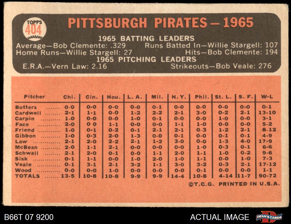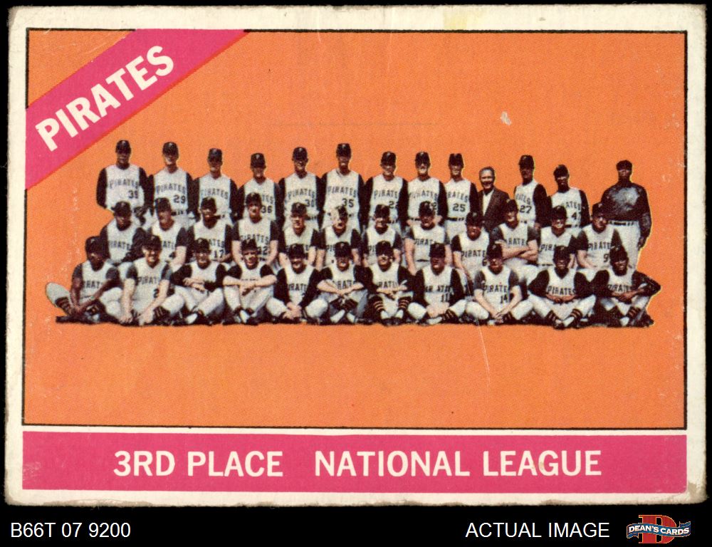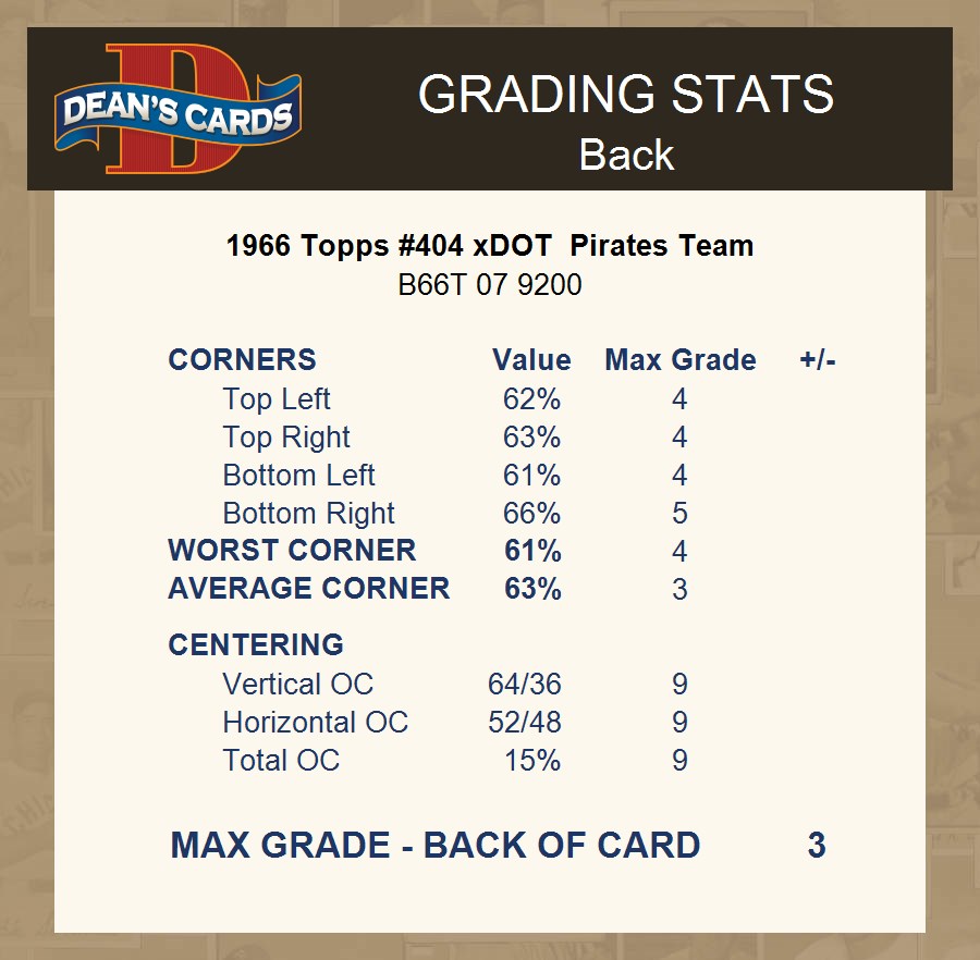 1966 Topps #404 Pirates Team No Dot RARE VARIATION 1 - POOR If the scan in the listing says ACTUAL IMAGE, you will receive the card pictured. For cards issued after 1983, we will often use representative images and you will not receive the exact card pictured. Shipping Policy You only pay shipping on the first item. If you order multiple items on the same order, you will only be charged once for shipping. We do not combine shipping on multiple orders. To avoid multiple shipping charges we recommend using eBay's "Add to Cart" feature to check out multiple items in one transaction, or please request and allow for us to send an invoice to reflect the combined shipping charges. Canadian customers - We send all of our Canadian/International packages with tracking and cannot make any exceptions to this policy. Negotiating Prices All prices are final and we do not negotiate. This policy is to ensure that everyone knows that they are getting our best possible price. So please do not ask us to negotiate on price. Return Policy Dean's Cards has a 100% Money Back Satisfaction Guarantee on all purchases, as long as the product is returned within 30 days of receiving the product. Card Grading Each card is first reviewed by a member of our team, in order to detect any flaws that may not be visible on a scan, such as wrinkles, creases, print spots, or light stains. The vast majority of our vintage cards are professionally graded by the Dean's Cards Grading Software and include a 100% satisfaction guarantee. Our grading is on par with PSA standards when it comes to corners, centering and flaws - and tends to grade a bit tougher than PSA, on cards with a tilted image or rough edges. This grading software was developed to provide far better grading and consistency than can be achieved using the human eye. Determining the card's grade The sharpness of the corners and the degree to which a card was cut off-center determines the maximum possible grade that the card can receive. The card's grade is further reduced by any flaws or blemishes that it may have. Each card is evaluated on the following characteristics and assigned a score. Corners - Each corner of a card is individually analyzed, and then assigned a score on how square, sharp, and flawless it appears. Centering - The borders are measured, at multiple points along the edge, to determine the horizontal and vertical centering and tilt. Defects - The card is examined for imperfections, such as: size, print flaws, dings, stains, creases, or other wear which could lower its grade. Bonus for Perfect Centering - A vintage card, with near perfect centering, is given a one-half grade bonus. So when you buy one of our cards with a half-grade (e.g. 3.5 or 6.5) it will appear perfectly centered, both vertically and horizontally. Grading Criteria Worst Corner - A card can grade only as high as the worst corner will allow. Average Corner Tilt - The difference in width of a card border near the top, compared to the bottom. OCT - The sum of how far a card is Off-Center, plus its Tilt. Minimum Centering Requirements Eye Appeal - The combination of a card's centering, corners and tilt. Well-Centered - Cards that appear perfectly centered receive a bonus of one-half grade. Flaws, defects and other imperfections - can lower a card's grade. Card Backs - the above criteria is also considered, for the back of the cards, but does not inflict as severe of a penalty to its grade. Packaging Once scanned, the cards are placed in "soft" sleeves, which have an open top for easy removal. The Dean's Cards label is placed on the top back of the card sleeve. Every card you buy features a QR Code that you can scan to see your ACTUAL CARD and its grading statistics. Please note that when images are enlarged there may be instances of vertical lines running through the scans. This was caused by a "dust speck" on the scanner and can be verified by the vertical lines running into the black margins on the top and bottom of the image. About Dean and Dean's Cards Dean's Cards Makes Card Collecting - Fast, Easy And Fun. Dean's Cards was founded in 2002 and has become the leading online seller of vintage sports cards and non-sports cards. Our inventory has grown to more than a million vintage cards and we have a staff of 15-20 employees and a 8500 sq. ft. office space in Cincinnati, Ohio.