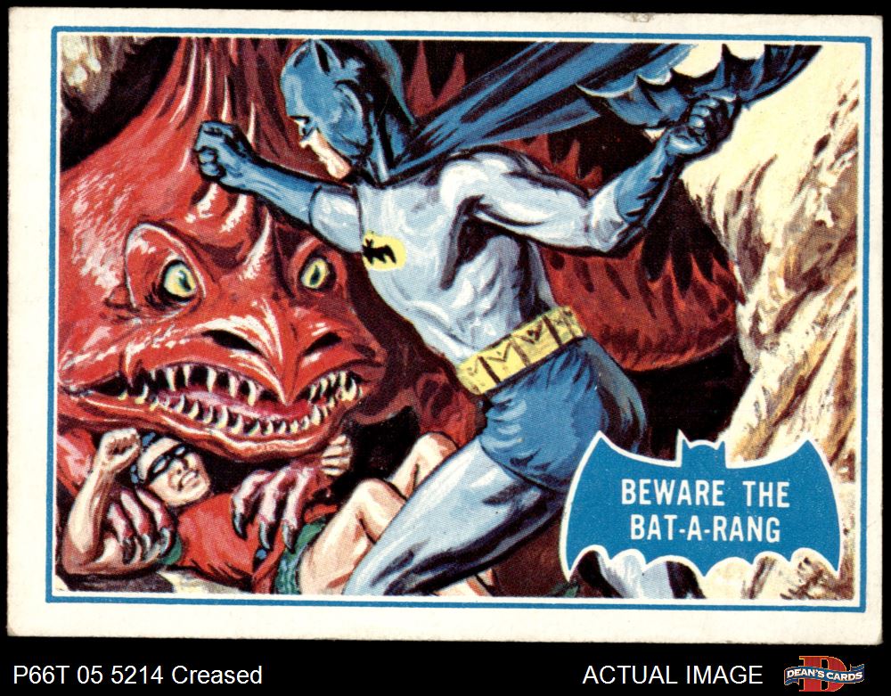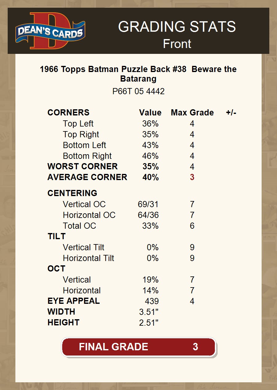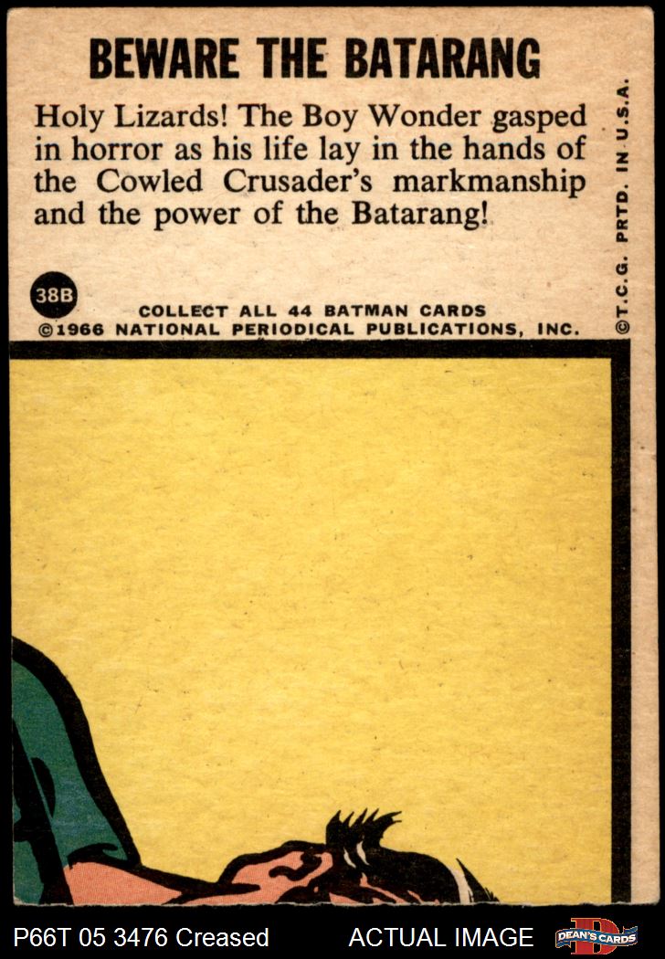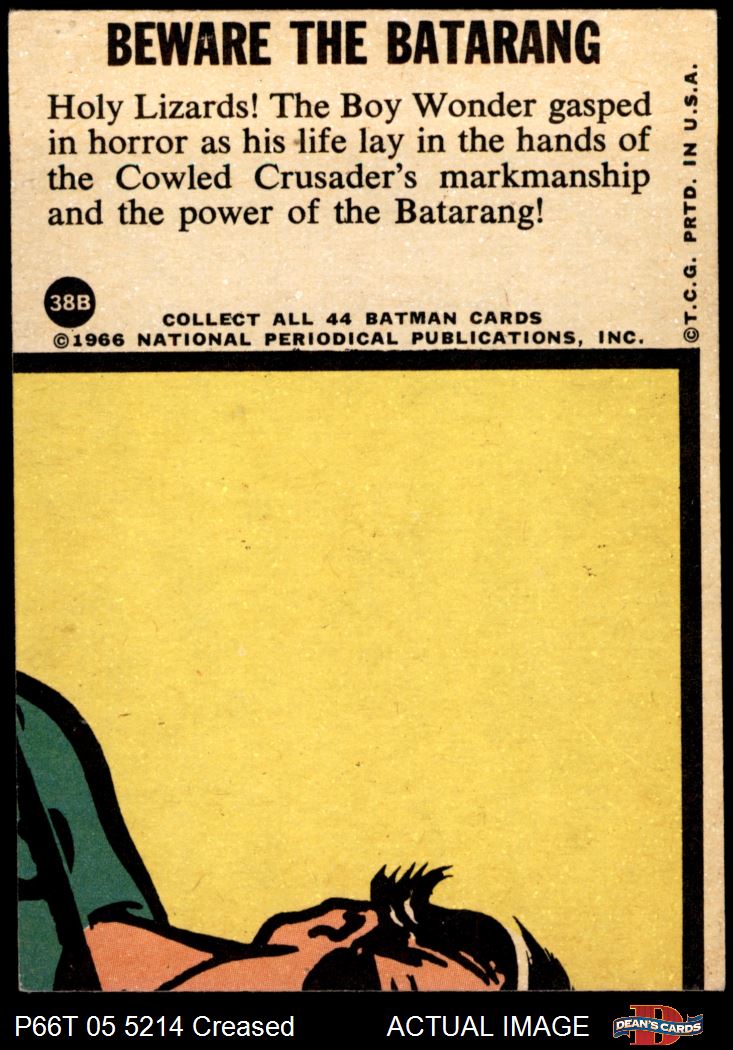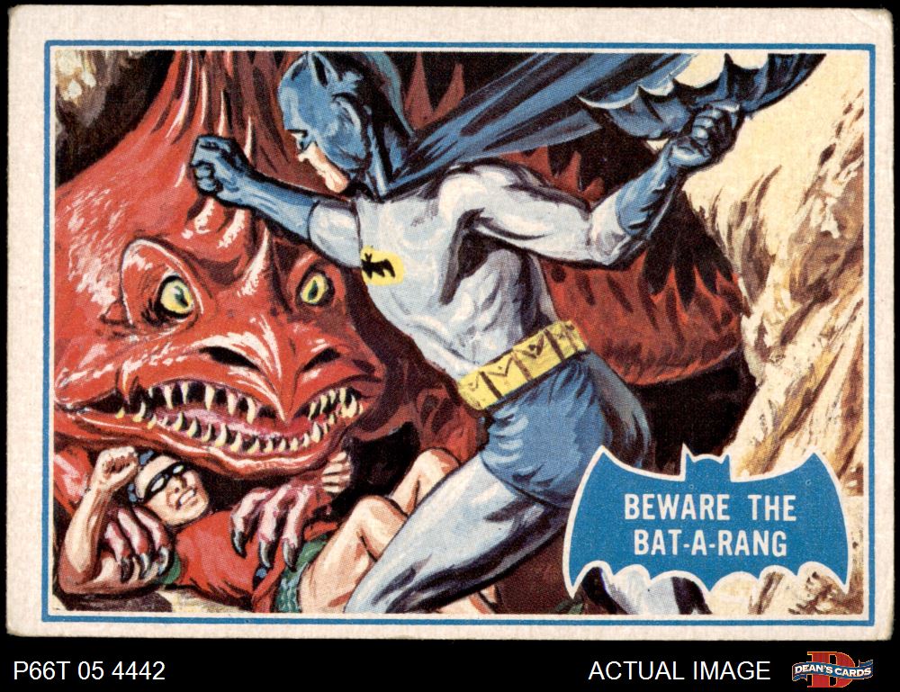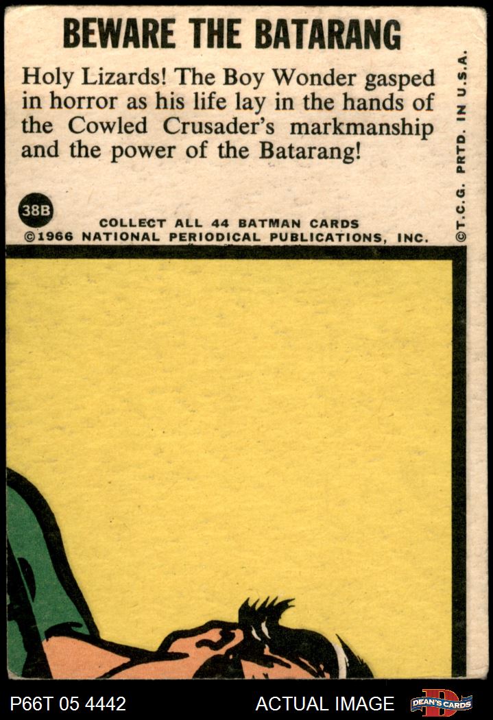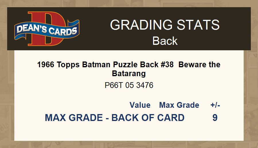1966 Topps Batman Puzzle Back #38 Beware the Batarang 3 - VG If the scan in the listing says ACTUAL IMAGE, you will receive the card pictured. For cards issued after 1983, we will often use representative images and you will not receive the exact card pictured. Shipping Policy You only pay shipping on the first item. If you order multiple items on the same order, you will only be charged once for shipping. We do not combine shipping on multiple orders. To avoid multiple shipping charges we recommend using eBay's "Add to Cart" feature to check out multiple items in one transaction, or please request and allow for us to send an invoice to reflect the combined shipping charges. Canadian customers - We send all of our Canadian/International packages with tracking and cannot make any exceptions to this policy. Negotiating Prices All prices are final and we do not negotiate. This policy is to ensure that everyone knows that they are getting our best possible price. So please do not ask us to negotiate on price. Return Policy Dean's Cards has a 100% Money Back Satisfaction Guarantee on all purchases, as long as the product is returned within 30 days of receiving the product. Card Grading Each card is first reviewed by a member of our team, in order to detect any flaws that may not be visible on a scan, such as wrinkles, creases, print spots, or light stains. The vast majority of our vintage cards are professionally graded by the Dean's Cards Grading Software and include a 100% satisfaction guarantee. Our grading is on par with PSA standards when it comes to corners, centering and flaws - and tends to grade a bit tougher than PSA, on cards with a tilted image or rough edges. This grading software was developed to provide far better grading and consistency than can be achieved using the human eye. Determining the card's grade The sharpness of the corners and the degree to which a card was cut off-center determines the maximum possible grade that the card can receive. The card's grade is further reduced by any flaws or blemishes that it may have. Each card is evaluated on the following characteristics and assigned a score. Corners - Each corner of a card is individually analyzed, and then assigned a score on how square, sharp, and flawless it appears. Centering - The borders are measured, at multiple points along the edge, to determine the horizontal and vertical centering and tilt. Defects - The card is examined for imperfections, such as: size, print flaws, dings, stains, creases, or other wear which could lower its grade. Bonus for Perfect Centering - A vintage card, with near perfect centering, is given a one-half grade bonus. So when you buy one of our cards with a half-grade (e.g. 3.5 or 6.5) it will appear perfectly centered, both vertically and horizontally. Grading Criteria Worst Corner - A card can grade only as high as the worst corner will allow. Average Corner Tilt - The difference in width of a card border near the top, compared to the bottom. OCT - The sum of how far a card is Off-Center, plus its Tilt. Minimum Centering Requirements Eye Appeal - The combination of a card's centering, corners and tilt. Well-Centered - Cards that appear perfectly centered receive a bonus of one-half grade. Flaws, defects and other imperfections - can lower a card's grade. Card Backs - the above criteria is also considered, for the back of the cards, but does not inflict as severe of a penalty to its grade. Packaging Once scanned, the cards are placed in "soft" sleeves, which have an open top for easy removal. The Dean's Cards label is placed on the top back of the card sleeve. Every card you buy features a QR Code that you can scan to see your ACTUAL CARD and its grading statistics. Please note that when images are enlarged there may be instances of vertical lines running through the scans. This was caused by a "dust speck" on the scanner and can be verified by the vertical lines running into the black margins on the top and bottom of the image. About Dean and Dean's Cards Dean's Cards Makes Card Collecting - Fast, Easy And Fun. Dean's Cards was founded in 2002 and has become the leading online seller of vintage sports cards and non-sports cards. Our inventory has grown to more than a million vintage cards and we have a staff of 15-20 employees and a 8500 sq. ft. office space in Cincinnati, Ohio.