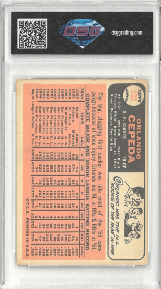 Player/Athlete:Orlando CepedaSeason:1966Set:1966 ToppsLeague:Major League Baseball (MLB)Sport:Baseballbrand:ToppsSeries:ToppsCard Number:132Features:Base SetManufacturer:ToppsTeam:San Francisco GiantsParallel/Variety:[Base]