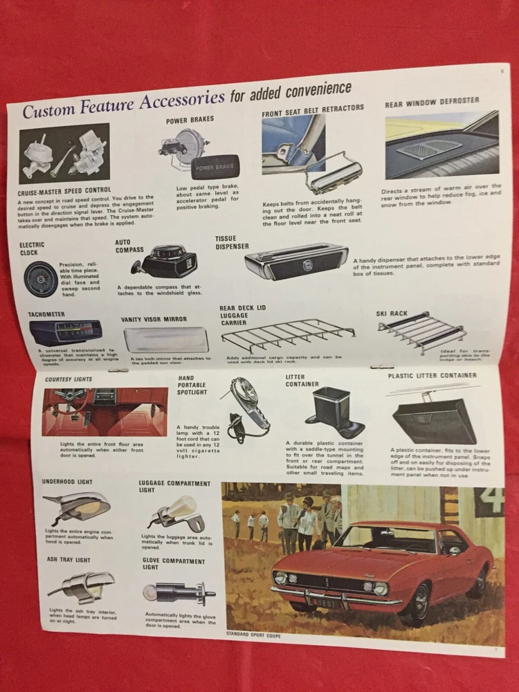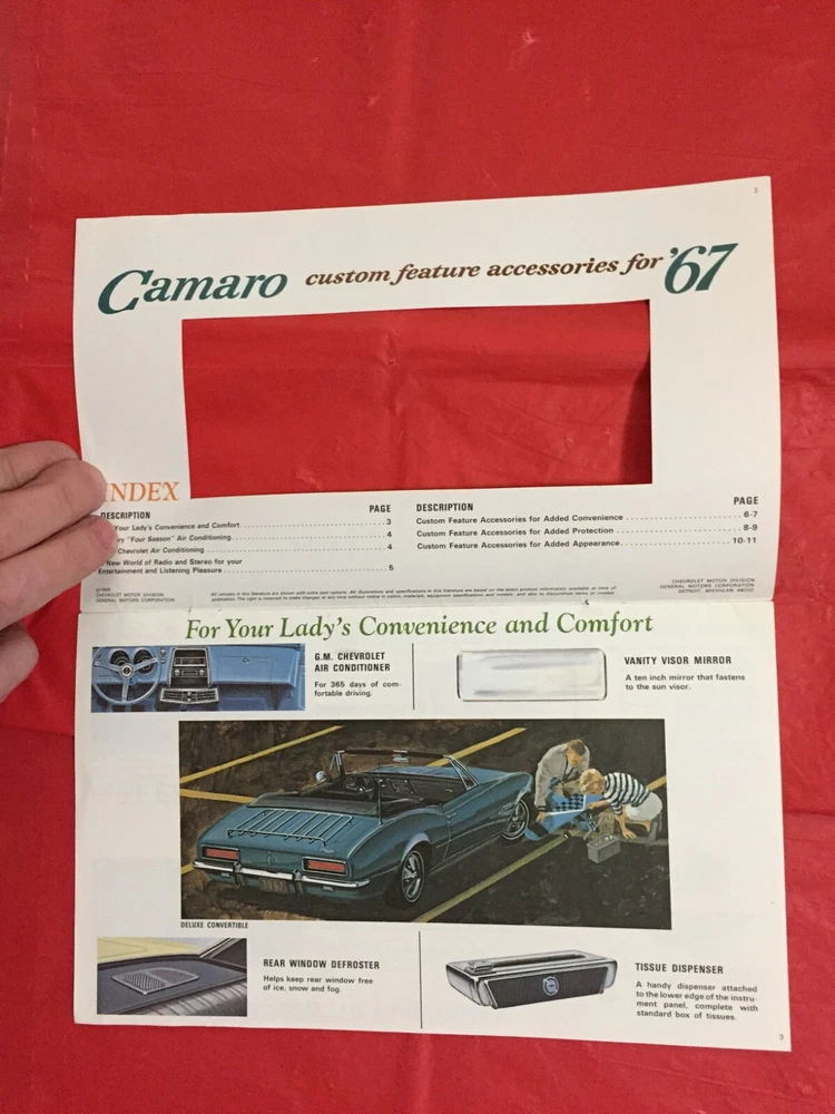 ITEM:::: This Listing is for an original 1967 CHEVROLET "CAMARO CUSTOM FEATURE ACCESSORIES" Car Dealer Sales Brochure ....... DIMENSIONS:::: About 10 3/8 by 6 1/4 inches and there are 12 pages with covers ...... CONDITION:::: The general overall condition is mostly VG... .. .. (Please refer to pictures & e-mail for details). ......... ABREVIATIONS:::: E=Excellent with no issues..... VG = Very Good with very lite issues..... G/VG = Good to Very Good with lite issues..... G + = Good+ with lite to moderate issues..... G = Good with moderate issues..... G - = Good- with moderate+ issues..... F/G = Fair to Good with quite a few issues..... F = Fair with many issues..... P = Poor with lots of issues..... Please let the pictures help you decide condition because they are an integral part of the description! Please e-mail with questions...... I will combine shipping & you will only pay $6.98 for shipping no matter how many items you accumulate! You can take up to 30 days to accumulate Items for combined shipping. Please drop me a note after your 1st win letting me know that you intend to wait to pay so that you can take advantage of combined shipping...... I will ship your Package to the address that you have registered on EBAY---Ergo, I will ship to the address that is on the shipping label when I print it from EBAY---Please do not ask me to ship to any other address---I will not do it! My goal is 100% satisfaction! I will refund 100% of your costs if you are not satisfied! Thanks for visiting!