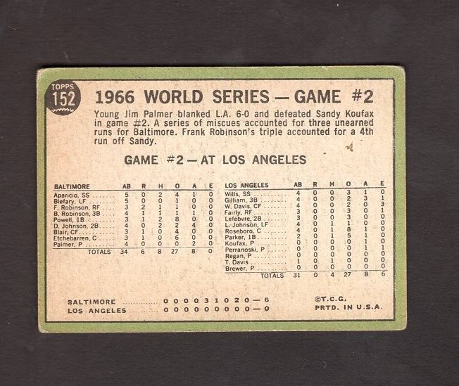 1967 Topps # 152 Game 2 1966 World Series Jim Palmer shutout in good condition with corner and border wear. SHIPPING IS FREE. Check out the other STAR cards in my e-bay store as well as the many Topps and Bowman single cards in my e-bay store. If you think you might buy multiple items from any seller that offers combined shipping, use the "Add To Cart" option under the "Buy It Now" button instead of the buy-it-now, and this will combine your purchases into one shipping charge as you add more items to your cart and purchase. Only make your payment after you have added all the items you want into your cart - you should then see that there is one charge for shipping when you go to make your payment. (hunt, 06-15, #651 /2)