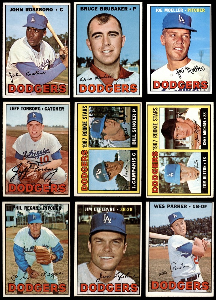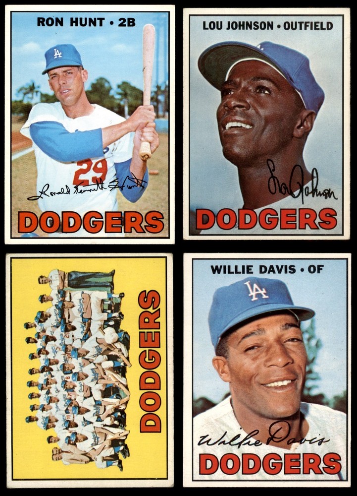This set contains the following cards 1967 Topps #12 - Bill Singer / Jim Campanis Dodgers Rookies 3 - VG Front Back 1967 Topps #31 Jim Brewer 3 - VG Front Back 1967 Topps #32 Bob Bailey 3 - VG Front Back 1967 Topps #55 Don Drysdale 4 - VG/EX Front Back 1967 Topps #76 Jim Barbieri 3 - VG Front Back 1967 Topps #94 May have Blue Dot in the Sky Ron Fairly 4 - VG/EX Front Back 1967 Topps #130 Phil Regan 5 - EX Front Back 1967 Topps #149 xWHT Joe Moeller 3 - VG Front Back 1967 Topps #160 Willie Davis 4 - VG/EX Front Back 1967 Topps #197 Ron Perranoski 4 - VG/EX Front Back 1967 Topps #218 Wes Parker 3 - VG Front Back 1967 Topps #260 Jim LeFebvre 4 - VG/EX Front Back 1967 Topps #276 Bruce Brubaker 5.5 - EX+ Front Back 1967 Topps #294 Walter Alston 4 - VG/EX Front Back 1967 Topps #313 Bob Lee 4 - VG/EX Front Back 1967 Topps #346 Jim Hickman 4 - VG/EX Front Back 1967 Topps #365 John Roseboro 4 - VG/EX Front Back 1967 Topps #398 Jeff Torborg 5 - EX Front Back 1967 Topps #410 Lou Johnson 4 - VG/EX Front Back 1967 Topps #428 - Gene Michael / Tom Hutton Dodgers Rookies 4 - VG/EX Front Back 1967 Topps #503 Dodgers Team 2 - GOOD Front Back 1967 Topps #525 Ron Hunt 6.5 - EX/MT+ Front Back This is a 1967 Topps Los Angeles Dodgers Near Team Set. Dean's Cards has designed our Near Complete Team Sets using the majority of cards for that team - leaving out the expensive super-star rookie cards, high numbers, short-prints, and multi-player rookie cards, reducing the price. the other cards can then be added, from our inventory of over a million cards, as your budget allows. In order to keep the cost of this set down, the high number cards are not included. The two missing high number cards ,#539 Dick Egan and #557 Al Ferrara, can be purchased separately on our site. For the exact cards contained in this set, as well as their front and back scans, please see the description below. Set breakdown by grade: Number of Cards in Set 22 Average Grade - Weighted by Value 4.28 - VG/EX+ Average Grade - Unweighted 3.91 - VG/EX Grade Breakdown 6.5 - EX/MT+ 1 5.5 - EX+ 1 5 - EX 2 4 - VG/EX 11 3 - VG 6 2 - GOOD 1 . This near team set contains 22 cards out of the possible 38 cards. This is not a complete set. "The following cards have been omitted, in order to keep the cost of the set reasonable, and can be purchased separately."#151 1966 World Series - Game #1 - Moe Mows Down 11 - Moe Drabowsky, #152 1966 World Series - Game #2 - Palmer Blanks Dodgers - Jim Palmer, #153 1966 World Series - Game #3 - Blair's Homer Defeats L.A. - Paul Blair May have a Black Line extends from number circle on Back, #154 1966 World Series - Game #4 - Orioles Win 4th Straight, #155 1966 World Series Summary - The Winners Celebrate Hank Bauer / Dave McNally, #234 NL ERA Leaders - Sandy Koufax / Juan Marichal / Mike Cuellar, #236 NL Pitching Leaders - Bob Gibson / Sandy Koufax / Juan Marichal / Gaylord Perry and #238 NL Strikeout Leaders - Sandy Koufax / Jim Bunning / Bob Veale This set does not include the following cards: #111 John Kennedy, #330 Claude Osteen, #381 Dick Schofield, #445 Don Sutton, #461 Bob Miller, #514 John Werhas, #539 Dick Egan, #557 Al Ferrara Dean's Cards offers a 100% Money Back Satisfaction Guarantee on all purchases. Just contact us within 10 days of the purchase date and we will refund your money or, when possible, replace the cards. 1967 Topps Los Angeles Dodgers Near Team Set 4.5 - VG/EX+ 6902190 (22 / 38 cards) If the scan in the listing says ACTUAL IMAGE, you will receive the card pictured. For cards issued after 1983, we will often use representative images and you will not receive the exact card pictured. Shipping Policy You only pay shipping on the first item. If you order multiple items on the same order, you will only be charged once for shipping. We do not combine shipping on multiple orders. To avoid multiple shipping charges we recommend using eBay's "Add to Cart" feature to check out multiple items in one transaction, or please request and allow for us to send an invoice to reflect the combined shipping charges. Canadian customers - We send all of our Canadian/International packages with tracking and cannot make any exceptions to this policy. Negotiating Prices All prices are final and we do not negotiate. This policy is to ensure that everyone knows that they are getting our best possible price. So please do not ask us to negotiate on price. Return Policy Dean's Cards has a 100% Money Back Satisfaction Guarantee on all purchases, as long as the product is returned within 30 days of receiving the product. Card Grading Each card is first reviewed by a member of our team, in order to detect any flaws that may not be visible on a scan, such as wrinkles, creases, print spots, or light stains. The vast majority of our vintage cards are professionally graded by the Dean's Cards Grading Software and include a 100% satisfaction guarantee. Our grading is on par with PSA standards when it comes to corners, centering and flaws - and tends to grade a bit tougher than PSA, on cards with a tilted image or rough edges. This grading software was developed to provide far better grading and consistency than can be achieved using the human eye. Determining the card's grade The sharpness of the corners and the degree to which a card was cut off-center determines the maximum possible grade that the card can receive. The card's grade is further reduced by any flaws or blemishes that it may have. Each card is evaluated on the following characteristics and assigned a score. Corners - Each corner of a card is individually analyzed, and then assigned a score on how square, sharp, and flawless it appears. Centering - The borders are measured, at multiple points along the edge, to determine the horizontal and vertical centering and tilt. Defects - The card is examined for imperfections, such as: size, print flaws, dings, stains, creases, or other wear which could lower its grade. Bonus for Perfect Centering - A vintage card, with near pe