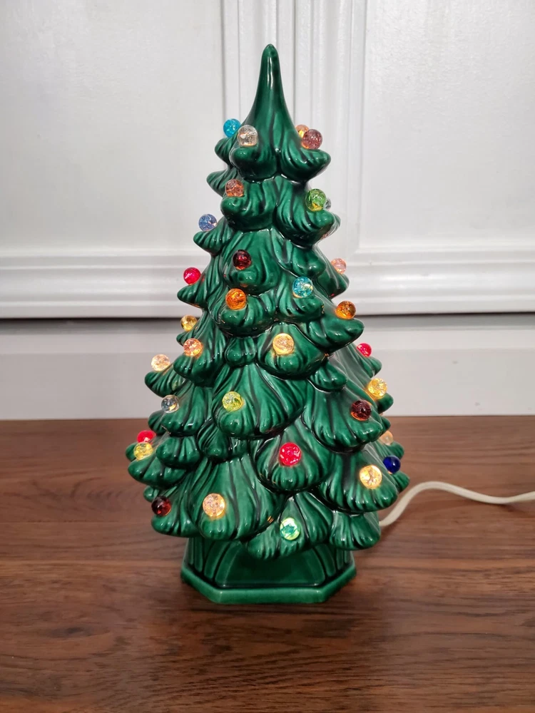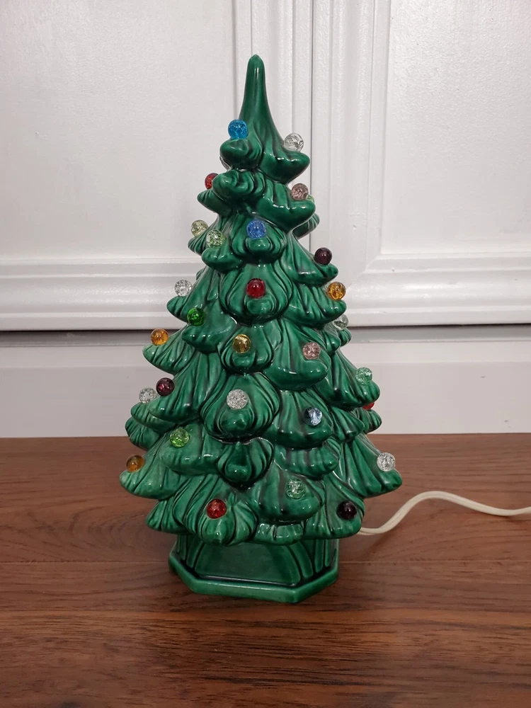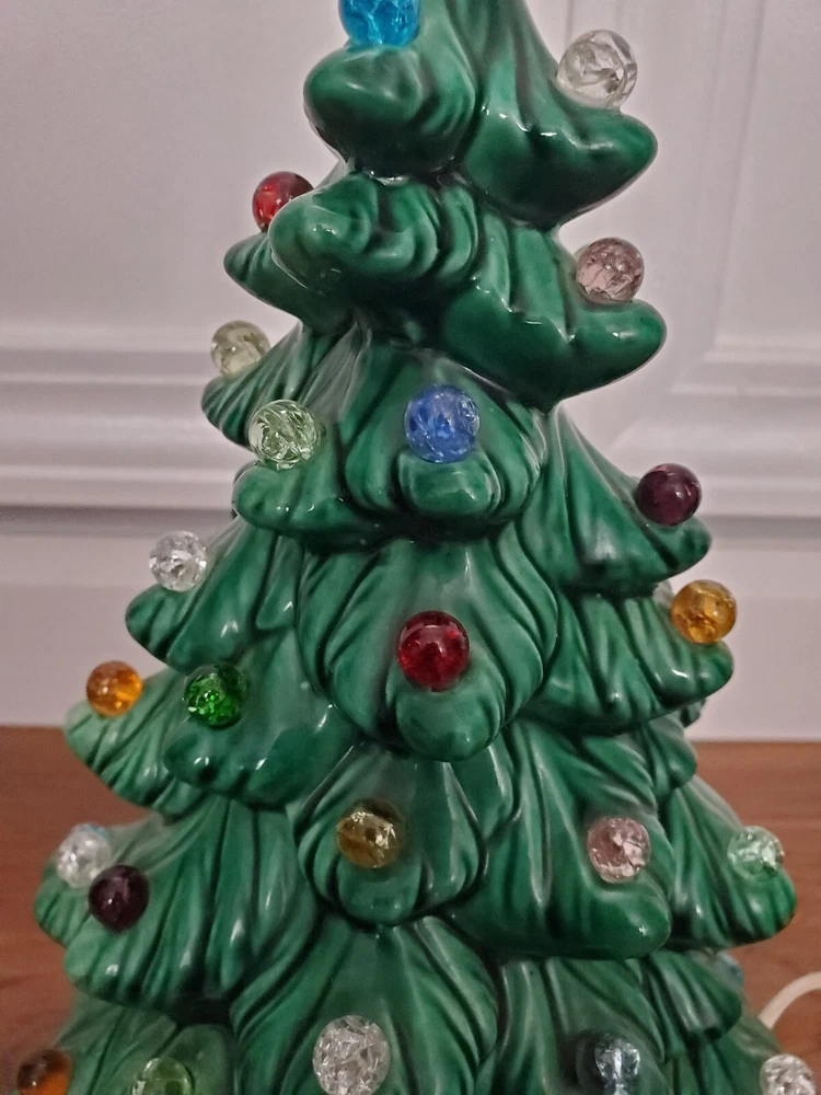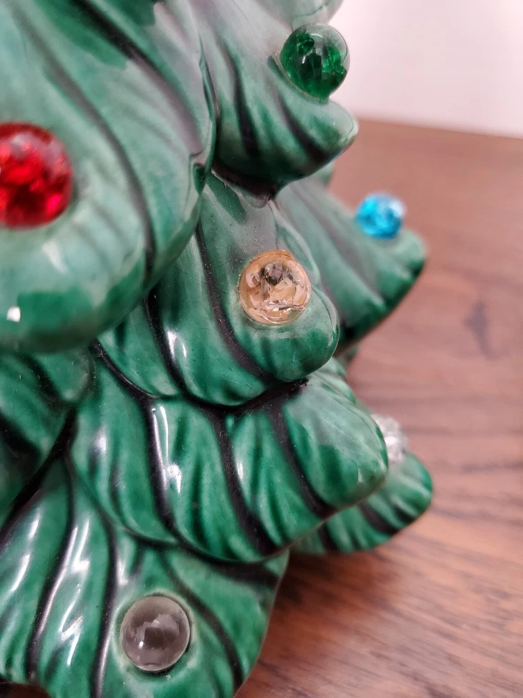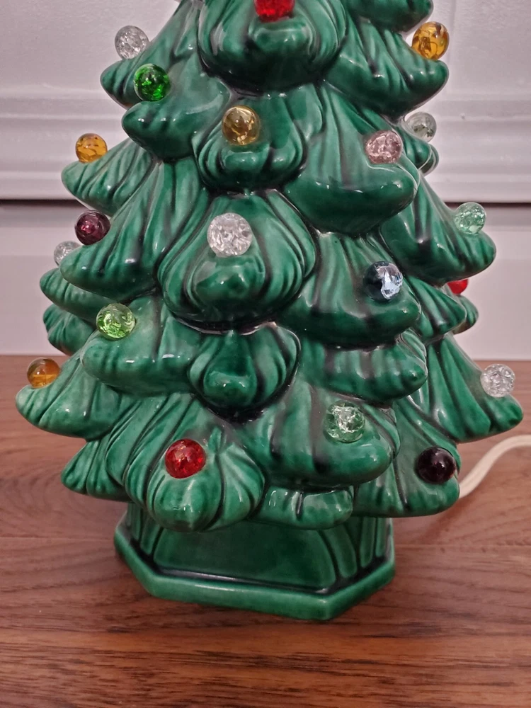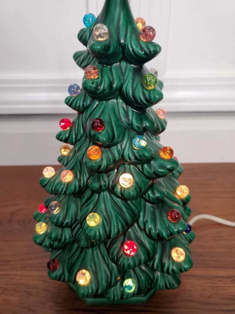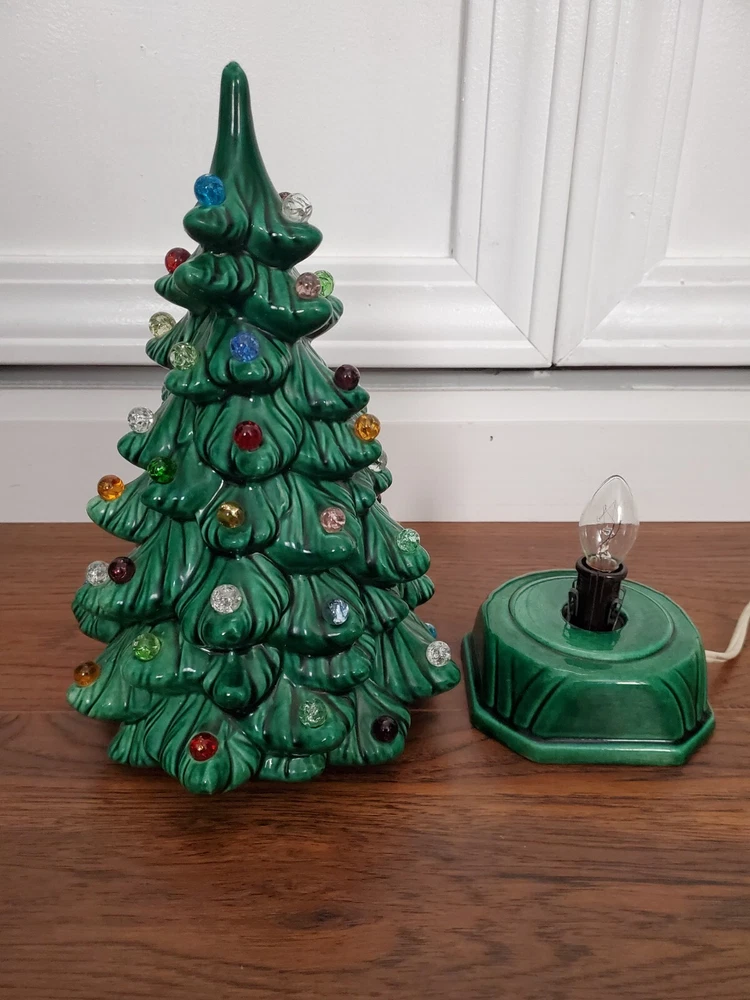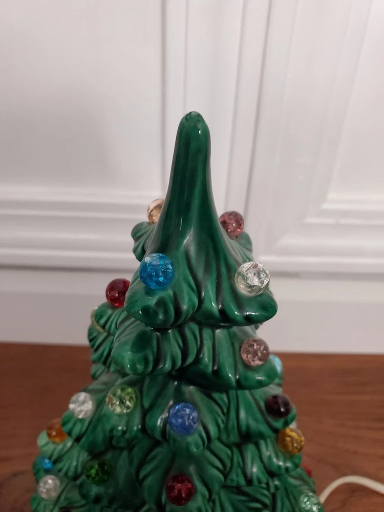 Vintage ceramic lighted Christmas Tree with base, includes all bulbs, a few bulbs are cracked, approximately 11", as is, as pictured, no returns. Shipped USPS