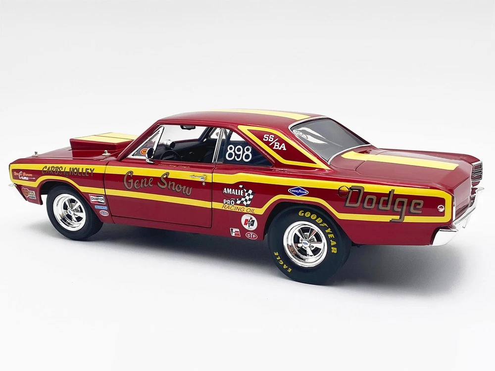 SAVE WHEN BUYING MORE!!! Buy as many items as you wish and we will ship them for one low shipping cost to 48 continental U.S. states physical addresses. Example: Shipping cost for most 1/24 scale items is $10, for 1/18 scale items is $12. If you use Add to cart button and purchase 5 items in 1/24 scale and 5 items in 1/18 scale, your shipping cost will be only $12 for 10 items. In order to request combined shipping for signed in desktop users: Please use Add to cart button for desired items, click Go to cart button and press Request total from us before paying and we will send combined shipping invoice shortly. If checking out as a Guest or using a mobile version, please use Add to cart button then click Go to cart button , press Go to checkout button, request extra shipping refund in Message to seller section and finalize payment by pressing Confirm and pay button. We will refund extra shipping cost shortly. DESCRIPTION: Brand new 1/18 scale diecast car model of 1968 Dodge Dart Super Stock #898 "Gene Snow" Red Metallic with Yellow Stripes Limited Edition to 510 pieces Worldwide die cast model car by ACME. Brand new box. Real rubber tires. Steerable wheels. True-to-scale detail. Has detailed chassis. Has removable hood. Opening doors and trunk. Officially licensed product. Plumbed and wired engine. Manufacturer's original unopened packaging. Made of diecast metal with some plastic parts. Detailed interior, exterior, engine compartment. Dimensions approximately L-10.5, W-4, H-3 inches. In February 1968, Chrysler took the performance philosophy of “small car, big engine” to whole a new level. The company told Dodge dealerships across the country that it would sell race-ready factory-built dragsters using the smallest coupe in the fleet, the Dodge Dart. The small car would be equipped with the biggest motor in the Mopar arsenal, and the result was the remarkable Super Stock Dodge Dart. A purpose-built dragster strictly for the track. Gene "the Snowman" Snow will remain in the history books as the first Funny Car driver to break the 200-mph barrier with a 200.88 clocking on Aug. 17, 1968, and the first Top Fuel driver to break the four-second barrier at an NHRA national event, Oct. 6, 1988. PAYMENT INSTRUCTIONS: We gladly accept paypal. Tracking info is free upon request. SHIPPING INFO: We do combine shipping cost for two or more items purchased. Please check shipping and payment section. In order to receive combined invoice for multiple purchases, please purchase items and let us know when you are done shopping, so we can send you one combined invoice. We can only combine shipping cost if items paid in one transaction. Dear Valued Customer! We appreciate your business. BUY WITH CONFIDENCE Fast Order Fulfillment 99% of orders are shipped within 24 hours or sooner. Simple Return Policy Thirty days simple returns. More than 10 Years of Experience Family owned and operated, we’ve had the experience of selling online for more than 10 years. Satisfaction Guaranteed! Our feedback says it all. And now, we hope to have the chance to prove we are the best to you! Competitive Pricing and Unrivaled Selection We are the number one direct distributor of diecast model cars in the USA, so we are able to provide very competitive pricing. Our stock selection is unrivaled with over 4,500 different items. Quality Shipping & Handling We package all our orders with care using bubble wrap to protect models from damage in transit. Each model that has a fragile window box is covered with carton protection. Excellent Customer Service Our customer service is second to none with thousands of returning, satisfied customers from all over the world.