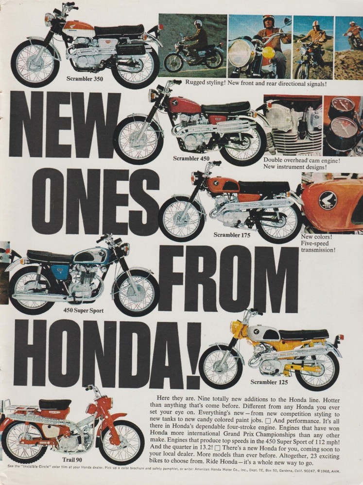 ***THIS LISTING IS FOR A COLLECTIBLE MAGAZINE AD, NOT THE ACTUAL PRODUCT SHOWN IN THE AD*** ***PLEASE READ ENTIRE DESCRIPTION*** We Only Sell 100% Original Magazine Ads, Never Copies Or Reprints. The Ad Pictured Is The Ad You Will Receive. Ads Normally Look Better Than The Scanned Photo Appears. Vintage 100% Original Magazine Print Ad 1968 Honda Motorcycles Model Year Lineup This Is A 2-Page Advertisement, Two Separate Pages, Each Page Measures About 8" x 11" Will Be Shipped In A Protective Sheet And Back-Boarded I Do Offer Combined Shipping Discounts If Multiple Ads Are Purchased Together Only Pay Shipping On First One, All Additional Ads In That Order Are Free Shipping ***Save Us To Your Favorites And Check Back Often As New Listings Are Posted Daily***