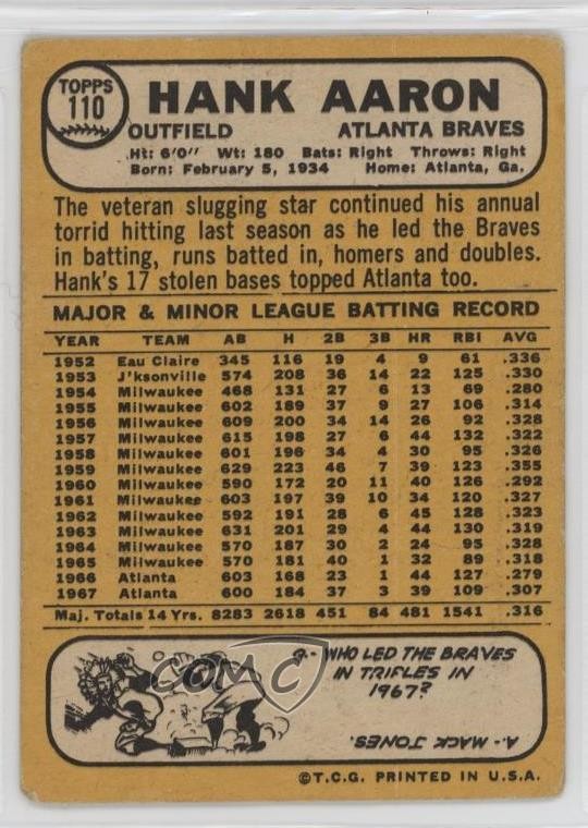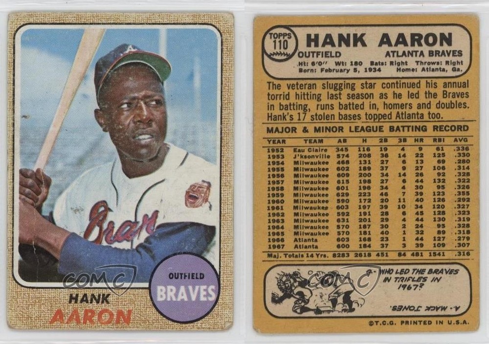 1968 Topps - [Base] #110 Hank Aaron COMC Item: 300869194 - Baseball Card - Featuring the Atlanta Braves - Featuring Hank Aaron Search for more: 1968 Topps Search for more: 1968 Topps - [Base] View all of our Listings Auctions Buy It Now About Us Located in the beautiful Pacific Northwest, COMC (Check Out My Cards) is the world's largest consignment service for trading card singles. More than 10,000 people have used our consignment service to list over 50 million trading cards. Find out how we can help you consign your items on eBay by contacting us through eBay messaging. COMC -- "The Safe & Easy Way to Buy & Sell" Raw Condition for Modern Cards Unless otherwise noted, raw modern cards are listed in Near Mint-Mint condition or better. A NM-MT card appears to be Mint at first glance, but upon closer inspection, may exhibit some of the following: minor print defects (e.g. roller marks, print line, dimple), minor scratches, slight edge wear, and slight corner wear. Centering is clearly visible in the images provided and does not factor into our condition assessment. Raw Condition for Vintage Cards Unless otherwise noted, raw vintage cards are listed in Excellent condition or better. An EX card may exhibit some of the following: minor rounding of corners, surface wear, print defects, light scratches, and slight edge wear/chipping. Centering is clearly visible in the images provided and does not factor into our condition assessment. Domestic Shipping Combined shipping for multiple items is available. To receive combined shipping, please ensure all desired items are in your eBay shopping cart before proceeding to checkout. eBay limits orders to 40 items per order. We automatically combine multiple orders placed on the same day. If you place multiple orders on the same day, please contact us to request a refund of applicable shipping costs. Signature confirmation may be required on invoices over $400. All cards are protected and shipped securely. International Shipping COMC offers eBay's International Shipping (EIS) for international orders under $2,500* (see country exceptions below). All duties and import fees are paid at checkout; in the rare event that there are additional import fees upon delivery, these are borne by the buyer. EIS packages route through a shipping hub in Erlanger, KY before shipping to their final destination. Please note that EIS does not allow for combined shipments. The shipping rates are determined by eBay and cannot be adjusted. *Maximum sale price exceptions: Colombia, Kuwait ($2,000); Taiwan ($1,539); Chile, Costa Rica, Guatemala, Honduras, Trinidad and Tobago ($1,000); Antigua and Barbuda, Aruba, Belize, Dominica, Grenada, Philippines, Saint Kitts and Nevis, Saint Lucia, Montserrat, Turks and Caicos Islands ($500); Dominican Republic, El Salvador ($200). Please request a shipping quote through eBay messaging for orders that exceed the maximum sale price supported by eBay's International Shipping. You will be responsible for all duties and import fees for international orders shipped outside the EIS. All cards are protected and shipped securely. Auction Bidding By placing a bid on our auctions, you are making a commitment to complete the purchase. Payment is due within 7 days of winning an auction. Bidders who neglect to pay for an item they win will be blocked from making any future purchases and will be reported to eBay. Payment COMC does not accept offers on our cards through our eBay storefront. COMC utilizes eBay’s managed payments system. If you are experiencing difficulties making a payment, please contact eBay for assistance. Return policy Returns are only accepted on the rare occasion the item is not as described. If you are making a return, please initiate the return process through eBay so a mailing label can be provided for you. Prior to listing, our expert team carefully assessed this item to represent it accurately. Please review the description and high-definition images prior to bidding to ensure this item meets your satisfaction. We welcome you to contact us if you have further questions about this item. Trust and Integrity Shill bidding is prohibited on COMC Auctions. We collaborate with eBay to monitor and identify bidding activity which does not appear to be in good faith. If we determine a bidder is operating outside of eBay’s guidelines, we may choose to cancel their bids, permanently block them from purchasing from COMC, and report them to eBay. Shill bidding is also illegal in many places and can carry severe penalties. COMC carefully assesses each item consigned to us to prevent fraudulent items from entering the marketplace. If you believe an item offered on COMC may be fraudulent, please contact us with details so we can investigate the issue. Items we determine are outside our supported items policy may be removed. Last Modified: 12/1/2025 5:23:29 PM PDT