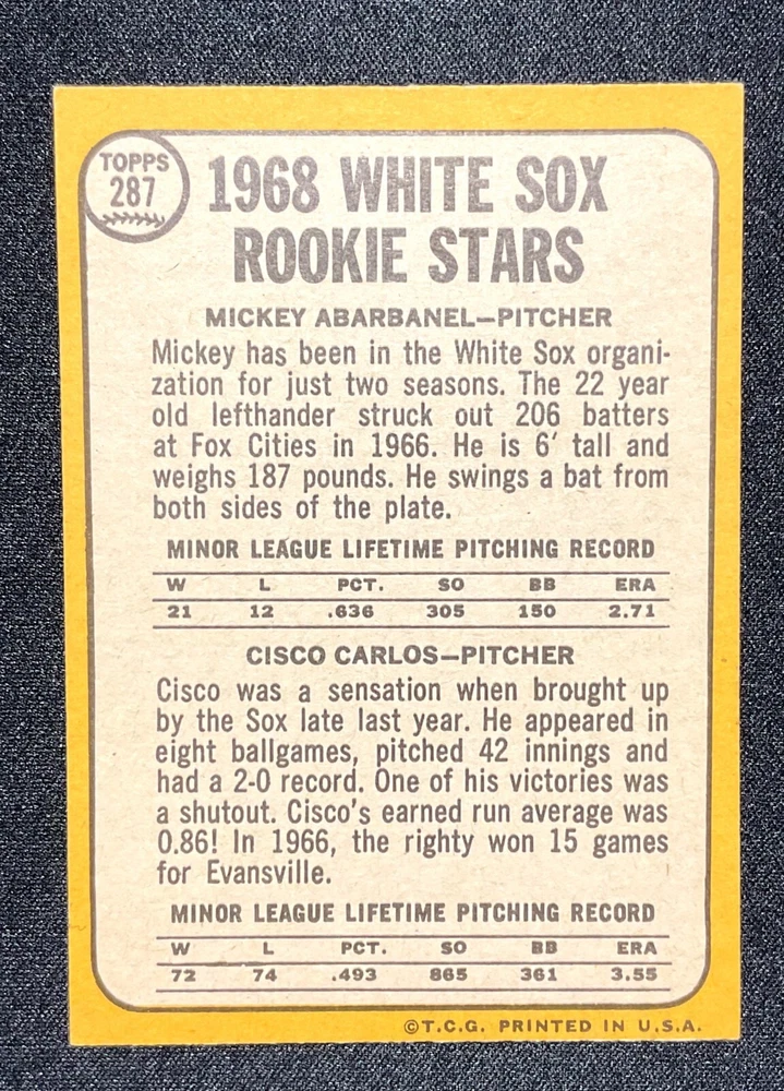 1968 Topps Rookie Stars #287 (Chicago White Sox) Mickey Abarbanel, Cisco Carlos Excellent corners! There is a surface issue by Carlos's ear. Free Shipping! Check out our store for more great deals! Thanks