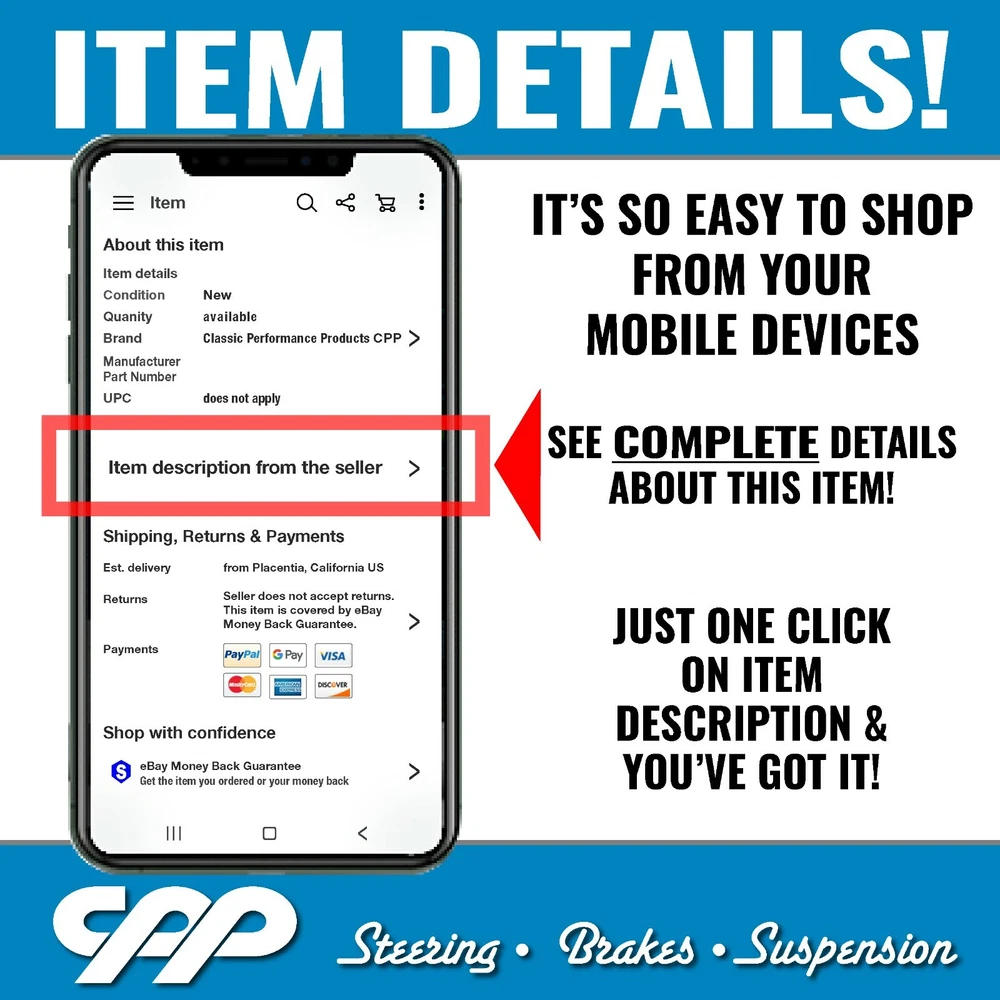 Steering • Brakes • Suspension Call the Experts TOLL FREE: for more information about your eBay purchases. 1968-1972 Chevrolet Chevelle Viking 350LB Front Coil-Over Shock Conversion Kit **Designed For Small Block or LS Engines** Features: 350lbs spring rating Viking double adjustable shocks allow user to independently adjust compression and rebound Huge adjustment range allows the user to adjust settings for comfortable cruising to high performance racing, and everything in between Designed for lowering the Car/Truck. Will NOT lift the Car/Truck 19 positions of compression adjustment and 19 positions of rebound adjustment for a total of 361 different valving combinations Lightweight aluminium twin-tube design with a sleek clear anodized finish Labeled adjustment knobs: “C” for compression and “R” for rebound Ride height adjustable. Increased range of ride height adjustment over most other brands. Tight tolerances on threads provides for easier ride height adjustments. Left hand threads between the base and the body ensures that the shock doesn’t come apart when adjusting ride height, as can occur with certain other brands Aluminium, precision machined piston with deflective disc technology and a PTFE / bronze piston seal Three-step sealing system 5/8” hard chrome plated, centerless ground piston rod Each shock is dyno tested and serialized Cold wound, high tensile U.S spring steel springs Springs are heat treated, shot-peened, and have a silver powder coat finish Two year materials and workmanship warranty. Double the warranty of nearly every other manufacturer! Made proudly in the U.S.A. This Coil-Over Conversion Kit for 68-72 Chevelle features Viking billet, double-adjustable coil over shocks with 350lbs springs. This highly adjustable race quality shock features dual 19 click rebound and compression adjustment knobs providing a total of 361 possible dampening combinations while the threaded pre-load collar will adjust ride height as well as make the spring stiffer/softer. The bodies are constructed of high quality billet aluminum and the surface is a very high quality, sleek, clear anodized finish. Viking light weight springs are just as high tech as their shocks. Each spring is cold wound, high tensile U.S. spring steel that has been heat treated and shot peened with both ends ground and are powder coated a chrome-like silver. Additionally, they are non-binding "high travel" springs and are 25% lighter, on average versus the competition. Transform your classic Chevelle from an average driver to a street machine with these coilovers and unleash the potential of your suspension. (Part# A204-350S) BEFORE LEAVING FEEDBACK If you receive an order that does not meet your expectations, please allow us the opportunity to fix the problem before leaving negative feedback or rating us. We want you to be happy with your purchase! Contact us via the Message Center if you require any assistance. SHIPPING INFORMATION Orders over $599 will be sent out with signature required. You will need to sign for your packages or make arrangements with the carrier to pick up from their nearest hub. Most items (unless noted in the handling time) ship from our warehouse within 4-5business days from the business day your payment is received and processed in our system. Orders placed Friday and through the weekend will be processed Monday (excluding Holidays). Once your order is processed and shipped from our warehouse you will receive an email with your tracking information. We ship via UPS and FedEx. We only ship to a confirmed PayPal shipping address. All Will Call orders must be placed at least 24 hours in advance for pickup from the showroom, including in showroom or parking lot orders. Local pickup is available upon request. A matching ID, which must correspond to the name on the PayPal payment, is mandatory for picking up items. Will Call orders will not be released and will be refused if the person and ID do not match the PayPal payment. Local pick up requires a 24hr processing time before pick up. We will notify you when the parts are ready for pick up. CONTACT US Messages via eBay are answered within 24 hours, not including weekends or holidays. Warranty All eBay purchases come with a 30-day warranty from the day you receive your order. If you receive an item that is damaged or defective or missing components, please notify us within 3 days of receipt. Any items outside the 30-day warranty will be the responsibility of the customer to pay for any repairs, as well as cover all shipping costs.