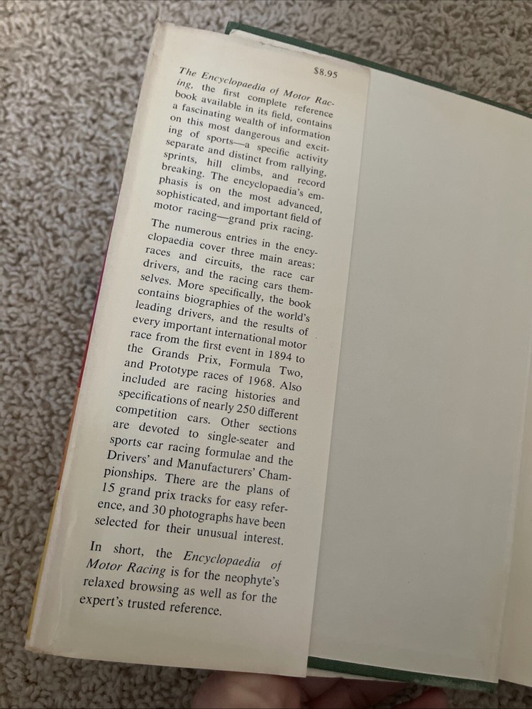 Dive into the thrilling world of motor racing with "The Encyclopedia of Motor Racing" by Anthony Pritchard and Keith Davey. A treasure for enthusiasts and historians alike, this 1969 first edition is an authoritative guide to the exhilarating realm of auto racing. With its comprehensive content and captivating illustrations, it's a must-have for any serious collector or fan of the genre. This hardcover gem, published by David McKay, boasts a dust jacket that adds to its charm and historical value. The book is replete with enthralling accounts and insightful information, making it an exceptional find for those passionate about motor sports. Its place in the annals of literature is secured by its originality, and it's sure to be a standout addition to any library.