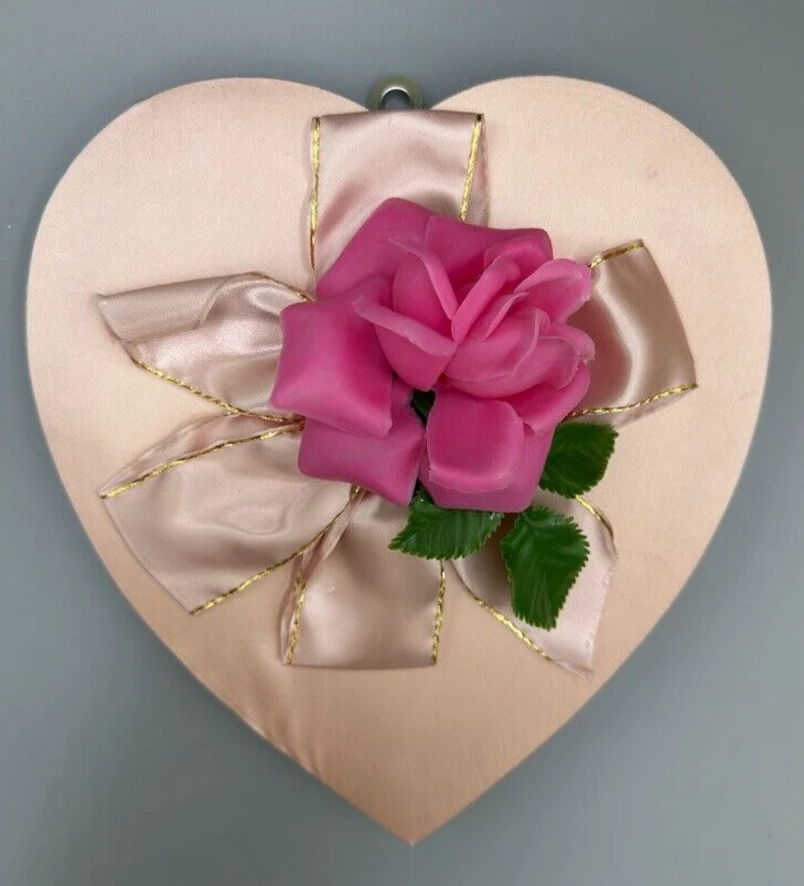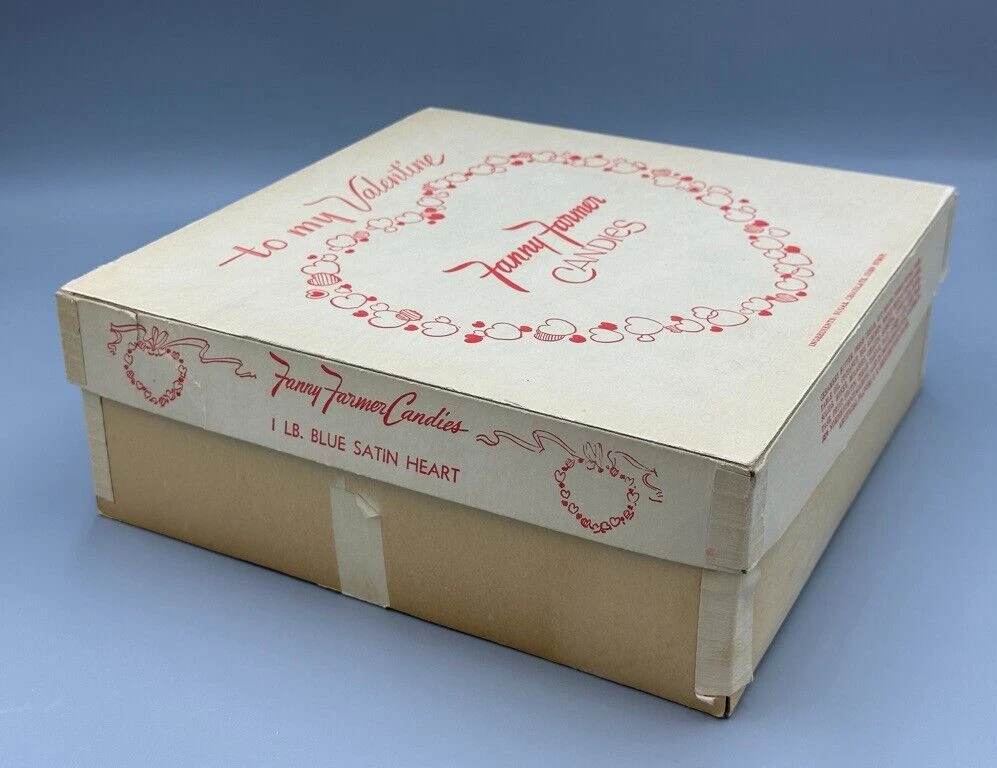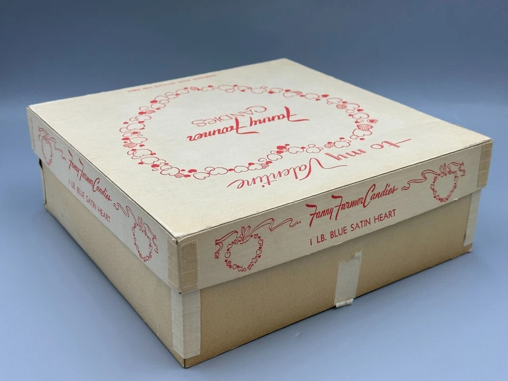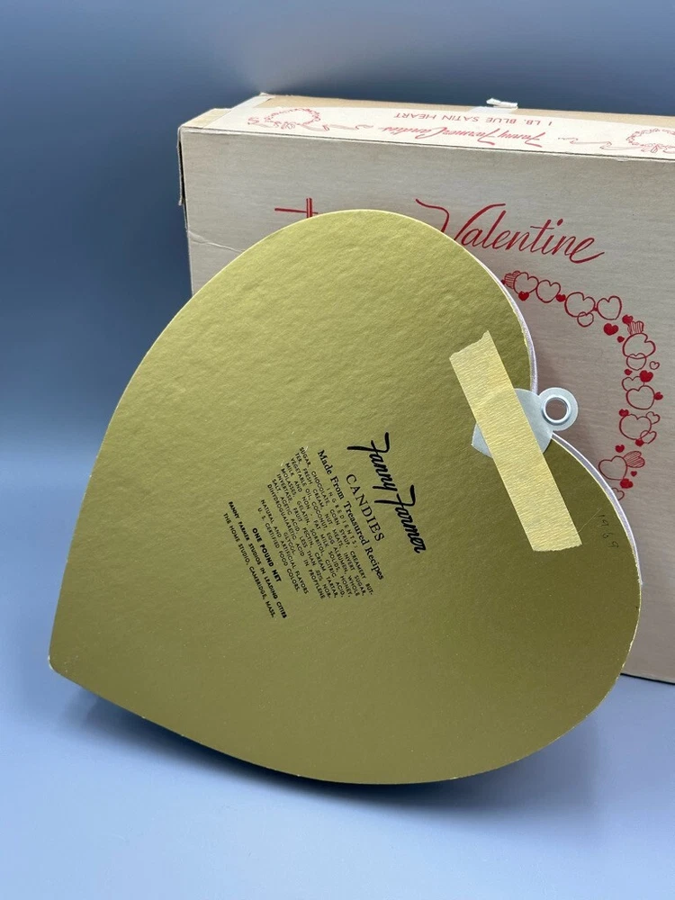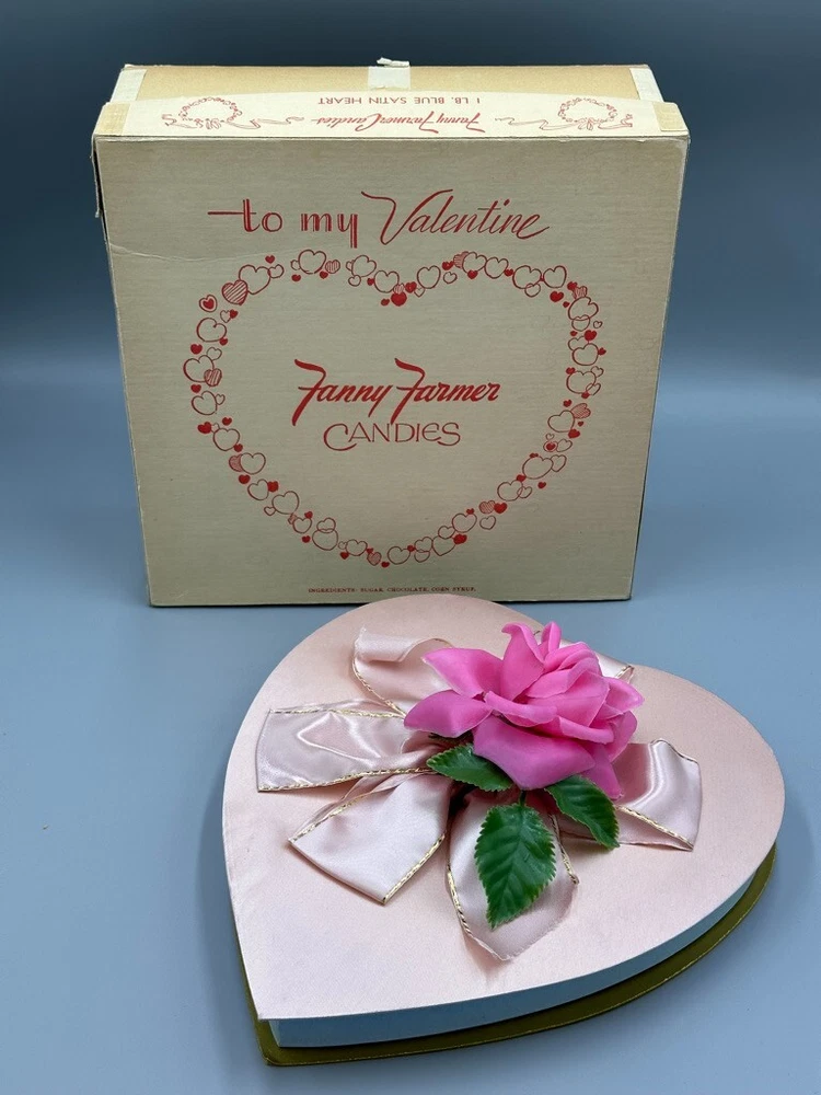 Vintage original 1969 Fanny Farmer 1 lb. pink Satin and Rose Heart Valentine chocolate candy box with outer box for blue satin heart. Heart is 9 1/4 by 10 inches. Light soil and wear. A hanger is taped to the back of the box. 1969 inked on the back of the box. The outer box was intended for a blue satin heart and contains a pink satin heart. Please see photos for condition. Guaranteed old and original.