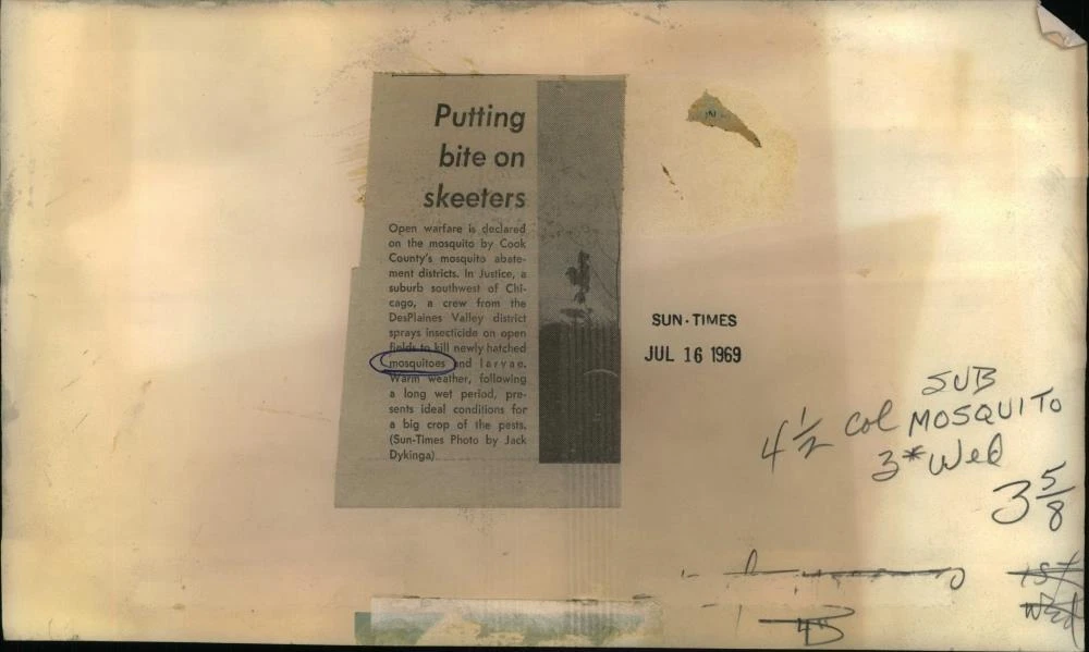 ebay template Note: Please study the images carefully to determine the condition of this vintage photograph, as it may not be in perfect condition. It may contain wrinkles, cracks, and possibly even tears due to its age and how it was handled before it got to us. A scanner may interpret colors and contrast differently than human eyes will, so it is possible that the actual photograph may be slightly darker or lighter in person. This vintage photograph is offered for sale as a collectible item and conveys no transfer of copyright. 1969 Press Photo Crew sprays insecticide to kill larvae - RRU27573 This is an original press photo. Open warfare is declared on the mosquito by Cook County's mosquito abatement districts. A crew sprays insecticide on open fields to kill newly hatched mosquitos and larvae. Photo measures 16.75 x 10 inches. Photo is dated 07-07-1969. PHOTO FRONT PHOTO BACK Historic Images Part Number: RRU27573 FAQs Q: Can I just download a digital version instead? A: No, we sell only vintage originals and do not make or distribute any copies, including digital ones. Q: Do you combine shipping and invoices? A: Multiple photos won on the same seller ID combine automatically through the eBay checkout process. If you encounter problems with this, send us a message via eBay messaging and we will send you an invoice. Due to eBay limitations, we cannot combine items won on our different seller IDs for a single shipping charge. Q: How quickly do you ship the items once paid? A: We ship within one business day after your payment clears. If you do not receive an "order shipped" email from us by the close of the second business day from submitting payment, please e-mail us via eBay messaging. Q: How do you make sure my photograph arrives safely? A: We package each order between two cross-corrugated pieces of cardboard to ensure that the package is as difficult to bend as possible. We then wrap each order in a plastic sheet to help protect against moisture. We want you to rest assured that we take every precaution to ensure that the photograph you receive will be in the same condition in your care as it was in ours. Q: Will the "Historic Images" watermark be on my photo when I receive it? A: No. This is a digital watermark we use to protect our images. It is not printed on the photo. Q: What are your office hours? A: eBay for us is a business, and a very fun one to be in! We are open M-F 9 to 5 (CST). Therefore, we do not return e-mails and phone calls over the weekend. We observe the following holidays: New Years Day, Memorial Day, Fourth of July, Labor Day, Thanksgiving and the day after Thanksgiving, Christmas Eve and Christmas Day. Q: Where did all these vintage photos come from? A: These original vintage photographs are from various news service and newspaper photo archives from locations around the country including: Boston, Detroit, Tampa, Chicago, Denver, Seattle, New Orleans, Milwaukee, Portland, Spokane, and more. We do not copy or reproduce any photographs -- every item is a unique vintage piece that was housed in a news archive. Q: Can I use this photograph in my book/blog/website? A: The short answer is no. There is no transfer of copyright for republication or reproduction with these photographs when you purchase them, and only photographs taken before 1923 are currently automatically in the public domain. Permission from the copyright holder, which usually can be identified from the back of each photo, must be sought to republish or reproduce the image for any purpose. Q: Do you relist items (in case I miss an auction ending)? A: Auction items that receive no bids are relisted in our store (historicimages-store on eBay) as a fixed-price item and at a higher price than the starting auction price. Q: Do you leave feedback? A: Yes, we always leave feedback for buyers. Our software monitors when our buyers leave us feedback, then notifies us that we can leave feedback for the buyer. Rest assured, if you leave feedback, we will do the same! Check out our family of eBay IDs: historicimages01 Sports Photos historicimages02 Entertainment Photos historicimages03 Americana Photos historicimages04 International & War Photos historicimages05 Transportation Photos historicimages-store Our largest fixed-price selection historicimages-market Hand-picked photos and our New Orleans collection historicimages-gallery Hand-picked photos Saturday night auctions About Us Historic Images was formed in September 2009, with a handful of scanners working out of a basement to digitize newspaper photo archives. We have since moved out of the basement, and we can now archive thousands of photos per day. Our company has worked with magazines and newspapers from Detroit, Boston, Denver, Seattle, Tampa, Chicago, and New Orleans, just to name a few. We are constantly adding to our inventory, and have assembled an archive of millions of photos to date. As our company evolved, we began our eBay business, which brings thousands of fresh auctions per week to the world's largest online auction marketplace. Our custom software systems and team of great employees allow us to efficiently scan and sell large photo archives online. At the very core of our company's DNA is a strong commitment to customer satisfaction and strict integrity for our product. Our promise to you is that we will do everything in our power to provide you a great buying experience. Copyright 2009 - Present, Historic Images, Inc. Sell Smarter with Kyozou. Inventory and Ecommerce Management