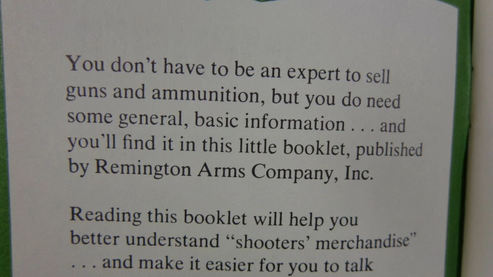 1969 Remington Arms and Ammo Selling Simplified Booklet 9 X 3 3/4 INS. - 16 PAGES Arms and Ammo Selling Simplified Booklet - A GUIDE FOR RETAIL PERSONNEL - REMINGTON = DUPONT THIS IS REALLY SALEMAN POCKET GUIDE EXPLAINING DIFFERENTS BETWEEN RIFLES AND SHOTGUNS - DIFFERENT TYPES AMMO (RIFLE - SHOTGUNS ETC) GOOD CONDITION - SHOW SOME AGING AND WEAR GSM05
