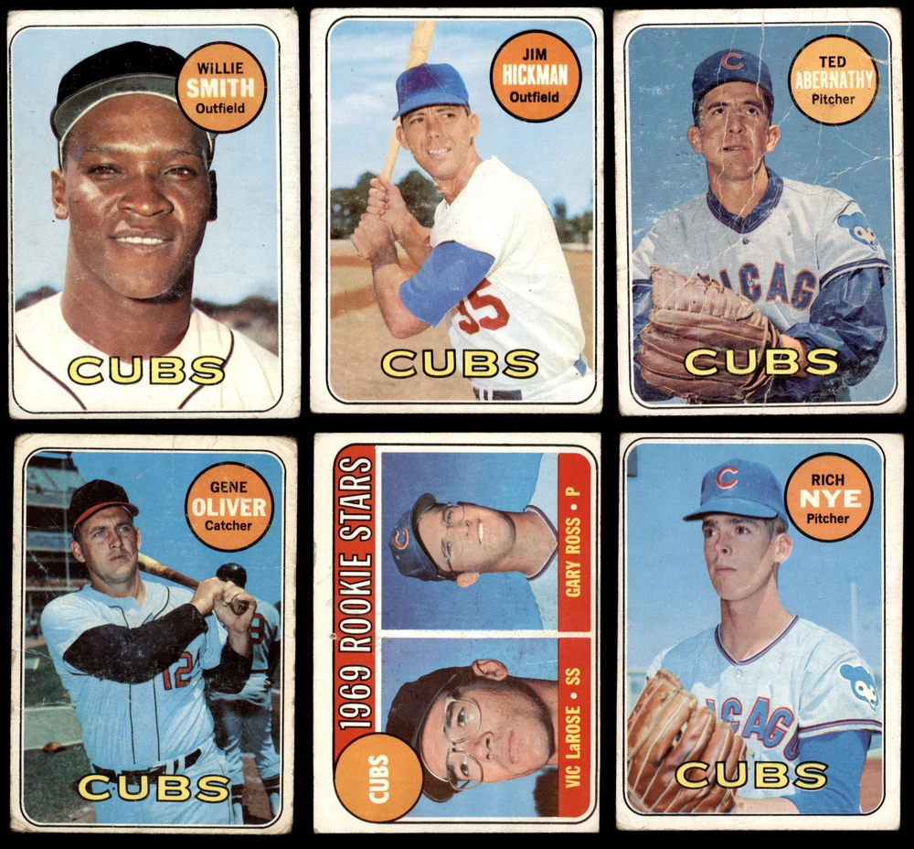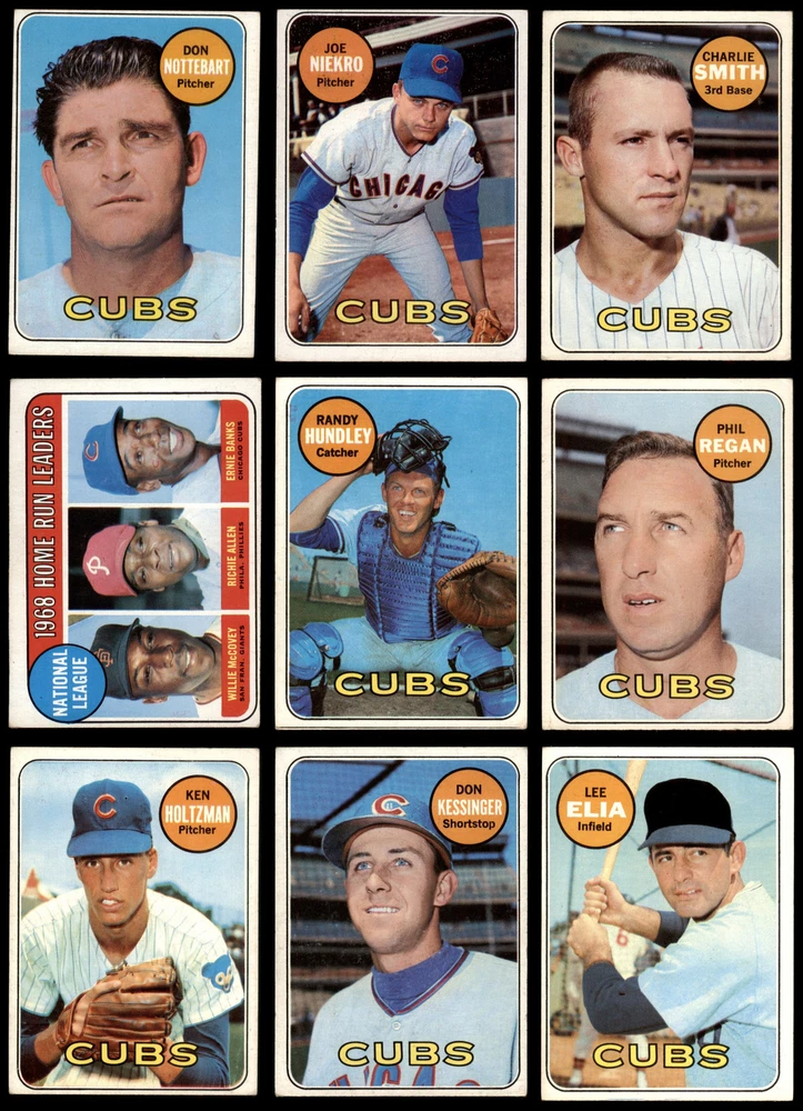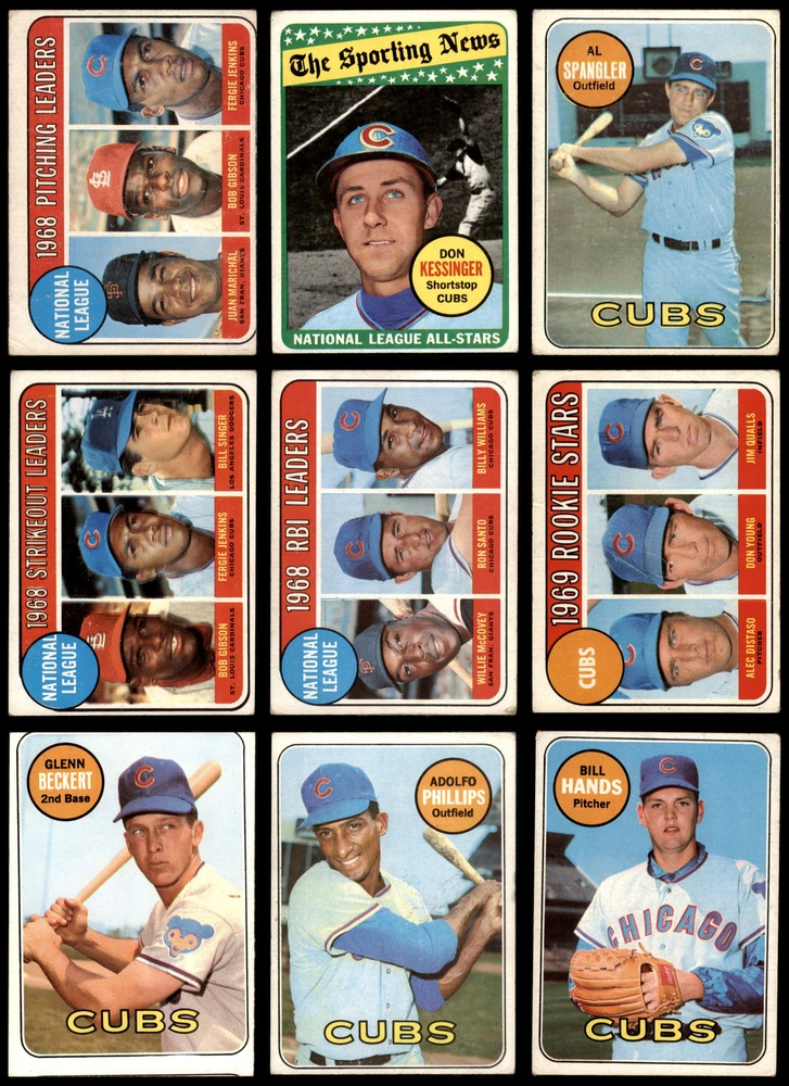This set contains the following cards 1969 Topps #4 - Willie McCovey / Ron Santo / Billy Williams NL RBI Leaders 1 - POOR Front Back 1969 Topps #6 - Willie McCovey / Rich Allen / Ernie Banks NL HR Leaders 2 - GOOD Front Back 1969 Topps #10 - Juan Marichal / Bob Gibson / Fergie Jenkins NL Pitching Leaders 2 - GOOD Front Back 1969 Topps #12 - Bob Gibson / Fergie Jenkins / Bill Singer NL Strikeout Leaders 3 - VG Front Back 1969 Topps #20 Ernie Banks 1.5 - FAIR Front Back 1969 Topps #43 Joe Niekro 4 - VG/EX Front Back 1969 Topps #63 Jim Hickman 1.5 - FAIR Front Back 1969 Topps #88 Rich Nye 1.5 - FAIR Front Back 1969 Topps #115 Bill Hands 2 - GOOD Front Back 1969 Topps #147 Leo Durocher 3 - VG Front Back 1969 Topps #171 Glenn Beckert 2 - GOOD Front Back 1969 Topps #198 Willie Smith 1 - POOR Front Back 1969 Topps #225 Don Kessinger 3 - VG Front Back 1969 Topps #247 Gene Oliver 1 - POOR Front Back 1969 Topps #268 Al Spangler 1.5 - FAIR Front Back 1969 Topps #288 Ken Holtzman 2 - GOOD Front Back 1969 Topps #312 Lee Elia 4 - VG/EX Front Back 1969 Topps #347 Randy Hundley 3 - VG Front Back 1969 Topps #372 Adolfo Phillips 2 - GOOD Front Back 1969 Topps #404 - Gary Ross / Vic LaRose Cubs Rookies 1.5 - FAIR Front Back 1969 Topps #420 - Ron Santo All-Star 1.5 - FAIR Front Back 1969 Topps #422 - Don Kessinger All-Star 2 - GOOD Front Back 1969 Topps #450 Billy Williams 1.5 - FAIR Front Back 1969 Topps #483 Ted Abernathy 1 - POOR Front Back 1969 Topps #535 Phil Regan 4 - VG/EX Front Back 1969 Topps #538 Charlie Smith 3 - VG Front Back 1969 Topps #570 Ron Santo 3 - VG Front Back 1969 Topps #593 Don Nottebart 3 - VG Front Back 1969 Topps #602 VIS - Alec Distaso / Don Young / Jim Qualls Cubs Rookies 1 - POOR Front Back 1969 Topps #640 Fergie Jenkins 2 - GOOD Front Back This 1969 Topps Chicago Cubs Team Set contains the 1969 Topps Cubs baseball cards and makes a great gift for any Cubs fan. ?With an inventory of over 15,000 team sets, Dean's Cards has Team Sets & Near Team Sets for just about every team, in multiple conditions, for all sports, for most major sets issued between 1909 and 1979. This 1969 Topps Chicago Cubs Team Set includes all the Cubs cards for that memorable year in which the Cubs infamously blew a 7 1/2 game lead in the last month of the season.? The 1969 Cubs Team Set includes the 5 cards of future Hall-of-Fame players, two Cubs that have all-star cards and the 4 league leaders cards with Cubs on them. The lovable, but unlucky Cubs were loaded with talent, but were only team. not to win a pennant in the highly competitive National League of the 1960s, with the exception the expansion Houston Astros.
