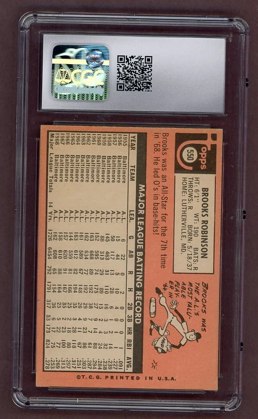 This is a rare and valuable Brooks Robinson 1969 Topps High # 550 sports trading card, featuring the legendary baseball player. The card is a must-have for any serious collector, and comes with a bonus 1970 Sporting News All-Star card. By all accounts the greatest third baseman to ever play the game, Brooks played his entire 23-year career with the Orioles from 1955-1977. An eighteen-time All-Star who won sixteen consecutive Gold Glove Awards, he helped lead the Orioles to World Series Championships in 1966 and 1970.