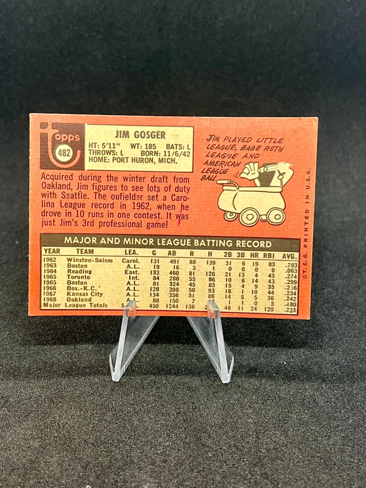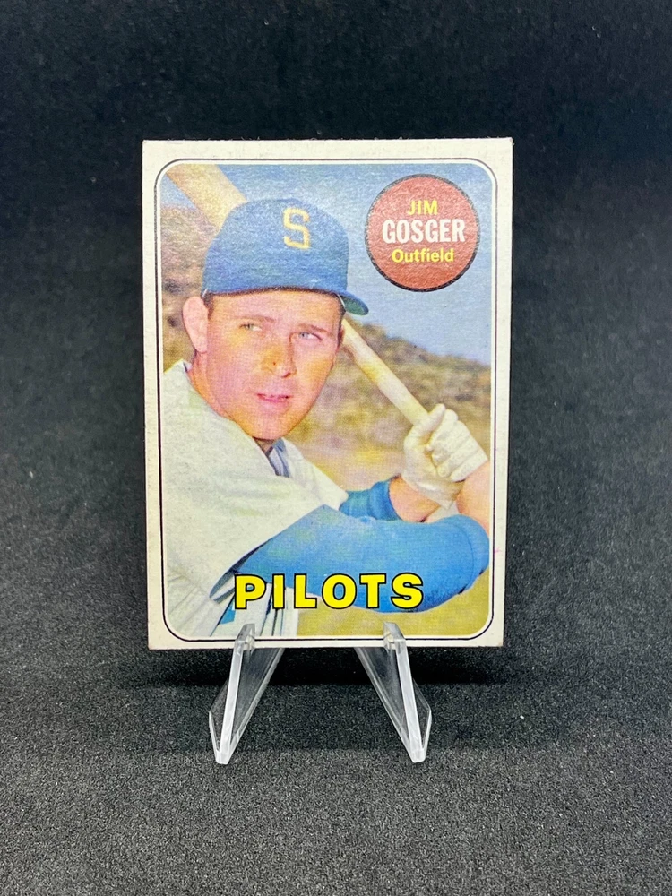 This is a 1969 Topps baseball trading card featuring Jim Gosger of the Seattle Pilots. The card is part of the standard size set and is made of card stock. It is a vintage card from the Major League Baseball season of 1969, with Gosger's first name and position highlighted in yellow on the front. The card is not autographed and was manufactured in the United States by Topps.