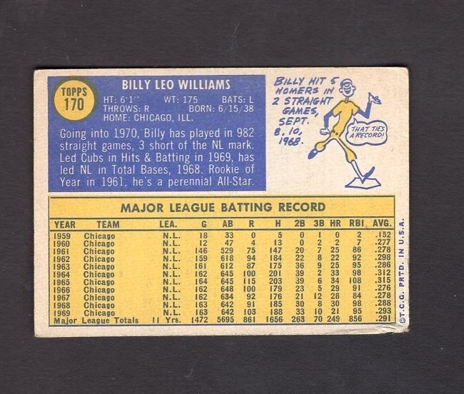 1970 Topps #170 Billy Williams Chicago Cubs Fair Condition Free Shipping