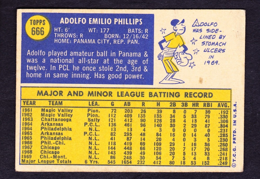 1970 TOPPS #666 ADOLFO PHILLIPS MONTREAL EXPOS . CARD HAS NO CREASE. FREE SHIPPING. Inventory #210904