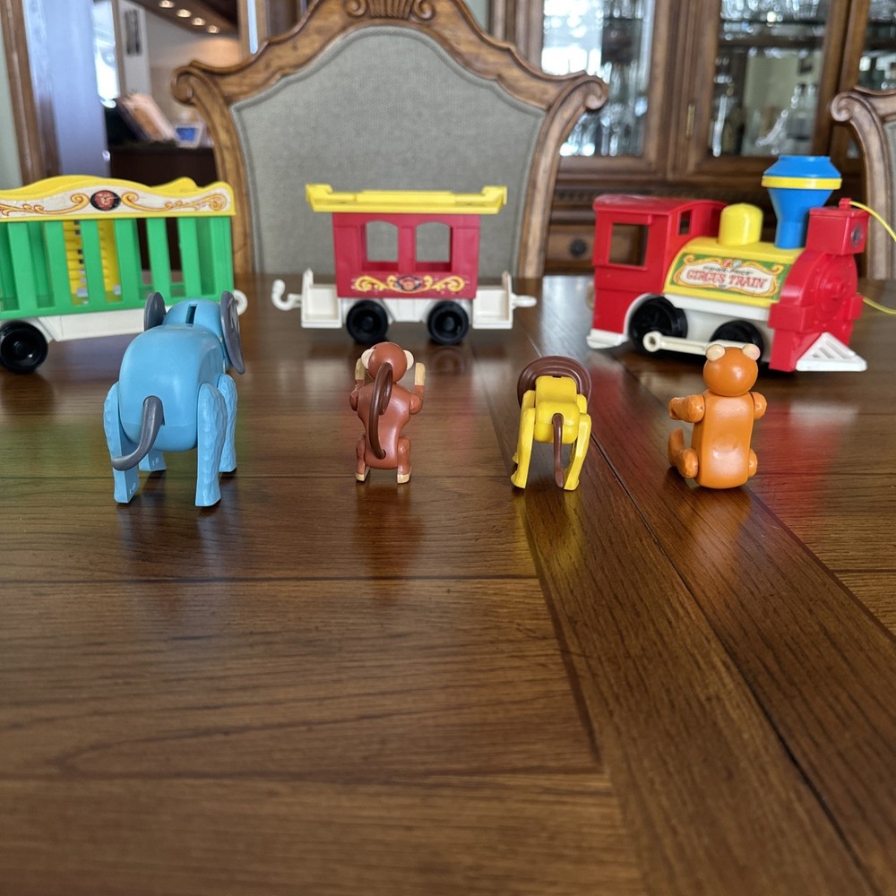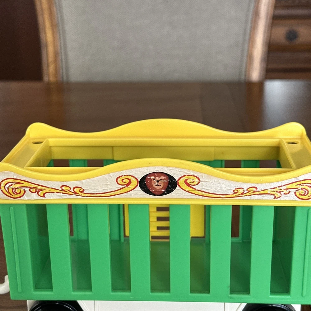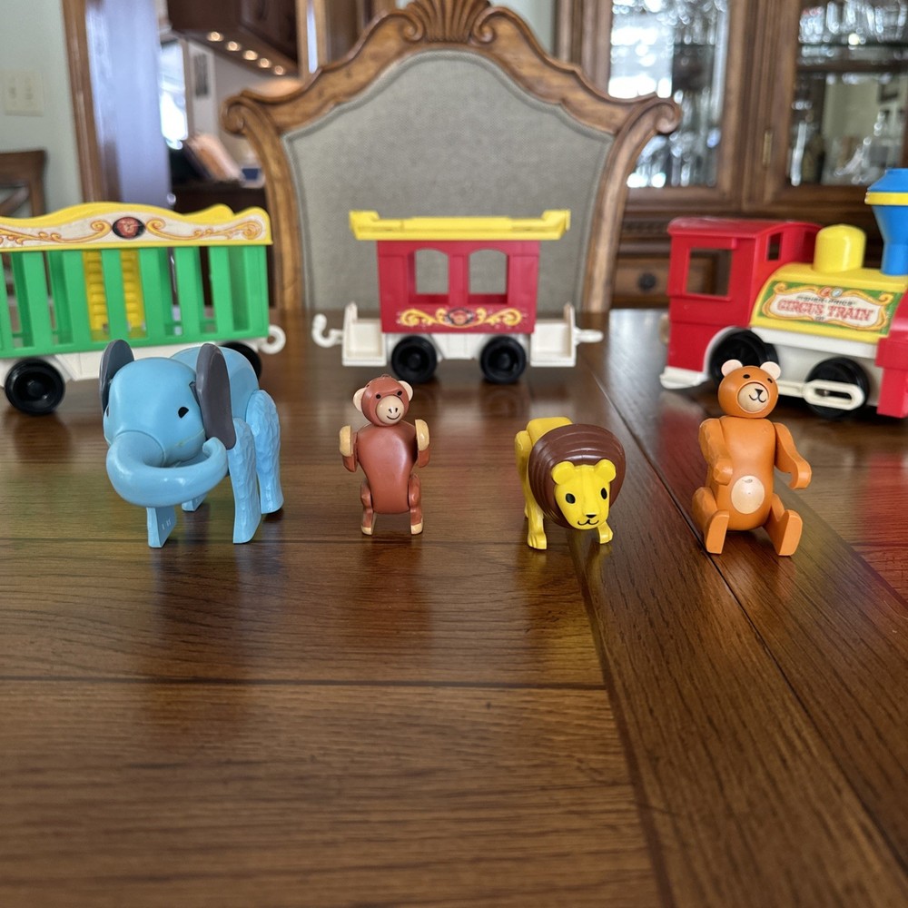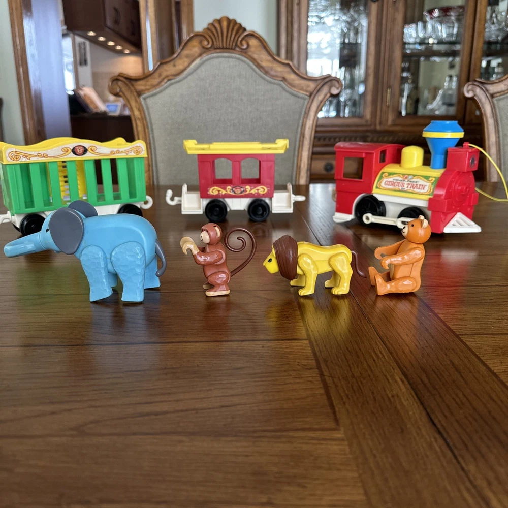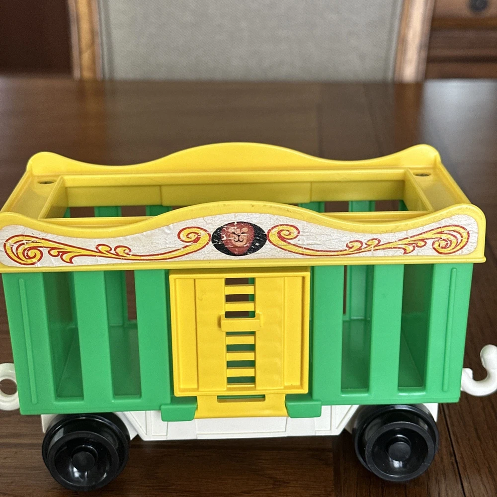 This vintage Fisher Price Little People play set is from the 1970s, featuring a Circus Train with zoo animals and circus-themed Little People. This set includes Three train cars - red engine, green cage car, red car with seats The engine car’s push down horn whistle works! Four animals - bear, monkey, lion, elephant Six people - ring master, 4 clowns, engineer The set is in great shape for its age! Notable exceptions include faded , missing, and worn stickers, rust on car metal fasteners, staining on elephant. The Little People are in excellent condition! See photos! Comes with everything in pictures.