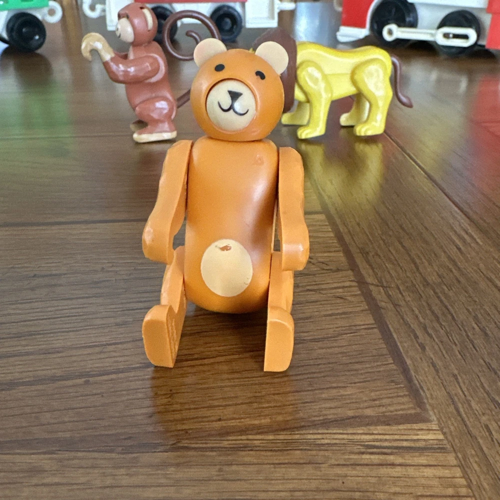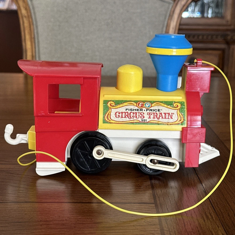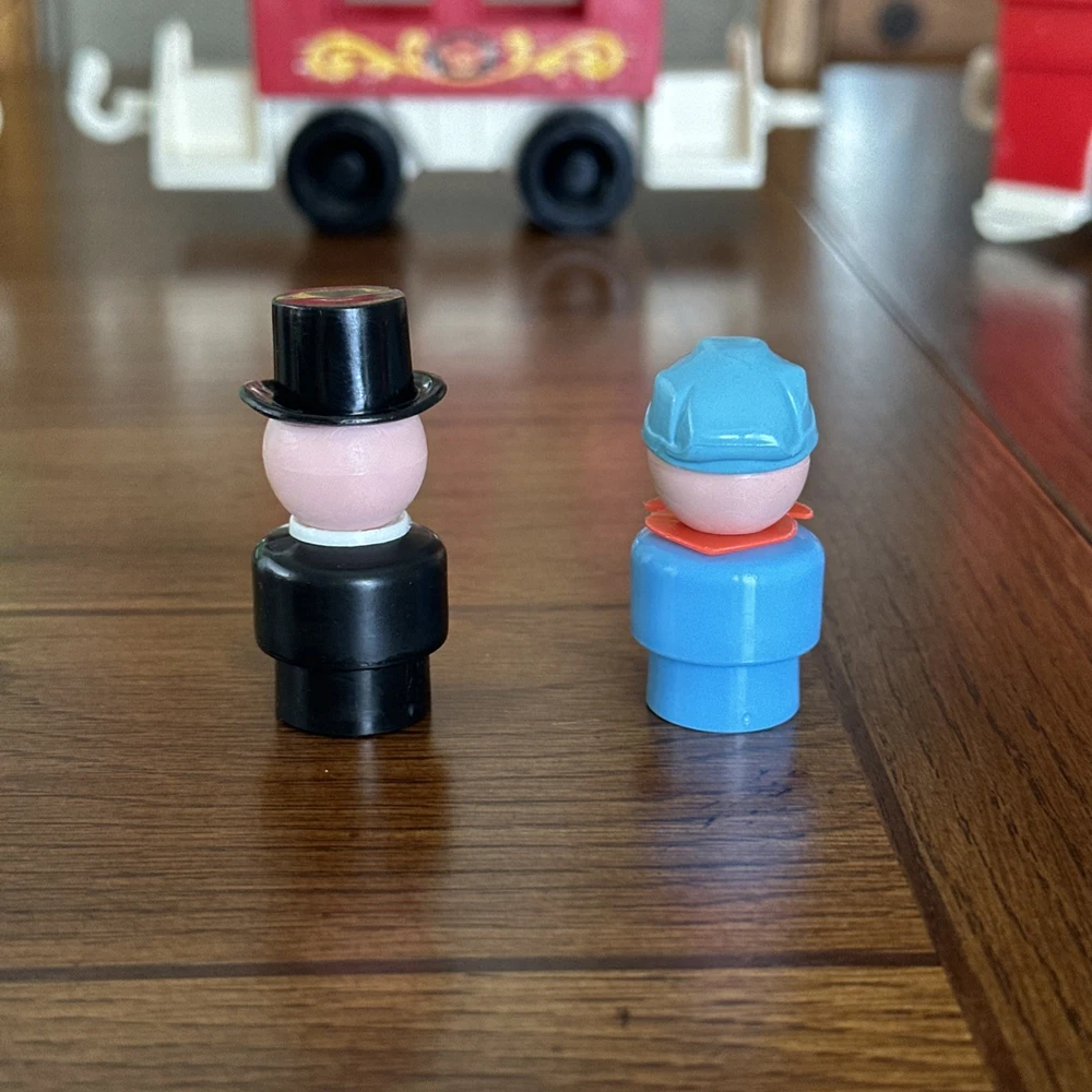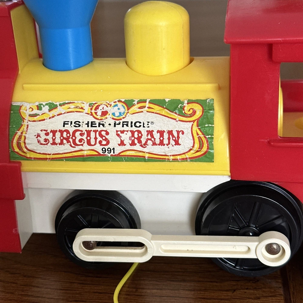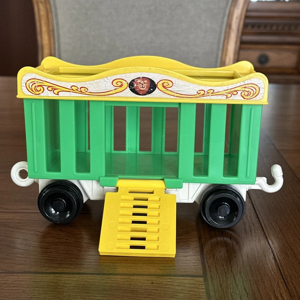 This vintage Fisher Price Little People play set is from the 1970s, featuring a Circus Train with zoo animals and circus-themed Little People. This set includes Three train cars - red engine, green cage car, red car with seats The engine car’s push down horn whistle works! Four animals - bear, monkey, lion, elephant Six people - ring master, 4 clowns, engineer The set is in great shape for its age! Notable exceptions include faded , missing, and worn stickers, rust on car metal fasteners, staining on elephant. The Little People are in excellent condition! See photos! Comes with everything in pictures.