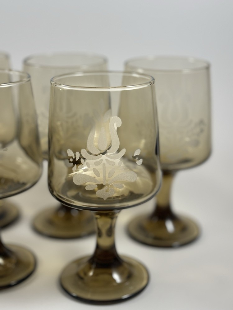 1970s Pfaltzgraff Village Brown Glass Pedestal Wine Glasses Set Of 7.