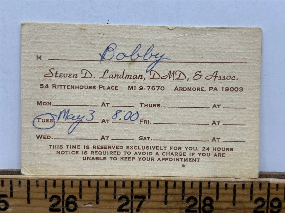 Original: 1970s Steven Landman Doctor Appointment Card Ardmore PA Vintage. Please see the photographs for a detailed description as it will show most blemishes that the item has. Free shipping to all US addresses. Please note, my schedule only allows me to ship once a week (Usually close orders out at 5PM on Tuesdays and ship Wednesday Mornings), If you buy on Wednesday, it most likely not ship until the following Wednesday. It can take up to 5 business days for your item to ship, or it can ship the next day if you purchase on a Tuesday. I apologize in advance, and I beg for your patience, being on the road allows me to find these few and far between items. Please let me know if you need it by a deadline for a birthday or something and I'll see what I can do. For international buyers, please inquire about shipping if the shipping is showing above $24, the prices listed are default 4lbs priority and most likely is way above what it actually costs to ship. Powered by SixBit's eCommerce Solution