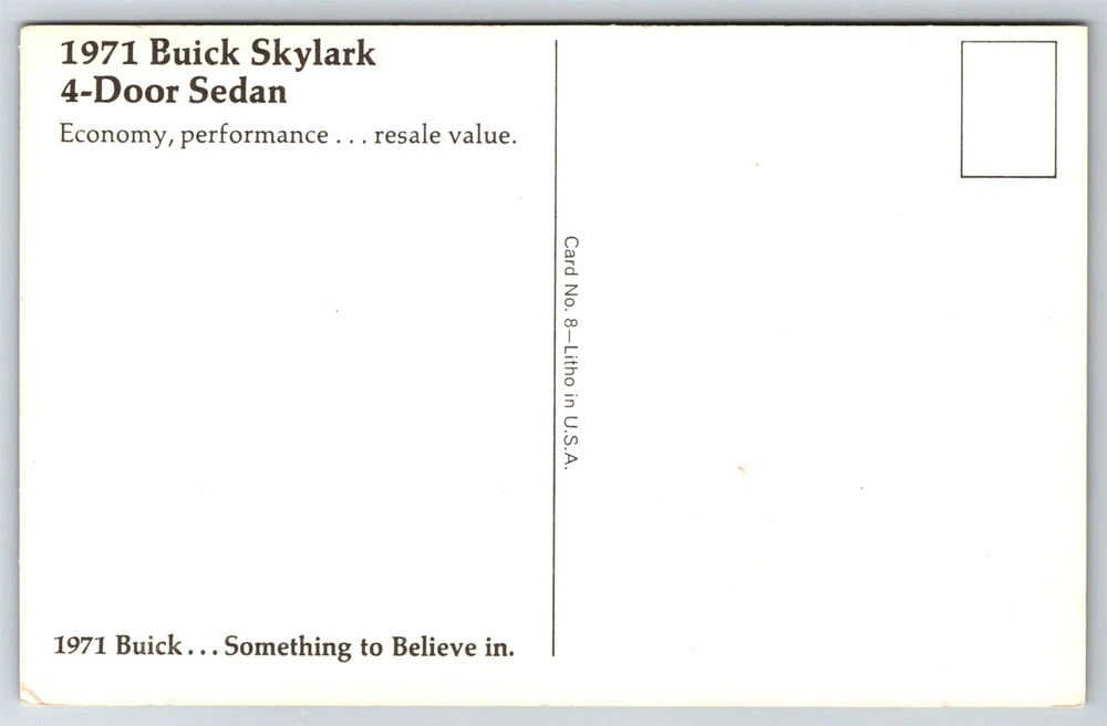 1971 Buick Skylark 4 Door Sedan Family Car General Motors Postcard Y13 Thank you for visiting! This is a standard size postcard, 3.5" X 5.5". In stock, usually ships within 24 hours of your purchase. Please ask questions if you are unsure about anything. Our goal is for your complete satisfaction with the postcard and your experience. Check all my other listings in my store. RETIREDWITHBOOKS Powered by SixBit's eCommerce Solution