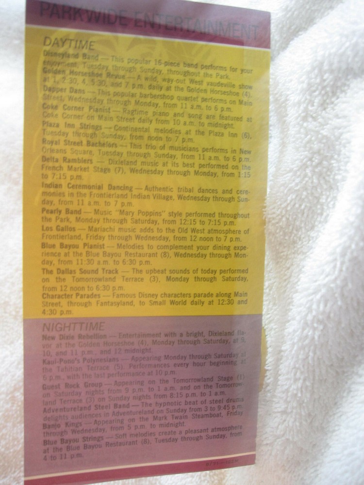 Here is a wonderful 1971 Disneyland Entertainment guide folder for your Disney collection! It is in good condition with creases, surface wear, edge tears, stains, edge wear, and some marks. It still has bright colors. Item is sold “as is”. I try to describe my items as accurately as possible. Please email me with any questions before bidding. NO INTERNATIONAL BIDDERS PLEASE Winning bidder to pay by PayPal within 3 days after the end of the auction. Buyer must have a confirmed PayPal shipping address. Shipment will take place after receipt of cleared payment. I will package your item carefully for shipment. THANK YOU FOR LOOKING! PLEASE LOOK FOR MY OTHER DISNEYLAND AUCTIONS! I AM ALWAYS HAPPY TO COMBINE ITEMS FOR SHIPMENT TO SAVE YOU MONEY