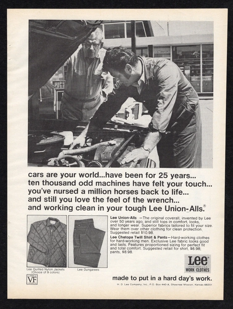 Color: Black and White Time Period Manufactured: 1970-79 Brand: Lee Union-Made U.S.A. Work Clothes – Made to put in a hard day’s Type of Advertising: Print Ad