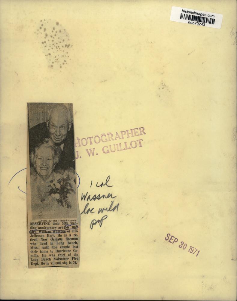 ebay template Note: Please study the images carefully to determine the condition of this vintage photograph, as it may not be in perfect condition. It may contain wrinkles, cracks, and possibly even tears due to its age and how it was handled before it got to us. A scanner may interpret colors and contrast differently than human eyes will, so it is possible that the actual photograph may be slightly darker or lighter in person. This vintage photograph is offered for sale as a collectible item and conveys no transfer of copyright. 1971 Press Photo Mr. and Mrs. William Wassner celebrate 50th Wedding Anniversary This is an original press photo. Observing their 50th wedding anniversary are Mr. and Mrs. William Wassner of 5105 Jefferson Highway. He is a retired New Orleans fireman who lived in Long Beach, Mississippi, until the couple lost their home in Hurricane Camille. He was chief of the Long Beach Volunteer Fire Department. He is 71 and she is 70. Photo measures 8 x 10 inches. Photo is dated 09-30-1971. PHOTO FRONT PHOTO BACK Historic Images Part Number: noo70243 Sell Smarter with Kyozou. Inventory and Ecommerce Management