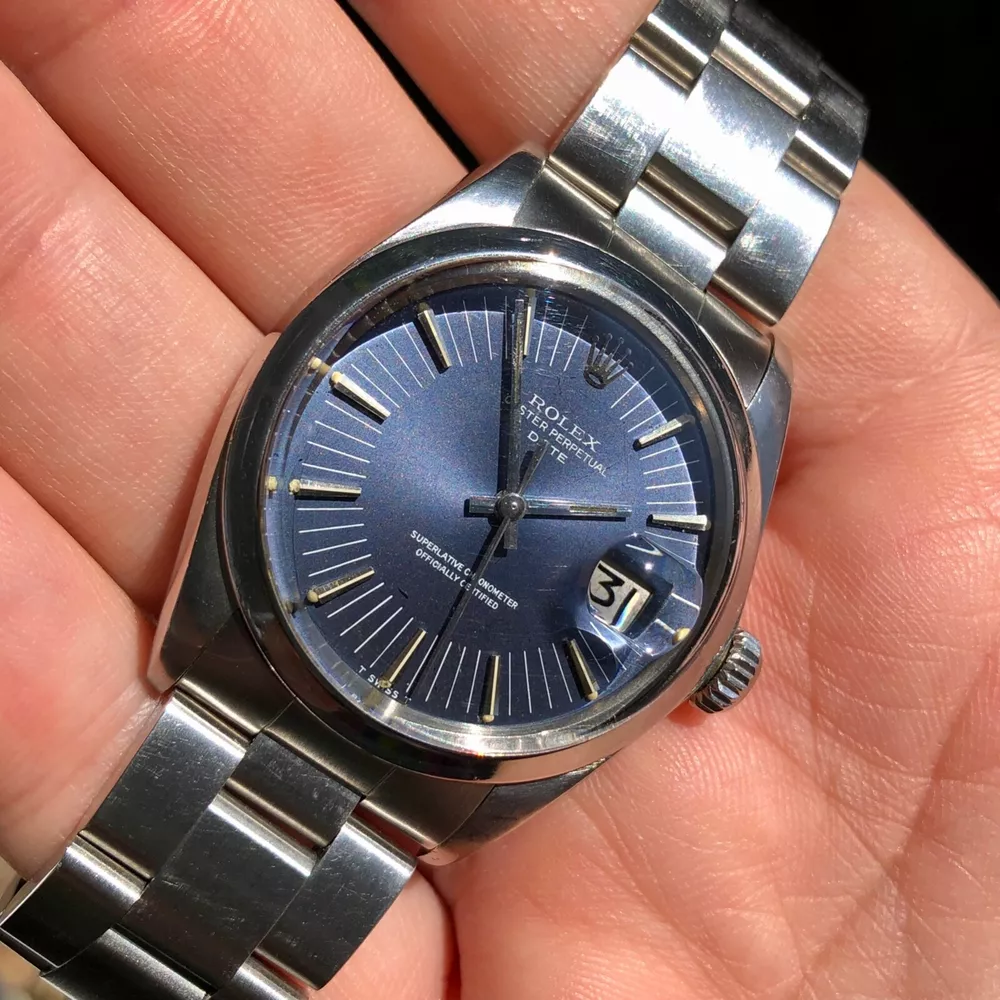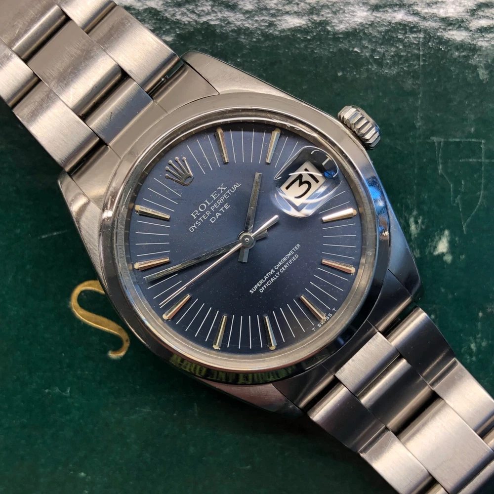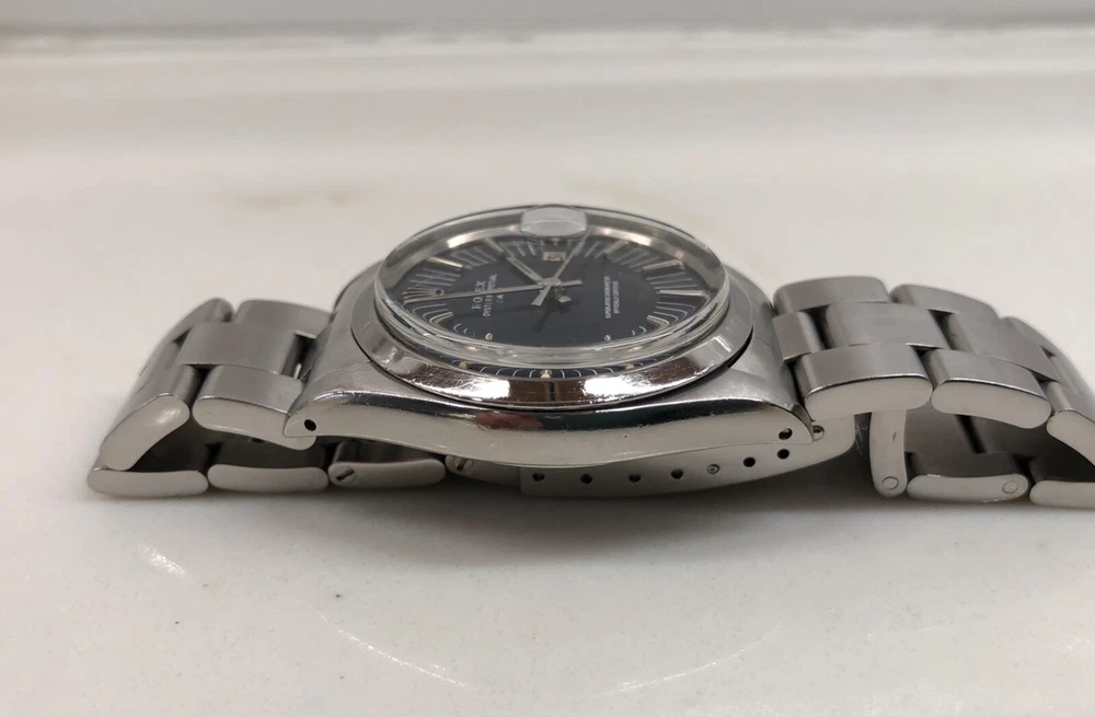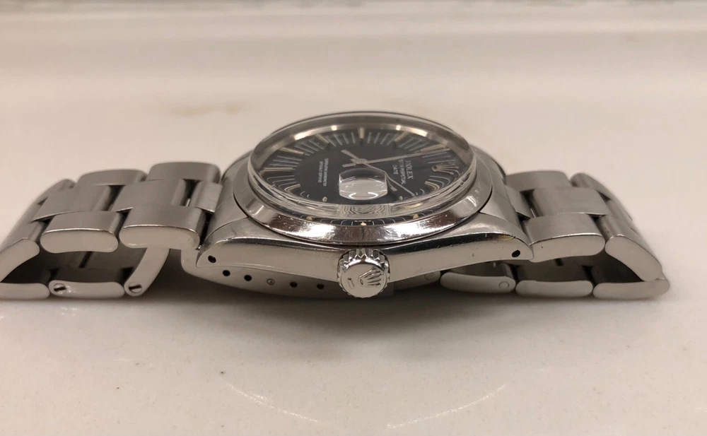 Manufacturer: Rolex Model Name: Date Ref #, Serial #, Circa: 1500, 278XXXX, 1971 Case: Stainless Steel Oyster Case Movement: Oyster Caliber 1570 Automatic Movement Case Dimensions: 34mm excluding Crown Bracelet: Stainless Steel Oyster Bracelet Dial: T Swiss Made T Signed Blue Radial Dial Bezel: Stainless Steel Smooth Bezel Accessories: None 100% Authentic! Description: A highly attractive and beautiful 1971 Rolex Date 1500 Radial Dial Stainless Steel Automatic Wristwatch. Stainless steel Oyster case is great and has remained thick and full bodied. Some light natural wear in keeping with age and usage. Original and very rare radial dial is very nice and has a slight violet hue. Some light wear in keeping with age and usage present. Luminescent plots reacts to UV light and fade at same pace. Stainless steel 78350 Oyster bracelet with 557B end pieces is great, includes 11 full links, and is date coded to 1995. Oyster Perpetual Caliber 1520 automatic movement is running and functioning. Any and All Questions Please Ask! International Buyers Please Inquire For Shipping. Sales Tax Applies eBay Regulated States. DISCLAIMER Five star feedback is greatly appreciated! I will always return the favor when 100% positive feedback has been received! If there is an issue please contact me and I will help you resolve the problem. I strive to keep my 100% rating so always contact me first! When you place a bid you are entering into a contract with myself (Hashtagwatchco). You are also agreeing to all terms listed in the auction or “Buy it Now” price. Failure to uphold the terms of the contract will result with you being notified to eBay and any other entity involved of said failure. All Items are sold AS-IS . If an item is being sold as “PRE-OWNED”, the item will have some signs of use and wear on it, I.E. scratches and marks. Anything mentioned in the text is considered disclosed to the buyer. You are responsible for reading the complete text, including this disclaimer. Anything visible in the images is considered disclosed to the buyer. You are responsible for viewing and enlarging all images. The photographs are NEVER edited. Unedited photographs often disclose condition far better than verbiage as many people have different ideas on what terms may mean. You have enlarged the full set of complementary photographs. Our images are unedited in order to represent the item as accurately as possible to the buyer. Images disclose identifying marks, inclusions or defects. As per the responsibility of the buyer, you have three (3) days from date of delivery to fully inspect the item and ensure it is as described. If there is no communication of any kind after the third day we will accept the fact that you are happy with the item. Whether feedback is left or not, we will accept the fact that the item was delivered and inspected successfully by the buyer within the inspection timeframe. We do not guarantee waterproofness on pre-owned watches. If you have any questions over an item please message me BEFORE you place a bid or purchase an item. Shipping: I will ship the item out within the stated handling time and one day of cleared payment. Shipping prices are to cover the costs of insurance and possible signature confirmations. I normally ship higher price items via UPS Next Day or 2nd day Air. I am not responsible for any customs or duty fees/ delays in customs checks. Any item purchased internationally that exceeds 250.00 USD including the shipping cost must have a signature confirmation. I can only use UPS services for anything over 250.00USD internationally. If you opt out of the signature confirmation and would like to use USPS to keep the shipping cost lower you wave all insurances, lost packages, and damage to the given item. I will not be held responsible for the given reasons or other reasons that could possibly come up. I am not affiliated in any way with any of the brands presented.
