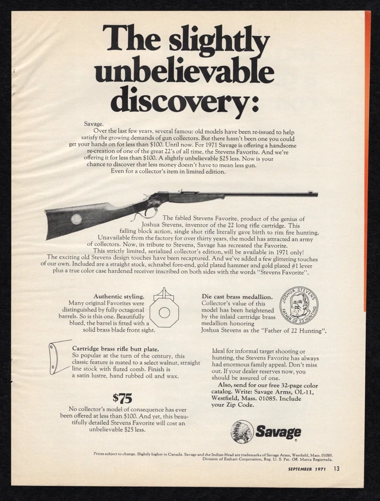 19 71 Savage Arms Guns Slightly Unbelievable Discovery Cost Less Money Print Ad Suitable for Framing This is an original Ad removed from its original magazine. Ad Description/Company Name : Side 1 : Savage Arms Guns – We Cost Less Money The Slightly Unbelievable Discovery: A Savage gives you everything you want. Without costing everything you’ve got. 3 Pages of themed (slightly unbelievable) Savage ads, each ad on it’s own single page, so you can display all three pages side by side by side. Side 2 : On the back: page 1: No Ads page 2: North American School of Conservation page 3: English Leather Shave Cream and After Shave Publication Date: 19 71 September Publication Name: Outdoor Life Magazine Size: Approx 8 ¼” x 1 1 ” Condition : Used. These are original pages from original magazines. They are very old, and usually stored in less-than-perfect environments. F oxing, fading, discoloration are common and present to some degree . Also staple holes, corner folds, edge damage, creases, ripples, scuffs , smudges and other imperfections are normal . Pages may show pressure marks from production or years of storage . Images are NOT matted or framed. I only trim the spine edge , leaving the other three sides untouched. The images are the EXACT SAME PAGE BEING SOLD, AS IS . PLEASE EXAMINE CLOSELY AND MAKE YOUR OWN JUDGMENT. NOTE: Ripples. Your satisfaction guaranteed. If you have any questions or qualms, feel free to ask! Magazine ads are shipped in: 2-mil Clear Polypropylene Magazine Bags with a white backer board, in a Rigid Mailer, in a sealed Poly Mailer, marked "Handle With Care, Do not Bend" and shipped USPS. We DO combine shipping for multiple purchases!