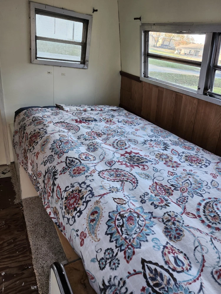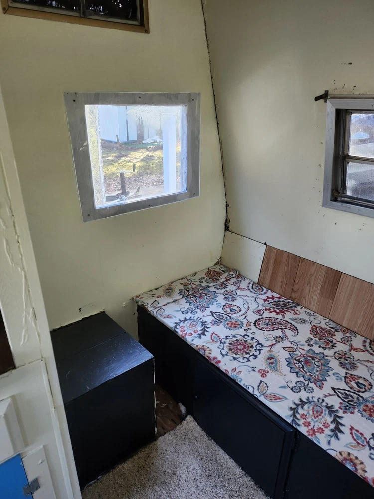 Has good tires, good floor, good roof. No leaks. Comes with a new portapotty, a new twin size Coleman air mattress, new carpet, and an electric heater. Interior height is 5 feet 10 inches. Space is open for a mini frig or something else you might want.