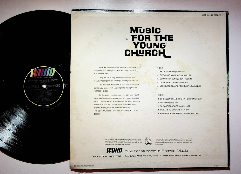 Yes we combine shipping for multiple purchases. Add multiple items to your cart and the combined shipping total will automatically be calculated. 1972 Music For The Young Church Christian Gospel Choir Vinyl LP Record VG+ Vinyl / Jacket Grade Per Goldmine Standard: VG+ / VG+ Here are 10 sparkling arrangements that were ,, composed and arranged for kids and sung by the Sing ’n’ Celebrate choir. They are fun to sing, fun to listen to, and are, in truth, message music. We hope you enjoy them a lot. The music on this album is available in one book called (you guessed it!) Music For The Young Church. (#37614 —$1.95) By the way, if you like what you hear—and would like to perform these arrangements with your own group, the accompaniments that you hear on the album are now available at your local music store, Bible book store, or order directly from the publisher: Word, Inc., P.O. Box 1790, Waco, Texas 76703 (Catalog # D. T. 4- $15.00) SIDE 1 1. HE LIVES TODAY! (Allen) 3:47 2. GIVE JESUS A CHANCE (Harrell) 1:59 3. COMMUNION SONG (S. Salsbury) 2:18 4. LIKE A MIGHTY RIVER (Allen) 3:45 5. YOU ARE THE SALT OF THE EARTH (Butler) 2:11 SIDE 2 1. SINCE JESUS CAME INTO MY HEART (Allen) 2:26 2. WHO AM \ (Reid) 5:09 3. THE GREATEST GIFT (Perkins) 3:02 4. HE CAME TO GIVE LIFE (Parr) 3:08 5. BRING BACK THE SPRINGTIME (Kaiser) 3:03