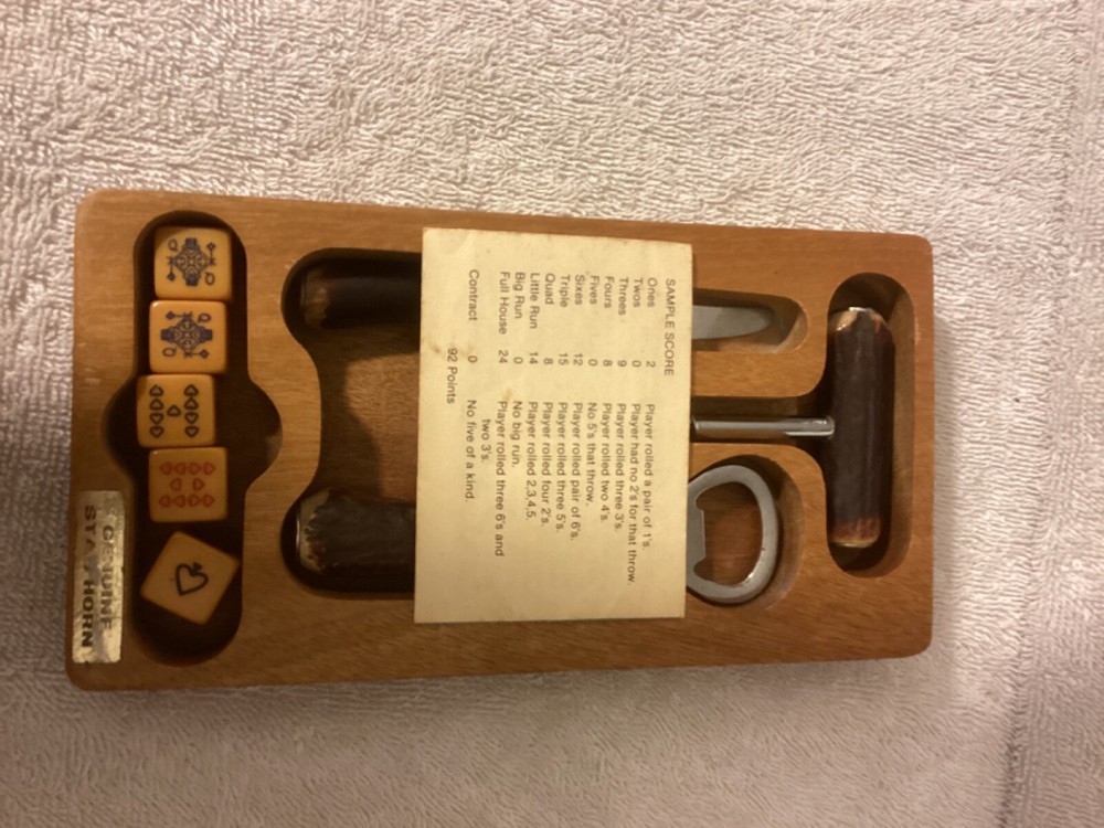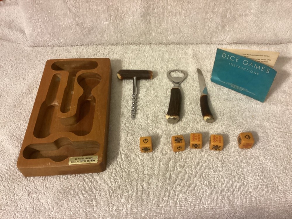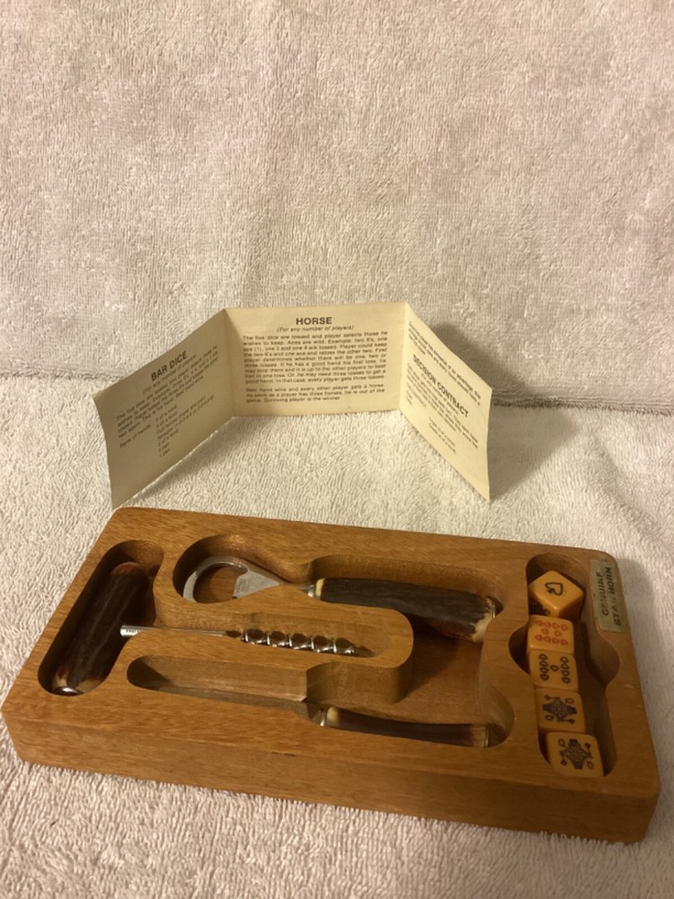 The 1972 Dice Bar Games Stancraft Wooden set features genuine Staghorn handles on various accessories, including a knife, bottle opener, and cork remover. This drinking game set is designed for entertaining gatherings and includes a wooden holder to keep everything organized during and after play. With a vintage charm and unique materials, this set provides a stylish and functional addition to any home bar or game night collection.