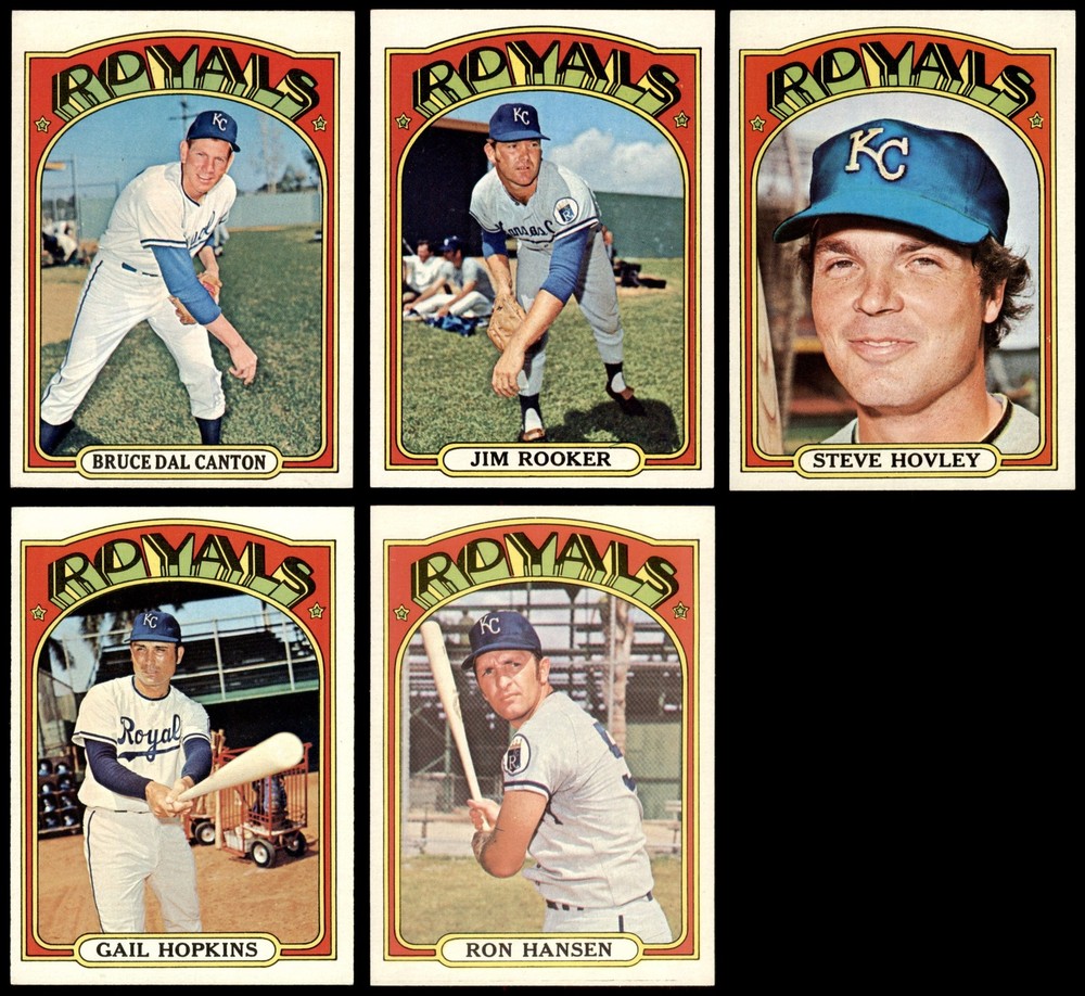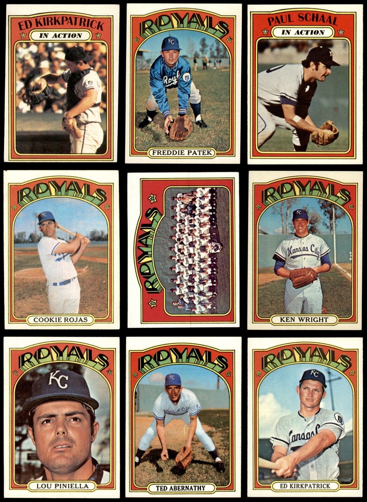 This set contains the following cards 1972 Topps #10 Amos Otis 6 - EX/MT Front Back 1972 Topps #57 Bob Oliver 6 - EX/MT Front Back 1972 Topps #68 Jim York 4 - VG/EX Front Back 1972 Topps #81 Mike Hedlund 5 - EX Front Back 1972 Topps #109 Jerry May 6 - EX/MT Front Back 1972 Topps #133 Joe Keough 6 - EX/MT Front Back 1972 Topps #177 Paul Schaal 6 - EX/MT Front Back 1972 Topps #178 - Paul Schaal In Action 5 - EX Front Back 1972 Topps #205 Dick Drago 6 - EX/MT Front Back 1972 Topps #246 Tom Burgmeier 6 - EX/MT Front Back 1972 Topps #273 Bobby Floyd 6 - EX/MT Front Back 1972 Topps #315 Paul Splittorff 7 - NM Front Back 1972 Topps #332 Buck Martinez 6 - EX/MT Front Back 1972 Topps #349 Al Fitzmorris 6 - EX/MT Front Back 1972 Topps #372 - Lance Clemons / Monty Montgomery Royals Rookies 6 - EX/MT Front Back 1972 Topps #373 John Mayberry 6 - EX/MT Front Back 1972 Topps #415 Cookie Rojas 6 - EX/MT Front Back 1972 Topps #449 Bob Lemon 7 - NM Front Back 1972 Topps #468 Richie Scheinblum 6 - EX/MT Front Back 1972 Topps #491 - Lou Piniella Boyhood Photo 6 - EX/MT Front Back 1972 Topps #519 Ted Abernathy 6 - EX/MT Front Back 1972 Topps #531 Freddie Patek 7 - NM Front Back 1972 Topps #569 Ed Kirkpatrick 6 - EX/MT Front Back 1972 Topps #570 - Ed Kirkpatrick In Action 4 - VG/EX Front Back 1972 Topps #580 Lou Piniella 6 - EX/MT Front Back 1972 Topps #617 Royals Team 6 - EX/MT Front Back 1972 Topps #638 Ken Wright 6 - EX/MT Front Back 1972 Topps #664 Bobby Knoop PSA 7 - NM Front Back 1972 Topps #683 Steve Hovley 6 - EX/MT Front Back 1972 Topps #717 Bruce Dal Canton 6 - EX/MT Front Back 1972 Topps #728 Gail Hopkins 6 - EX/MT Front Back 1972 Topps #742 Jim Rooker 8 - NM/MT Front Back 1972 Topps #763 Ron Hansen 7 - NM Front Back This 1972 Topps Kansas City Royals Team Set contains the 1972 Topps Royals baseball cards and makes a great gift for any Royals fan. ?With an inventory of over 15,000 team sets, Dean's Cards has Team Sets & Near Team Sets for just about every team, in multiple conditions, for all sports, for most major sets issued between 1909 and 1979. Set breakdown by grade: Number of Cards in Set 33 Average Grade - Weighted by Value 6.55 - EX/MT+ Average Grade - Unweighted 6.03 - EX/MT Grade Breakdown 8 - NM/MT 1 PSA 7 - NM 1 7 - NM 4 6 - EX/MT 23 5 - EX 2 4 - VG/EX 2 Dean's Cards offers a 100% Money Back Satisfaction Guarantee on all purchases. Just contact us within 10 days of the purchase date and we will refund your money or, when possible, replace the cards. 1972 Topps Kansas City Royals Team Set 6.5 - EX/MT+ 6909967 If the scan in the listing says ACTUAL IMAGE, you will receive the card pictured. For cards issued after 1983, we will often use representative images and you will not receive the exact card pictured. Shipping Policy You only pay shipping on the first item. If you order multiple items on the same order, you will only be charged once for shipping. We do not combine shipping on multiple orders. To avoid multiple shipping charges we recommend using eBay's "Add to Cart" feature to check out multiple items in one transaction, or please request and allow for us to send an invoice to reflect the combined shipping charges. Canadian customers - We send all of our Canadian/International packages with tracking and cannot make any exceptions to this policy. Negotiating Prices All prices are final and we do not negotiate. This policy is to ensure that everyone knows that they are getting our best possible price. So please do not ask us to negotiate on price. Return Policy Dean's Cards has a 100% Money Back Satisfaction Guarantee on all purchases, as long as the product is returned within 30 days of receiving the product. Card Grading Each card is first reviewed by a member of our team, in order to detect any flaws that may not be visible on a scan, such as wrinkles, creases, print spots, or light stains. The vast majority of our vintage cards are professionally graded by the Dean's Cards Grading Software and include a 100% satisfaction guarantee. Our grading is on par with PSA standards when it comes to corners, centering and flaws - and tends to grade a bit tougher than PSA, on cards with a tilted image or rough edges. This grading software was developed to provide far better grading and consistency than can be achieved using the human eye. Determining the card's grade The sharpness of the corners and the degree to which a card was cut off-center determines the maximum possible grade that the card can receive. The card's grade is further reduced by any flaws or blemishes that it may have. Each card is evaluated on the following characteristics and assigned a score. Corners - Each corner of a card is individually analyzed, and then assigned a score on how square, sharp, and flawless it appears. Centering - The borders are measured, at multiple points along the edge, to determine the horizontal and vertical centering and tilt. Defects - The card is examined for imperfections, such as: size, print flaws, dings, stains, creases, or other wear which could lower its grade. Bonus for Perfect Centering - A vintage card, with near perfect centering, is given a one-half grade bonus. So when you buy one of our cards with a half-grade (e.g. 3.5 or 6.5) it will appear perfectly centered, both vertically and horizontally. Grading Criteria Worst Corner - A card can grade only as high as the worst corner will allow. Average Corner Tilt - The difference in width of a card border near the top, compared to the bottom. OCT - The sum of how far a card is Off-Center, plus its Tilt. Minimum Centering Requirements Eye Appeal - The combination of a card's centering, corners and tilt. Well-Centered - Cards that appear perfectly centered receive a bonus of one-half grade. Flaws, defects and other imperfections - can lower a card's grade. Card Backs - the above criteria is also considered, for the back of the cards, but does not inflict as severe of a penalty to its grade. Packaging Once scanned, the cards are placed in 