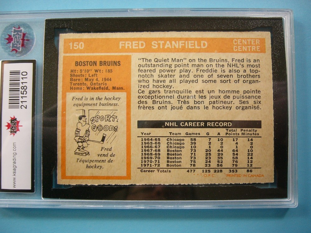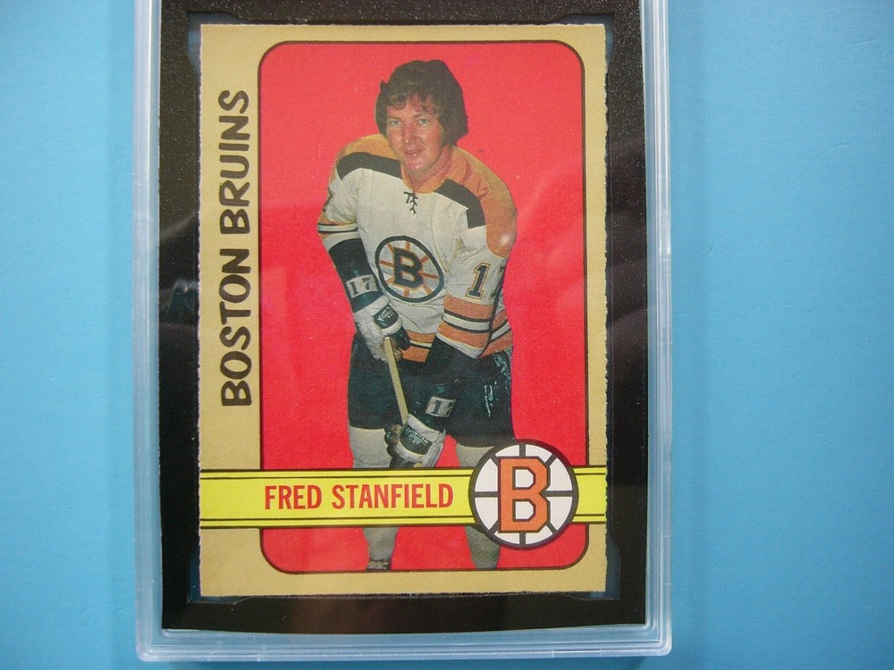 YOU ARE BIDDING ON A 1972/73 O-PEE-CHEE NHL HOCKEY CARD #150 FRED STANFIELD, BOSTON BRUINS. CARD IS GRADED 10 BY KSA IN GEM MINT CONDITION. SEE SCANS FOR FURTHER CONDITION. GREAT COLOUR & GLOSS--A SUPER SHARP, CLEAN & ATTRACTIVE CARD FROM THIS VALUABLE O-PEE-CHEE HOCKEY SET!!! THANK YOU FOR LOOKING AND GOOD LUCK!!! -------------------------------------------------------------------------------------------------------------------------------- SHIPPING WITH TRACKING AND INSURANCE WITHIN CANADA IS $12.50, TO THE UNITED STATES $15.00 AND INTERNATIONALLY $60.00 (EVERYWHERE ELSE). ITEM WILL BE CAREFULLY PACKAGED SO AS NOT TO GET DAMAGED DURING SHIPPING. IF YOU WOULD LIKE EXPEDITED SECURE SHIPPING WITH TRACKING & INSURANCE SHIPPING WITHIN CANADA IS $16.00, TO THE UNITED STATES IS $25.00 AND EVERYWHERE ELSE $50.00. I DO COMBINE SHIPPING ON MULTIPLE PURCHASES--ONLY 50 CENTS PER ADDITIONAL GRADED CARD OR ONLY 20 CENTS MORE PER ADDITIONAL SINGLE UNGRADED PHOTO OR CARD. TAKE A LOOK AT MY OTHER AUCTIONS AND SAVE ON SHIPPING!!!