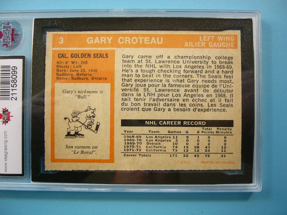 YOU ARE BIDDING ON A 1972/73 O-PEE-CHEE NHL HOCKEY CARD #3 GARY CROTEAU, CALIFORNIA GOLDEN SEALS. CARD IS GRADED 10 BY KSA IN GEM MINT CONDITION. SEE SCANS FOR FURTHER CONDITION. GREAT COLOUR & GLOSS--A SUPER SHARP, CLEAN & ATTRACTIVE CARD FROM THIS VALUABLE O-PEE-CHEE HOCKEY SET!!! THANK YOU FOR LOOKING AND GOOD LUCK!!! -------------------------------------------------------------------------------------------------------------------------------- SHIPPING WITH TRACKING AND INSURANCE WITHIN CANADA IS $12.50, TO THE UNITED STATES $15.00 AND INTERNATIONALLY $60.00 (EVERYWHERE ELSE). ITEM WILL BE CAREFULLY PACKAGED SO AS NOT TO GET DAMAGED DURING SHIPPING. IF YOU WOULD LIKE EXPEDITED SECURE SHIPPING WITH TRACKING & INSURANCE SHIPPING WITHIN CANADA IS $16.00, TO THE UNITED STATES IS $25.00 AND EVERYWHERE ELSE $50.00. I DO COMBINE SHIPPING ON MULTIPLE PURCHASES--ONLY 50 CENTS PER ADDITIONAL GRADED CARD OR ONLY 20 CENTS MORE PER ADDITIONAL SINGLE UNGRADED PHOTO OR CARD. TAKE A LOOK AT MY OTHER AUCTIONS AND SAVE ON SHIPPING!!!