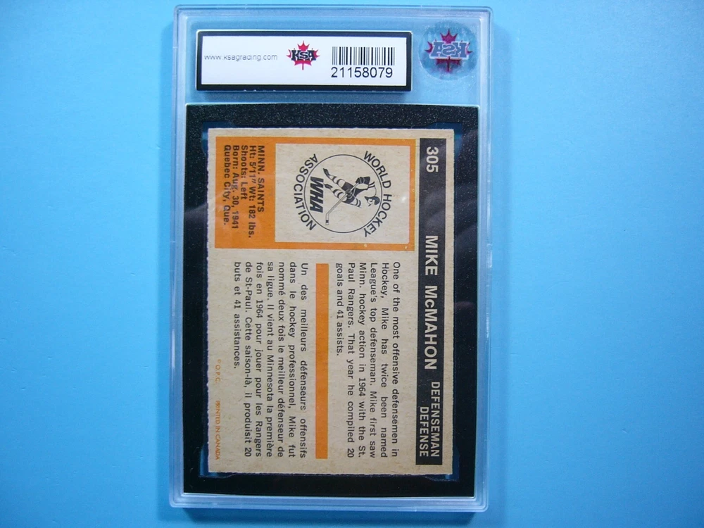 YOU ARE BIDDING ON A RARE THIRD-SERIES 1972/73 O-PEE-CHEE WHA HOCKEY CARD #305 MIKE MCMAHON, MINNESOTA FIGHTING SAINTS. CARD IS GRADED 10 BY KSA IN GEM MINT CONDITION. SEE SCANS FOR FURTHER CONDITION. GREAT COLOUR & GLOSS--A SUPER SHARP, CLEAN & ATTRACTIVE CARD FROM THIS VALUABLE O-PEE-CHEE HOCKEY SET!!! THANK YOU FOR LOOKING AND GOOD LUCK!!! -------------------------------------------------------------------------------------------------------------------------------- SHIPPING WITHIN CANADA WITH TRACKING & INSURANCE IS $12.50, TO THE UNITED STATES $15.00 AND INTERNATIONALLY $60.00 (EVERYWHERE ELSE). ITEM WILL BE CAREFULLY PACKAGED SO AS NOT TO GET DAMAGED DURING SHIPPING. WE DO COMBINE SHIPPING ON MULTIPLE PURCHASES--ONLY $1.00 PER ADDITIONAL GRADED CARD OR ONLY 25 CENTS MORE PER ADDITIONAL SINGLE UNGRADED PHOTO OR CARD. TAKE A LOOK AT MY OTHER AUCTIONS AND SAVE ON SHIPPING!!!