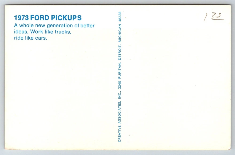 1973 Ford Pickup Advertising Dealer Handout Postcard N17 Thank you for visiting! This is a standard size postcard, 3.5" X 5.5". In stock, usually ships within 24 hours of your purchase. Please ask questions if you are unsure about anything. My goal is for your complete satisfaction with the postcard and your experience. Check all my other listings in my store. RETIREDWITHBOOKS Powered by SixBit's eCommerce Solution
