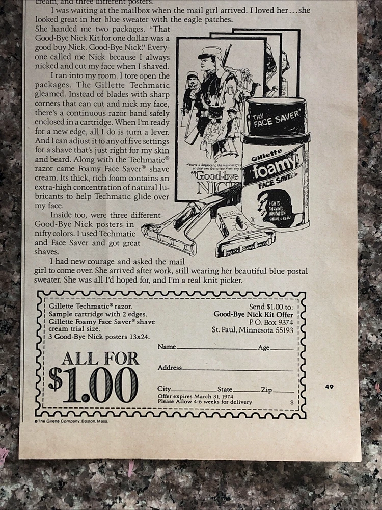 The product is a vintage magazine print ad from 1973 for the Gillette Goodbye Nick Shaving Kit, featuring a razor, blades and cream. The ad is approximately 5"x11" in black and white, showcasing Gillette's shaving products. It was created in the United States and is an original piece from the 1970s.