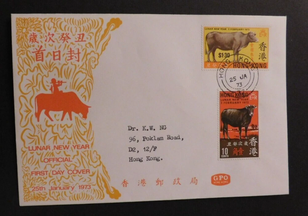 1973 Lunar New Year Official FDC First Day Cover Hong Kong Local Use Year of Ox