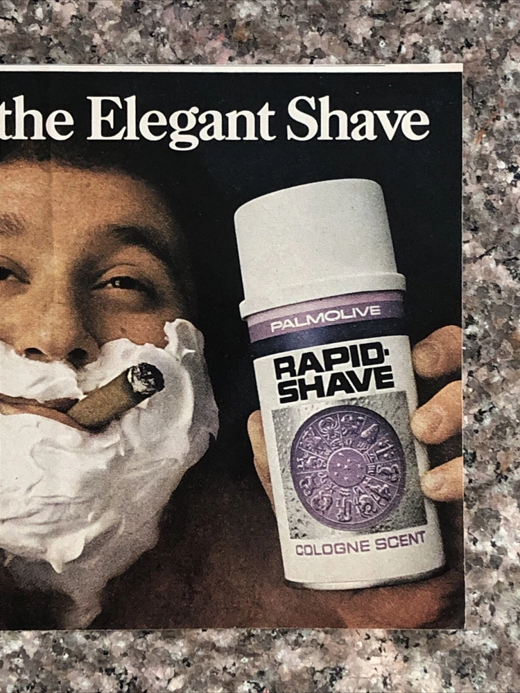 The product is a vintage magazine print ad for Palmolive Rapid-Shave Shaving Cream from 1973. The ad features a Cologne Scent and an elegant design typical of the 70s. The approximate size is 5"x8" and it was made in the United States. The theme of the ad is centered around shaving and razors.