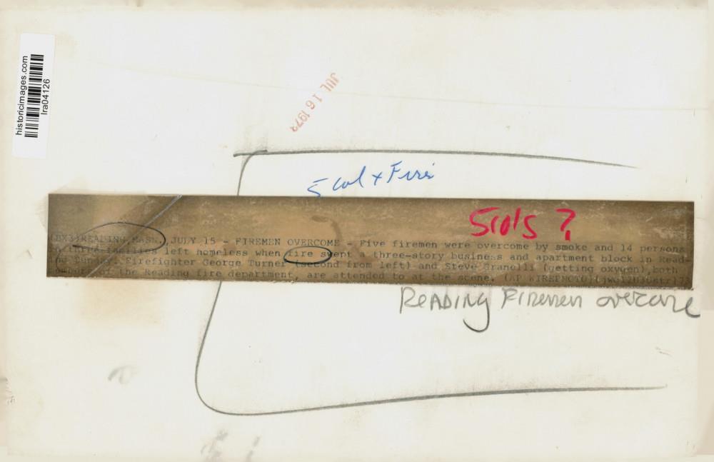 ebay template Note: Please study the images carefully to determine the condition of this vintage photograph, as it may not be in perfect condition. It may contain wrinkles, cracks, and possibly even tears due to its age and how it was handled before it got to us. A scanner may interpret colors and contrast differently than human eyes will, so it is possible that the actual photograph may be slightly darker or lighter in person. This vintage photograph is offered for sale as a collectible item and conveys no transfer of copyright. 1973 Press Photo Firemen overcome by smoke at a business block in Reading This is an original press photo. Reading, Massachusetts - Five firemen were overcome by smoke and 14 persons and their families left homeless when fire swept a three-story business and apartment block in Reading, Massachusetts Sunday. Firefighter George Turner (second from left) and Steve Granelli (getting oxygen), both ... of the Reading Fire Department, are attended to at the scene.Photo measures 10 x 6.5inches. Photo is dated 7-15-1973. PHOTO FRONT PHOTO BACK Historic Images Part Number: lra04126 Sell Smarter with Kyozou. Inventory and Ecommerce Management