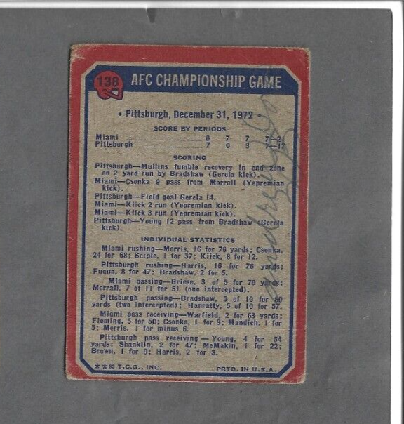 This is a 1973 Topps sports trading card featuring the AFC Championship game between the Miami Dolphins and the Pittsburgh Steelers. The card number is #138 and it is part of the 1973 set. It is a football trading card manufactured by Topps for the 1973 season. The card is in poor condition.