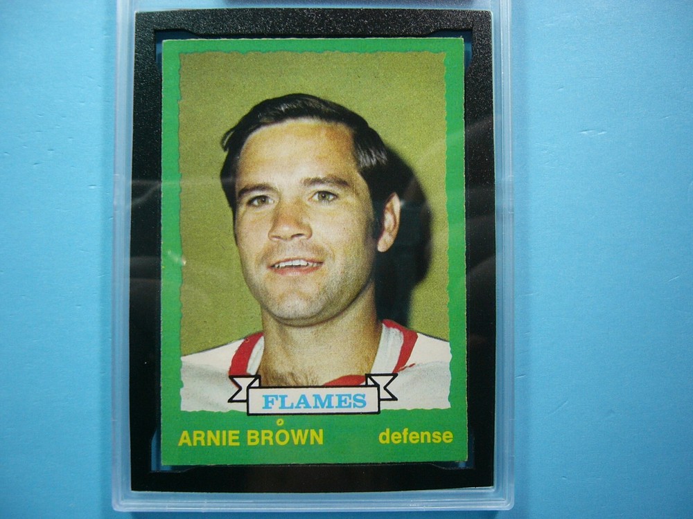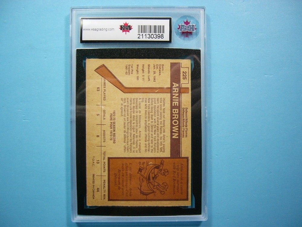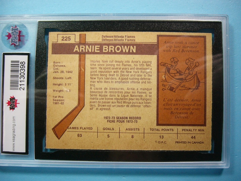 YOU ARE BIDDING ON A 1973/74 O-PEE-CHEE NHL HOCKEY CARD #225 ARNIE BROWN, ATLANTA FLAMES. CARD IS GRADED 10 BY KSA IN GEM MINT CONDITION. GREAT COLOUR & GLOSS--A VERY SHARP, CLEAN & ATTRACTIVE CARD FROM THIS VALUABLE O-PEE-CHEE HOCKEY SET!!! THANK YOU FOR LOOKING AND GOOD LUCK!!! -------------------------------------------------------------------------------------------------------------------------------- SHIPPING WITHIN CANADA IS $4.99. SHIPPING TO THE UNITED STATES IS $8.99 AND INCLUDES TRACKING & INSURANCE. SHIPPING INTERNATIONALLY (ANYWHERE ELSE) IS $25.00 AND INCLUDES TRACKING & INSURANCE. ITEM WILL BE CAREFULLY PACKAGED SO AS NOT TO GET DAMAGED DURING SHIPPING. IF YOU ARE IN CANADA AND WOULD LIKE SHIPPING WITH TRACKING & INSURANCE INCLUDED COST IS $12.99. PLEASE CONTACT US BEFORE PAYMENT IS MADE TO ADJUST THE INVOICE ACCORDINGLY. WE DO COMBINE SHIPPING ON MULTIPLE PURCHASES--ONLY $1.00 MORE FOR EACH ADDITIONAL SINGLE GRADED CARD OR ONLY 25 CENTS MORE FOR EACH ADDITIONAL SINGLE UNGRADED CARD. TAKE A LOOK AT OUR OTHER AUCTIONS AND SAVE ON SHIPPING!!!