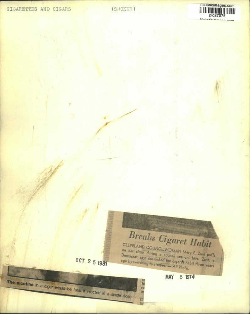 ebay template Note: Please study the images carefully to determine the condition of this vintage photograph, as it may not be in perfect condition. It may contain wrinkles, cracks, and possibly even tears due to its age and how it was handled before it got to us. A scanner may interpret colors and contrast differently than human eyes will, so it is possible that the actual photograph may be slightly darker or lighter in person. This vintage photograph is offered for sale as a collectible item and conveys no transfer of copyright. 1974 Press Photo Councilwoman Mary Zunt smokes during council session in Ohio This is an original press photo. Cigarettes & Cigars (Smoker). Cleveland, Ohio. Cleveland Councilwoman Mary E. Zunt puffs on her cigar during this week's council session. Mrs. Zunt, a Democrat, says she kicked the cigarette habit three years ago by switching to stogies. Photo measures 8 x 10.25inches. Photo is dated 4-24-1974. PHOTO FRONT PHOTO BACK Historic Images Part Number: pio27075 FAQs Q: Can I just download a digital version instead? A: No, we sell only vintage originals and do not make or distribute any copies, including digital ones. Q: Do you combine shipping and invoices? A: Multiple photos won on the same seller ID combine automatically through the eBay checkout process. If you encounter problems with this, send us a message via eBay messaging and we will send you an invoice. Due to eBay limitations, we cannot combine items won on our different seller IDs for a single shipping charge. Q: How quickly do you ship the items once paid? A: We ship within one business day after your payment clears. If you do not receive an "order shipped" email from us by the close of the second business day from submitting payment, please e-mail us via eBay messaging. Q: How do you make sure my photograph arrives safely? A: We package each order between two cross-corrugated pieces of cardboard to ensure that the package is as difficult to bend as possible. We then wrap each order in a plastic sheet to help protect against moisture. We want you to rest assured that we take every precaution to ensure that the photograph you receive will be in the same condition in your care as it was in ours. Q: Will the "Historic Images" watermark be on my photo when I receive it? A: No. This is a digital watermark we use to protect our images. It is not printed on the photo. Q: What are your office hours? A: eBay for us is a business, and a very fun one to be in! We are open M-F 9 to 5 (CST). Therefore, we do not return e-mails and phone calls over the weekend. We observe the following holidays: New Years Day, Memorial Day, Fourth of July, Labor Day, Thanksgiving and the day after Thanksgiving, Christmas Eve and Christmas Day. Q: Where did all these vintage photos come from? A: These original vintage photographs are from various news service and newspaper photo archives from locations around the country including: Boston, Detroit, Tampa, Chicago, Denver, Seattle, New Orleans, Milwaukee, Portland, Spokane, and more. We do not copy or reproduce any photographs -- every item is a unique vintage piece that was housed in a news archive. Q: Can I use this photograph in my book/blog/website? A: The short answer is no. There is no transfer of copyright for republication or reproduction with these photographs when you purchase them, and only photographs taken before 1923 are currently automatically in the public domain. Permission from the copyright holder, which usually can be identified from the back of each photo, must be sought to republish or reproduce the image for any purpose. Q: Do you relist items (in case I miss an auction ending)? A: Auction items that receive no bids are relisted in our store (historicimages-store on eBay) as a fixed-price item and at a higher price than the starting auction price. Q: Do you leave feedback? A: Yes, we always leave feedback for buyers. Our software monitors when our buyers leave us feedback, then notifies us that we can leave feedback for the buyer. Rest assured, if you leave feedback, we will do the same! Check out our family of eBay IDs: historicimages01 Sports Photos historicimages02 Entertainment Photos historicimages03 Americana Photos historicimages04 International & War Photos historicimages05 Transportation Photos historicimages06 Photos of All Subjects historicimages07 Entertainment Photos historicimages08 Newsworthy Photos historicimages09 Entertainment Photos historicimages10 Sports Photos historicimages-store Our largest fixed-price selection historicimages-gallery Hand-picked photos Saturday night auctions About Us Historic Images was formed in September 2009, with a handful of scanners working out of a basement to digitize newspaper photo archives. We have since moved out of the basement, and we can now archive thousands of photos per day. Our company has worked with magazines and newspapers from Detroit, Boston, Denver, Seattle, Tampa, Chicago, and New Orleans, just to name a few. We are constantly adding to our inventory, and have assembled an archive of millions of photos to date. As our company evolved, we began our eBay business, which brings thousands of fresh auctions per week to the world's largest online auction marketplace. Our custom software systems and team of great employees allow us to efficiently scan and sell large photo archives online. At the very core of our company's DNA is a strong commitment to customer satisfaction and strict integrity for our product. Our promise to you is that we will do everything in our power to provide you a great buying experience. Copyright 2009 - Present, Historic Images, Inc. Sell Smarter with Kyozou. Inventory and Ecommerce Management