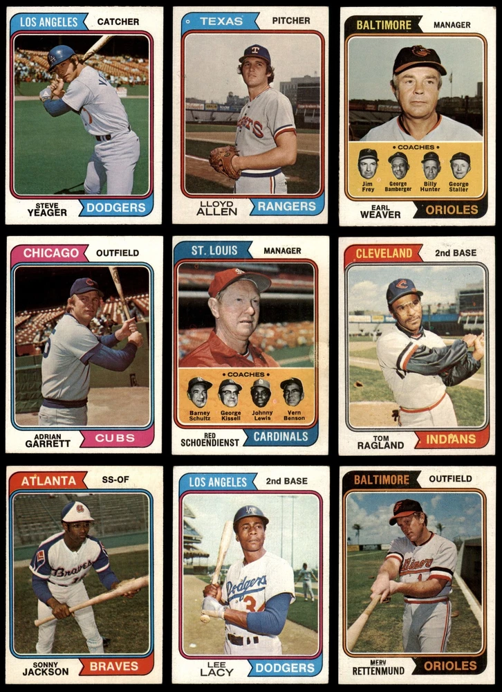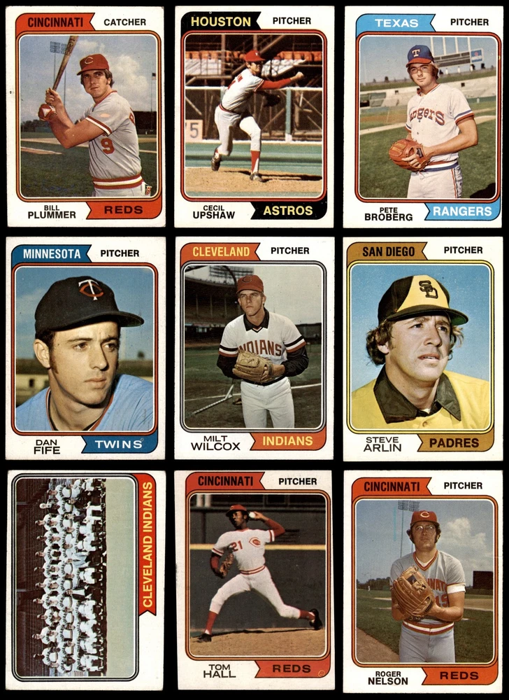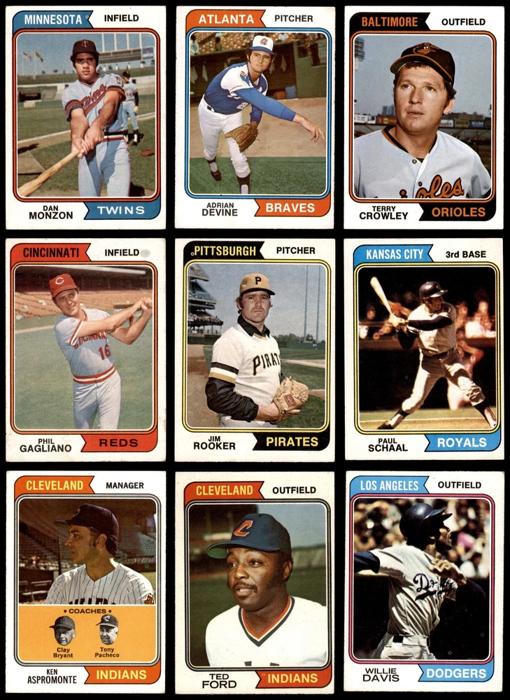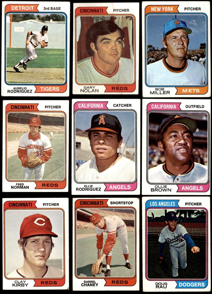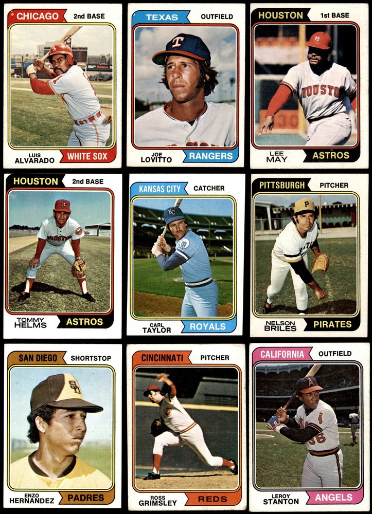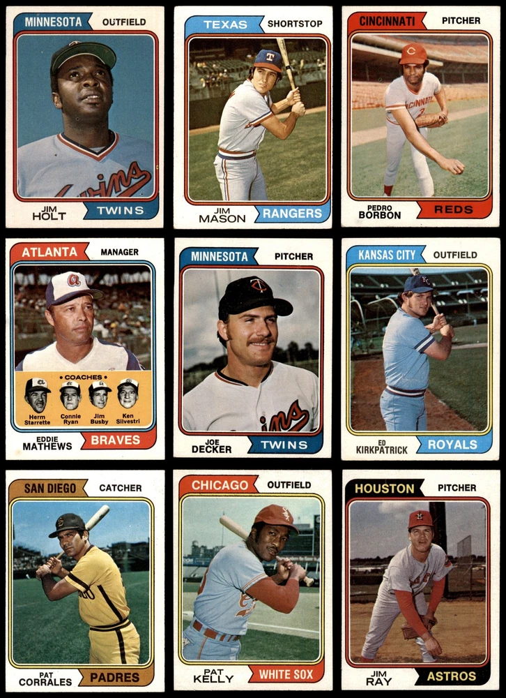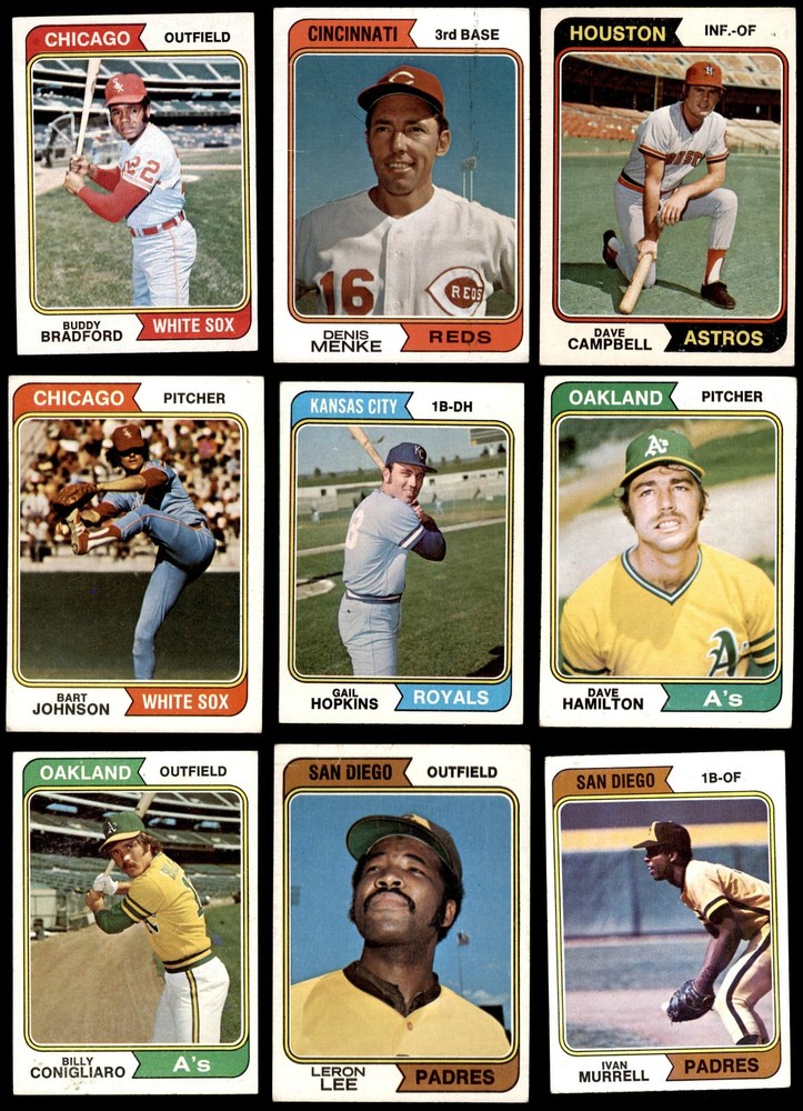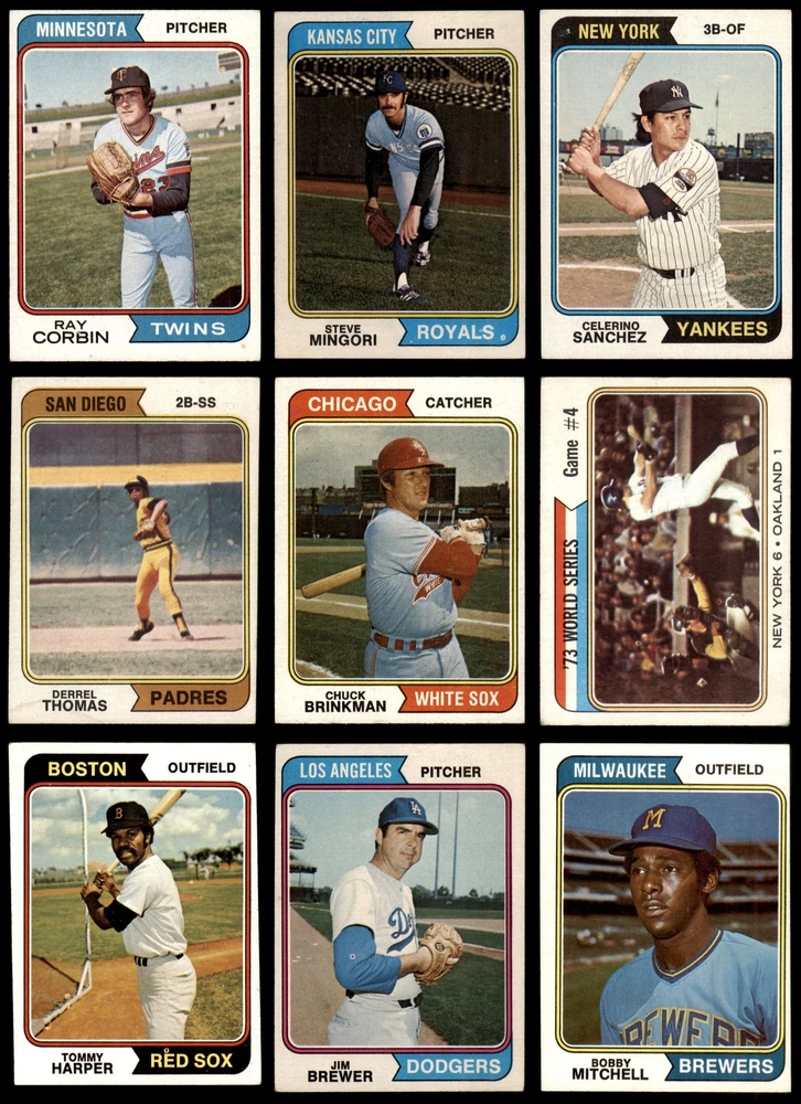 This set contains the following cards 1974 Topps #15 Joe Torre 5 - EX Front Back 1974 Topps #29 Phil Niekro 2 - GOOD Front Back 1974 Topps #46 Pat Kelly 4 - VG/EX Front Back 1974 Topps #59 Ross Grimsley 2 - GOOD Front Back 1974 Topps #64 Doug Rau 2 - GOOD Front Back 1974 Topps #67 Tommy Helms 3 - VG Front Back 1974 Topps #72 Aurelio Rodriguez 2 - GOOD Front Back 1974 Topps #74 Twins Team 6 - EX/MT Front Back 1974 Topps #86 Joe Ferguson 4 - VG/EX Front Back 1974 Topps #87 Fergie Jenkins 3 - VG Front Back 1974 Topps #89 Jackie Brown 4 - VG/EX Front Back 1974 Topps #98 Bert Blyleven 4 - VG/EX Front Back 1974 Topps #122 Jim Holt 4 - VG/EX Front Back 1974 Topps #123 Nelson Briles 3 - VG Front Back 1974 Topps #128 John Ellis 4 - VG/EX Front Back 1974 Topps #134 Denis Menke 2 - GOOD Front Back 1974 Topps #147 Bart Johnson 3 - VG Front Back 1974 Topps #165 Willie Davis 3 - VG Front Back 1974 Topps #189 Jim Brewer 3 - VG Front Back 1974 Topps #208 - John Hiller / Mike Marshall Leading Firemen 2 - GOOD Front Back 1974 Topps #215 Al Kaline 3 - VG Front Back 1974 Topps #236 - Red Schoendienst / Vern Benson / George Kissell / Johnny Lewis / Barney Schultz Cardinals Leaders 3 - VG Front Back 1974 Topps #248 Tom Hall 3 - VG Front Back 1974 Topps #262 Ed Kirkpatrick 4 - VG/EX Front Back 1974 Topps #277 Gary Nolan 2 - GOOD Front Back 1974 Topps #287 Clay Kirby 3 - VG Front Back 1974 Topps #296 Ray Corbin 5 - EX Front Back 1974 Topps #306 - Earl Weaver / George Bamberger / Jim Frey / Billy Hunter / George Staller Orioles Leaders 3 - VG Front Back 1974 Topps #325 Tommy Harper 4 - VG/EX Front Back 1974 Topps #336 - Pete Rose / Bobby Murcer All-Star Left Fielders 2 - GOOD Front Back 1974 Topps #344 Mike Caldwell 4 - VG/EX Front Back 1974 Topps #357 Buddy Bradford 4 - VG/EX Front Back 1974 Topps #385 Don Gullett 2 - GOOD Front Back 1974 Topps #402 Jim Rooker 4 - VG/EX Front Back 1974 Topps #405 Ellie Rodriguez 4 - VG/EX Front Back 1974 Topps #406 Steve Arlin 4 - VG/EX Front Back 1974 Topps #410 Pedro Borbon 3 - VG Front Back 1974 Topps #421 Dan Fife 4 - VG/EX Front Back 1974 Topps #425 Pete Broberg 4 - VG/EX Front Back 1974 Topps #427 Bobby Bolin 5 - EX Front Back 1974 Topps #440 Jim Kaat 2 - GOOD Front Back 1974 Topps #441 Tom Ragland 4 - VG/EX Front Back 1974 Topps #458 Jim Ray 4 - VG/EX Front Back 1974 Topps #459 Reds Team 3 - VG Front Back 1974 Topps #462 Luis Alvarado 3 - VG Front Back 1974 Topps #466 Dick Billings 5 - EX Front Back 1974 Topps #469 Joe Decker 4 - VG/EX Front Back 1974 Topps #472 - Darold Knowles 1973 World Series - Game #1 4 - VG/EX Front Back 1974 Topps #474 - Felix Millan / Bert Campaneris 1973 World Series - Game #3 3 - VG Front Back 1974 Topps #475 - Ray Fosse / Rusty Staub 1973 World Series - Game #4 3 - VG Front Back 1974 Topps #491 Roger Nelson 3 - VG Front Back 1974 Topps #497 Bobby Mitchell 4 - VG/EX Front Back 1974 Topps #498 Pat Corrales 4 - VG/EX Front Back 1974 Topps #500 Lee May 3 - VG Front Back 1974 Topps #506 Ed Farmer 6 - EX/MT Front Back 1974 Topps #514 Paul Schaal 4 - VG/EX Front Back 1974 Topps #516 Horacio Pina 1.5 - FAIR Front Back 1974 Topps #518 Derrel Thomas 4 - VG/EX Front Back 1974 Topps #521 - Ken Aspromonte / Clay Bryant / Tony Pacheco Indians Leaders 4 - VG/EX Front Back 1974 Topps #524 Bill Plummer 3 - VG Front Back 1974 Topps #537 Steve Mingori 4 - VG/EX Front Back 1974 Topps #539 Lloyd Allen 4 - VG/EX Front Back 1974 Topps #541 Indians Team 3 - VG Front Back 1974 Topps #542 Goose Gossage 3 - VG Front Back 1974 Topps #545 Billy Conigliaro 3 - VG Front Back 1974 Topps #546 Mike Corkins 4 - VG/EX Front Back 1974 Topps #549 Mike Jorgensen 4 - VG/EX Front Back 1974 Topps #554 Tim Johnson 5 - EX Front Back 1974 Topps #556 Dave Campbell 3 - VG Front Back 1974 Topps #557 Jim McGlothlin 4 - VG/EX Front Back 1974 Topps #559 Darrel Chaney 2 - GOOD Front Back 1974 Topps #565 Milt Wilcox 5 - EX Front Back 1974 Topps #572 Enzo Hernandez 2 - GOOD Front Back 1974 Topps #574 Bill Parsons 4 - VG/EX Front Back 1974 Topps #579 Cecil Upshaw 4 - VG/EX Front Back 1974 Topps #581 Fred Norman 2 - GOOD Front Back 1974 Topps #585 Merv Rettenmund 4 - VG/EX Front Back 1974 Topps #591 Sonny Jackson 4 - VG/EX Front Back 1974 Topps #593 Steve Yeager 3 - VG Front Back 1974 Topps #594 Leroy Stanton 3 - VG Front Back 1974 Topps #613 Dan Monzon 4 - VG/EX Front Back 1974 Topps #614 Adrian Devine 4 - VG/EX Front Back 1974 Topps #617 Ted Ford 4 - VG/EX Front Back 1974 Topps #618 Jim Mason 3 - VG Front Back 1974 Topps #622 Phil Gagliano 3 - VG Front Back 1974 Topps #623 Celerino Sanchez 5 - EX Front Back 1974 Topps #624 Bob Miller 2 - GOOD Front Back 1974 Topps #625 Ollie Brown 4 - VG/EX Front Back 1974 Topps #627 Carl Taylor 4 - VG/EX Front Back 1974 Topps #628 Ivan Murrell 3 - VG Front Back 1974 Topps #633 Dave Hamilton 3 - VG Front Back 1974 Topps #634 - Eddie Mathews / Jim Busby / Connie Ryan / Ken Silvestri / Herm Starrette Braves Leaders 3 - VG Front Back 1974 Topps #639 Joe Lovitto 3 - VG Front Back 1974 Topps #641 Chuck Brinkman 5 - EX Front Back 1974 Topps #644 Wayne Granger 4 - VG/EX Front Back 1974 Topps #648 Terry Crowley 5 - EX Front Back 1974 Topps #651 Leron Lee 3 - VG Front Back 1974 Topps #652 Gail Hopkins 4 - VG/EX Front Back 1974 Topps #656 Adrian Garrett 5 - EX Front Back 1974 Topps #658 Lee Lacy 4 - VG/EX Front Back This 1974 Topps 100 Card Starter Set / Lot is a great way to start collecting the 1974 Topps Set and contains no duplicate cards. Set breakdown by grade: Number of Cards in Set 100 Average Grade - Weighted by Value 3.55 - VG+ Average Grade - Unweighted 3.52 - VG+ Grade Breakdown 6 - EX/MT 2 5 - EX 10 4 - VG/EX 41 3 - VG 32 2 - GOOD 14 1.5 - FAIR 1 . Dean's Cards offers a 100% Money Back Satisfaction Guarantee on all purchases. Just contact us within 10 days of the purchase date and we will refund your money or, when possible, replace the cards. 1974 Topps 100 Card Starter Set / Lot 3.5 - VG+ 6909638 If the scan in the listing says ACTUAL IMAGE, you will receive